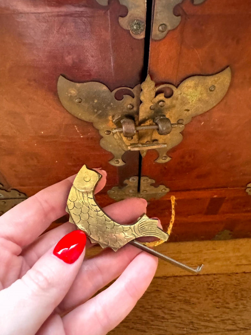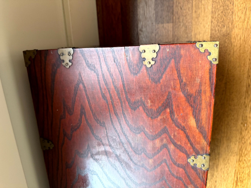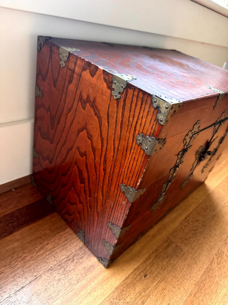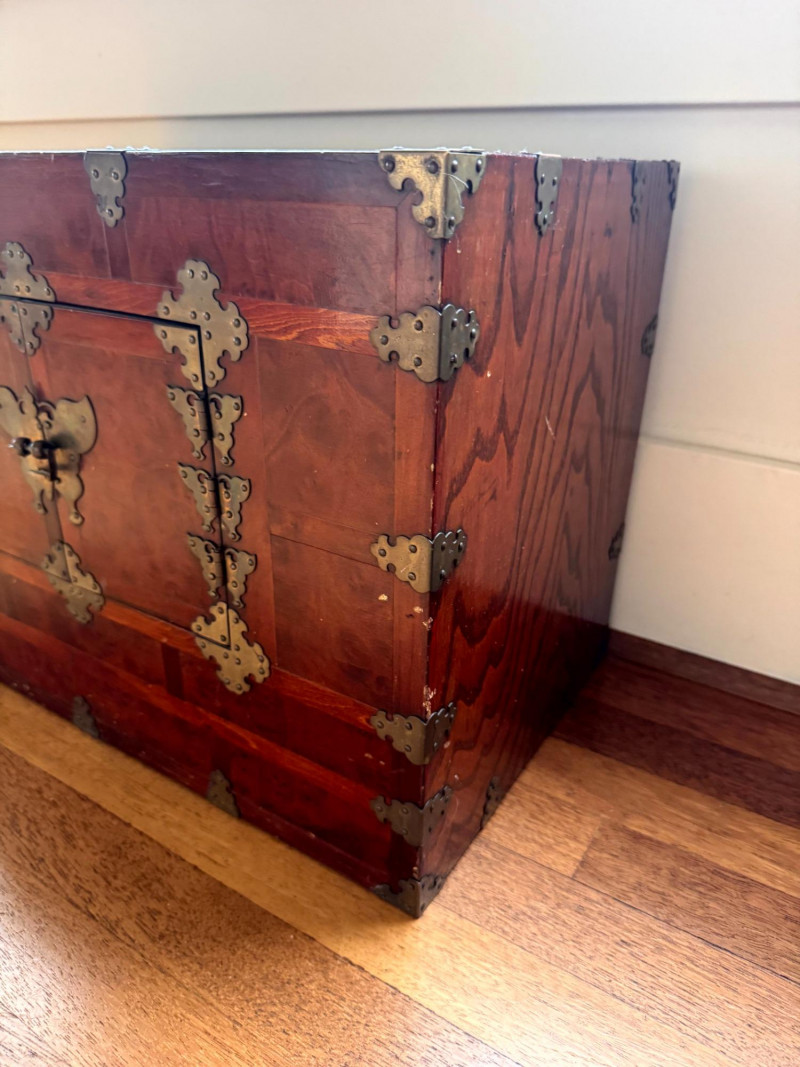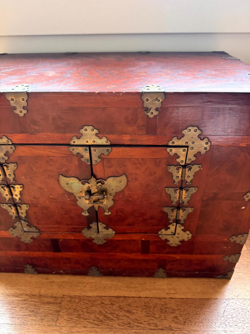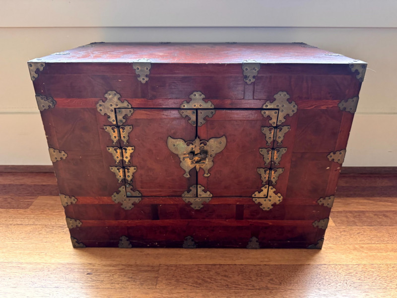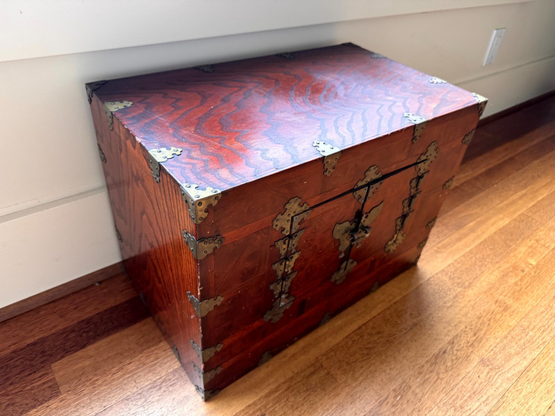 Asian Style Brass-Mounted Bandaji Tansu Storage Chest. Decorative brass mounts, corner hardware, and hinges
