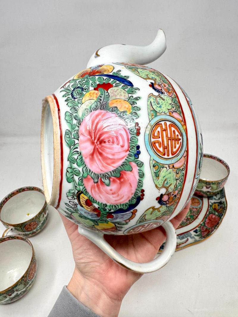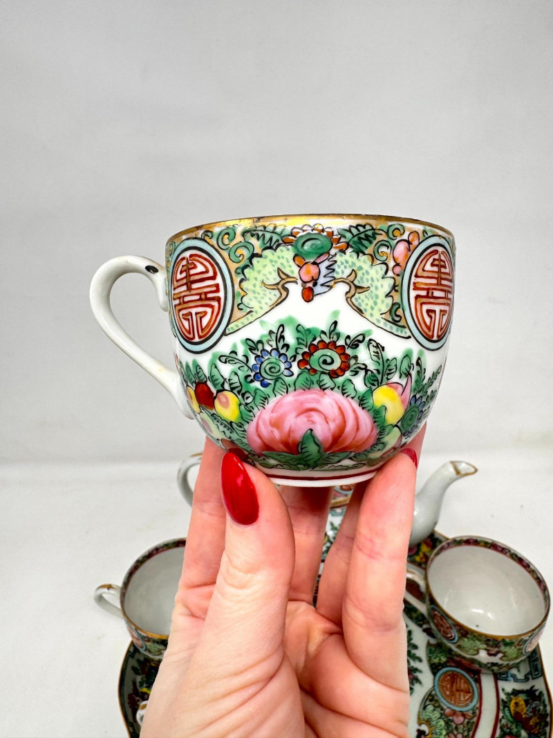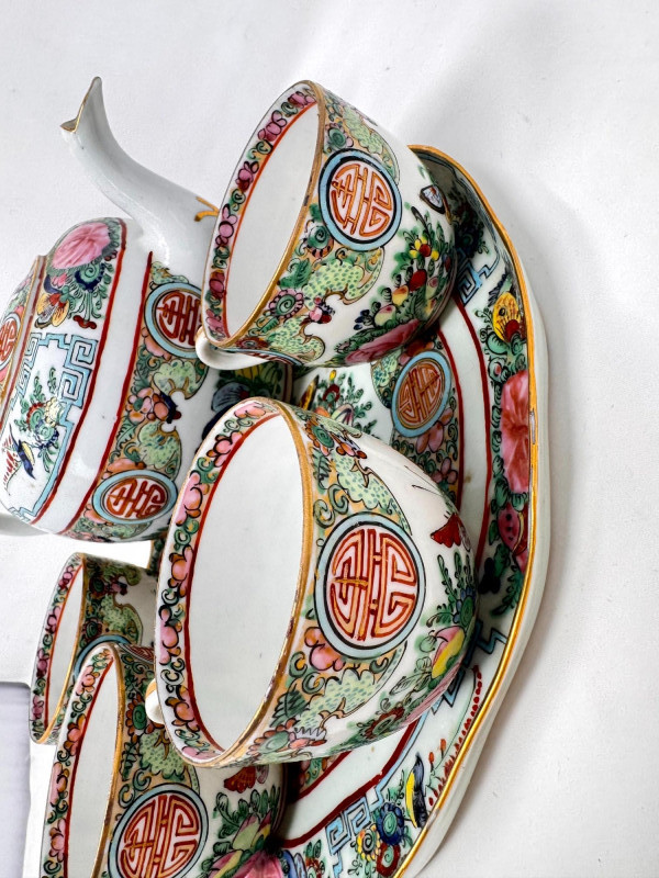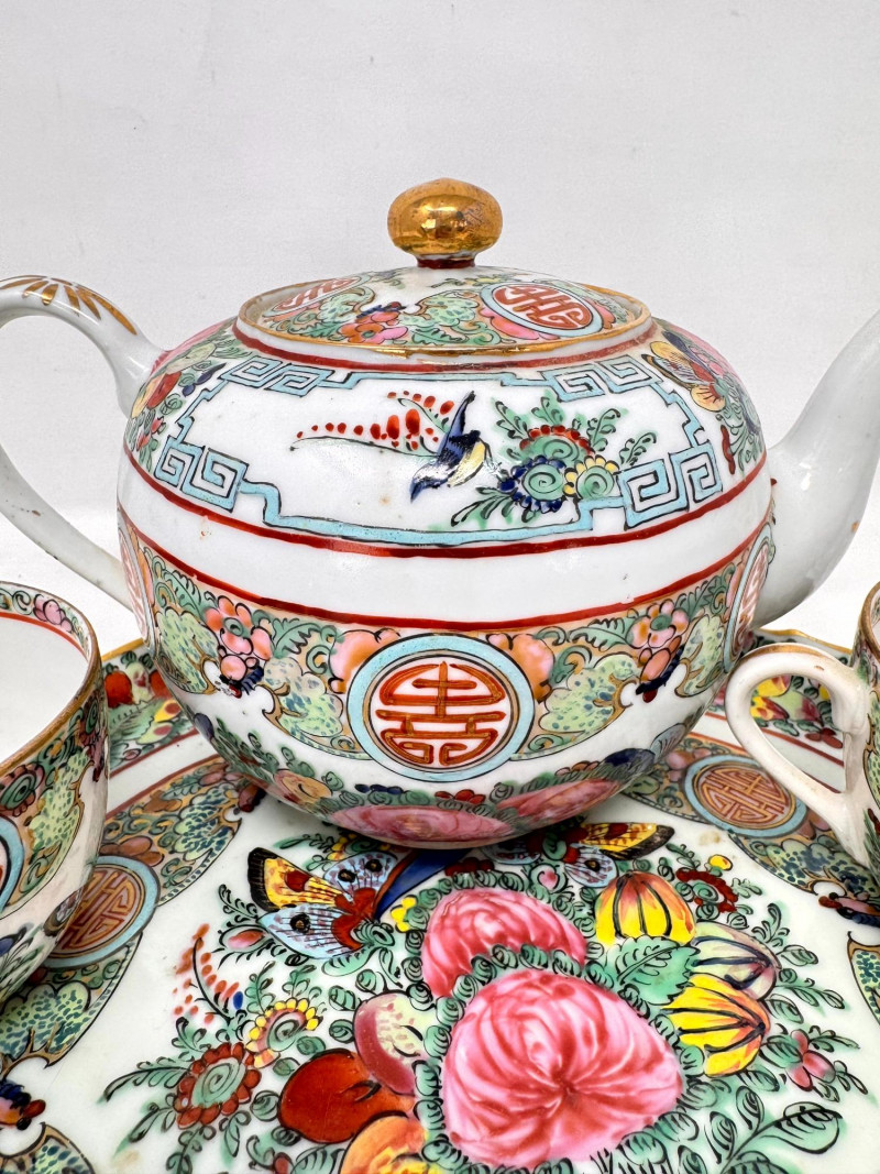 Vintage Chinese Export Porcelain Tea Set: Teapot, Cups & Matching Tray.