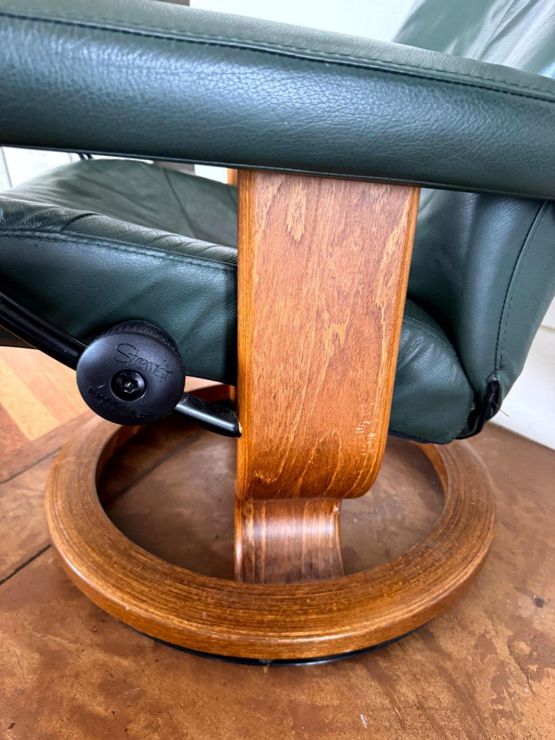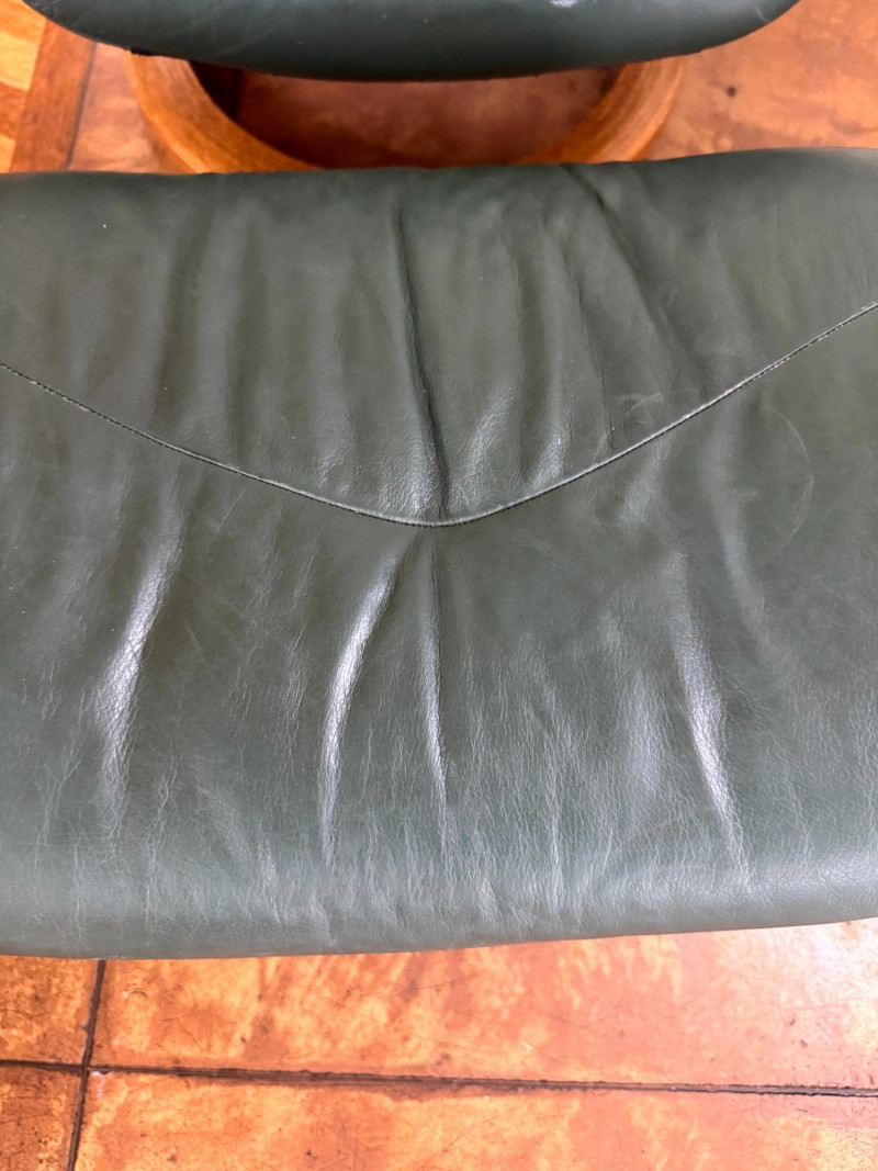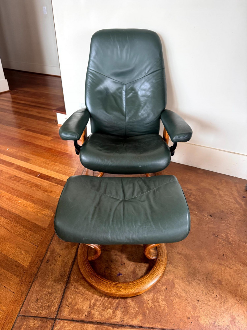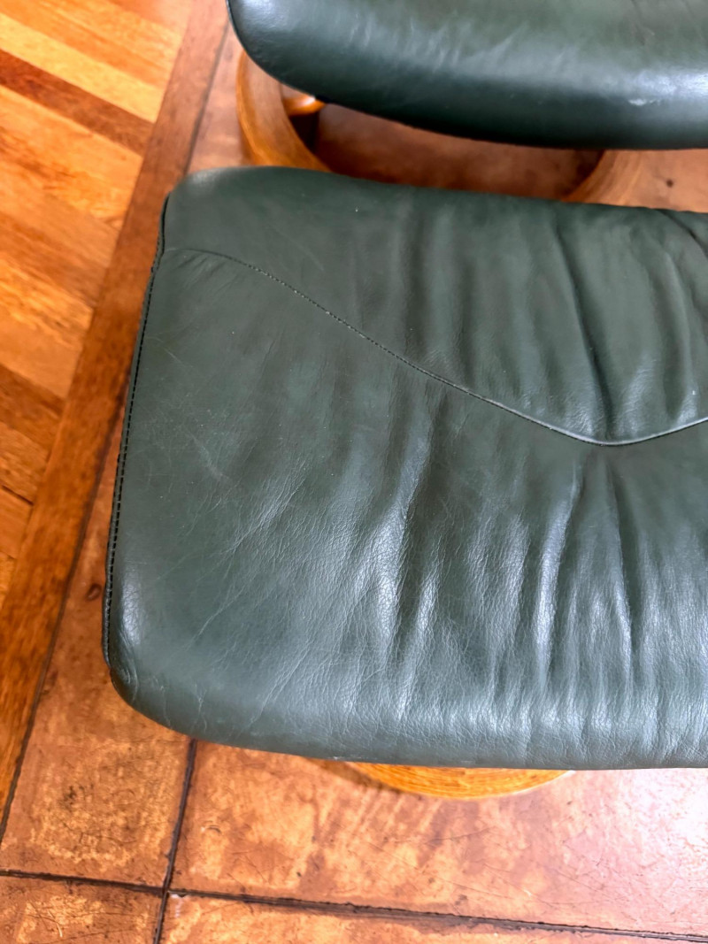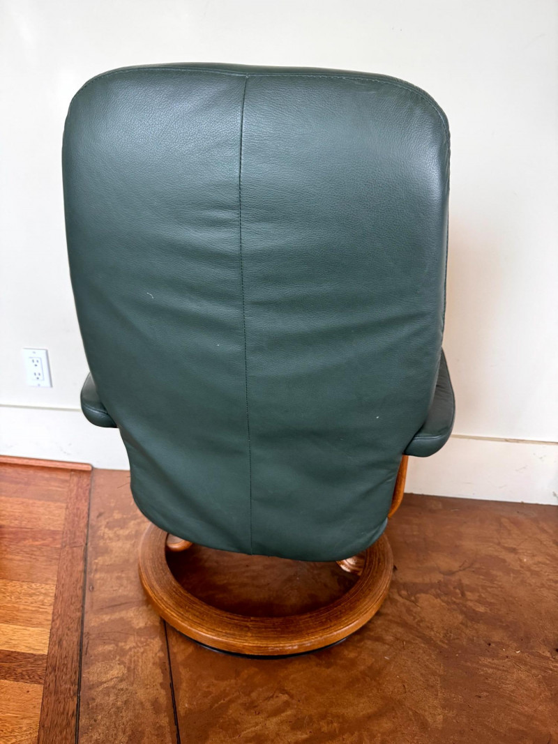 Ekornes Green Leather "Stressless" Chair & Ottoman.