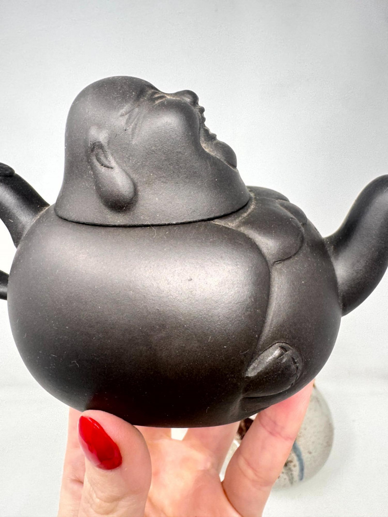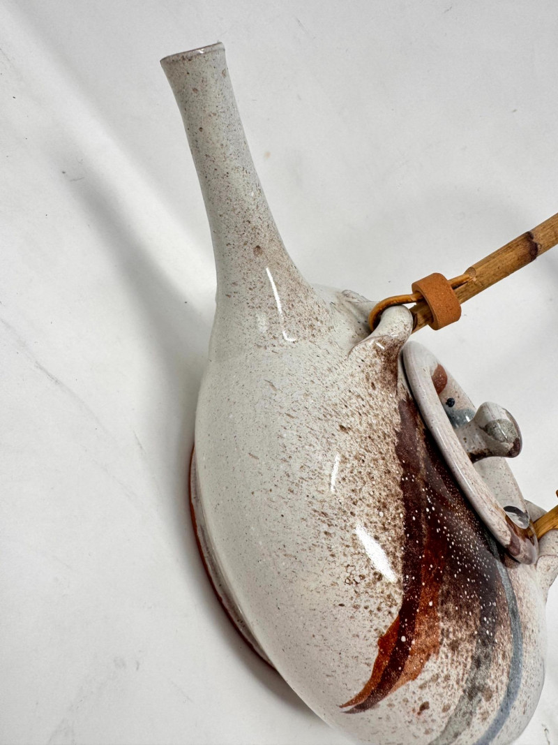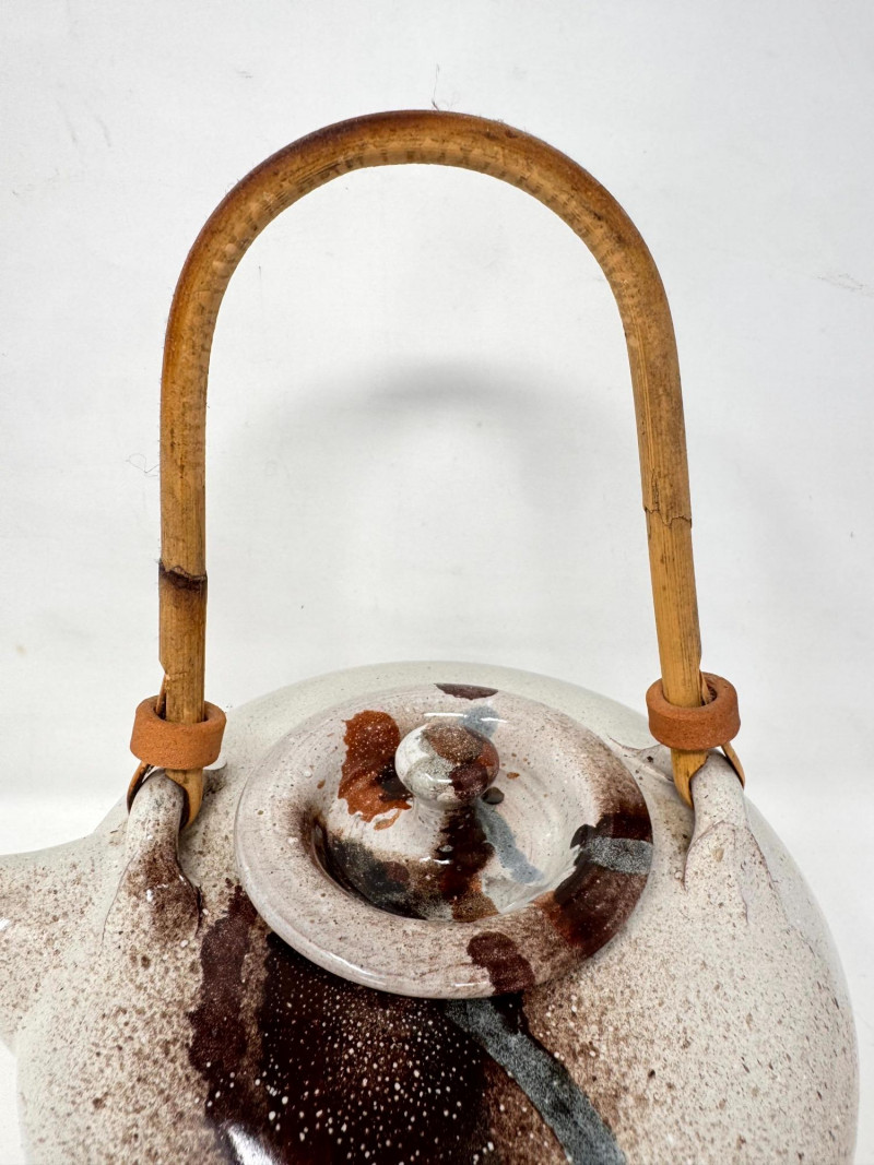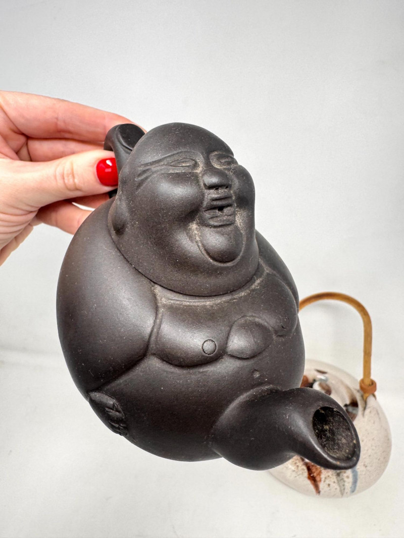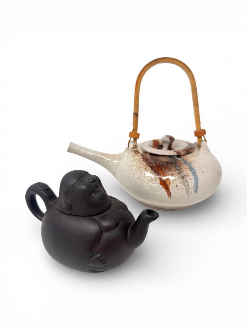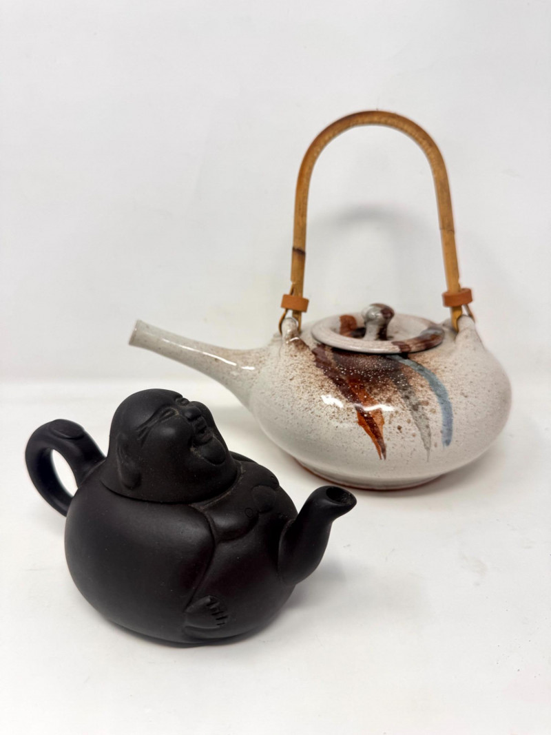 Two Asian Style Teapots Buddha Form & Studio Pottery Bamboo Handle.