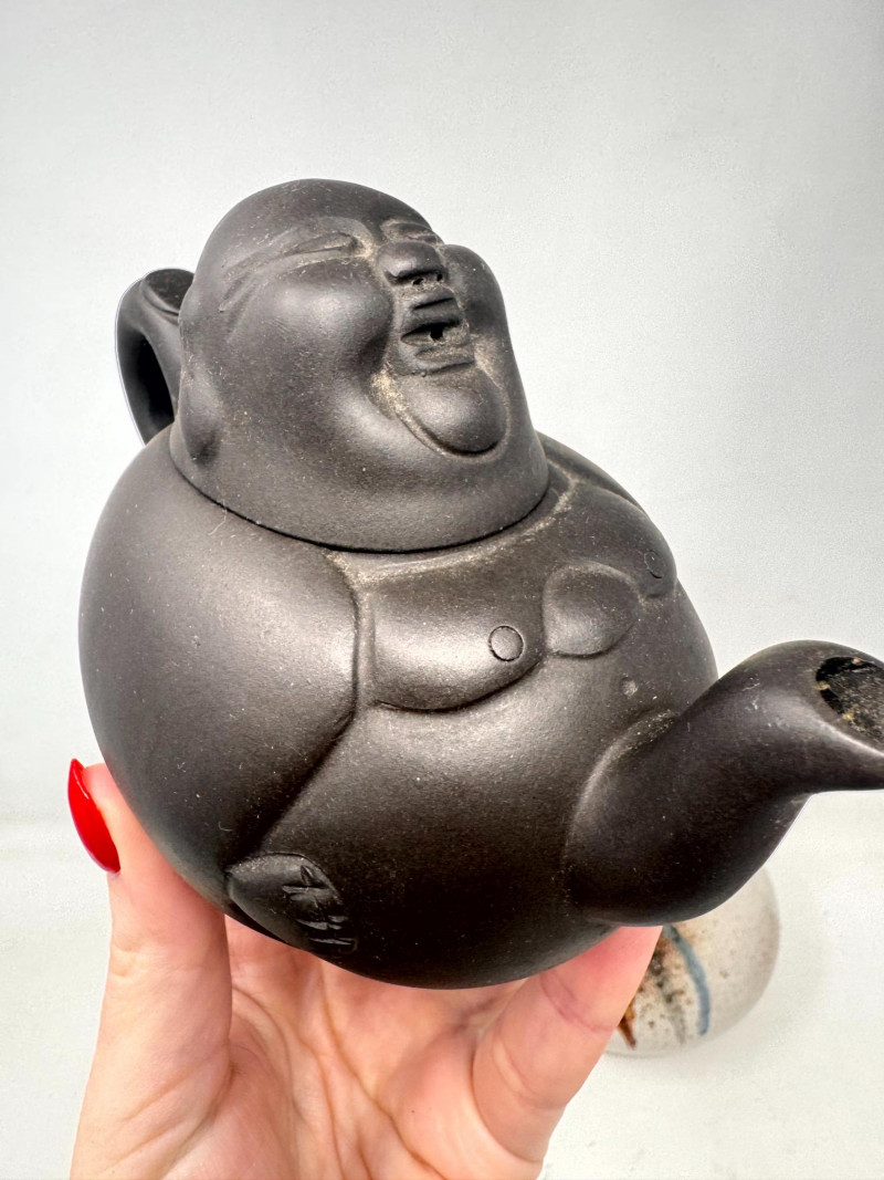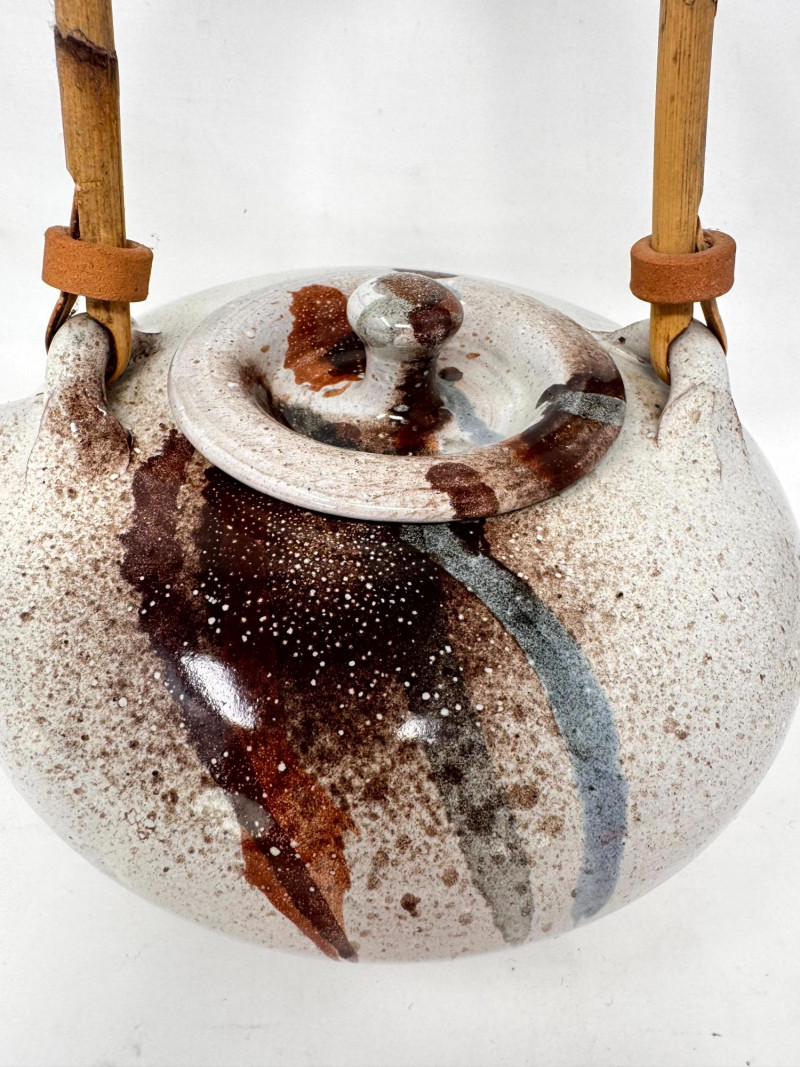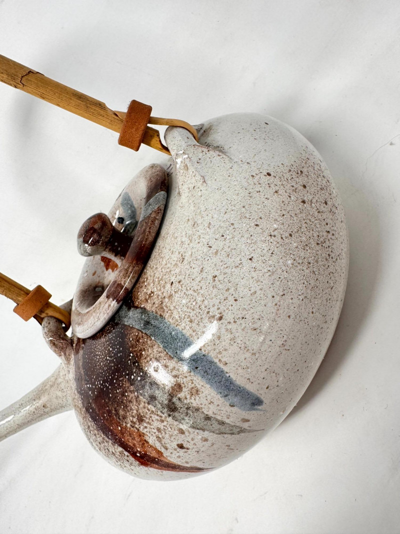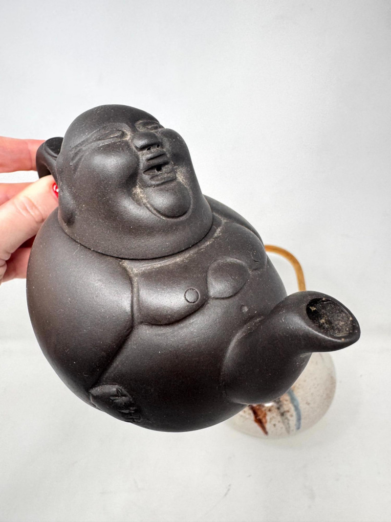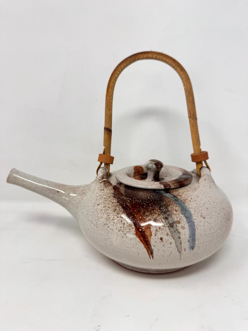 Two Asian Style Teapots Buddha Form & Studio Pottery Bamboo Handle.