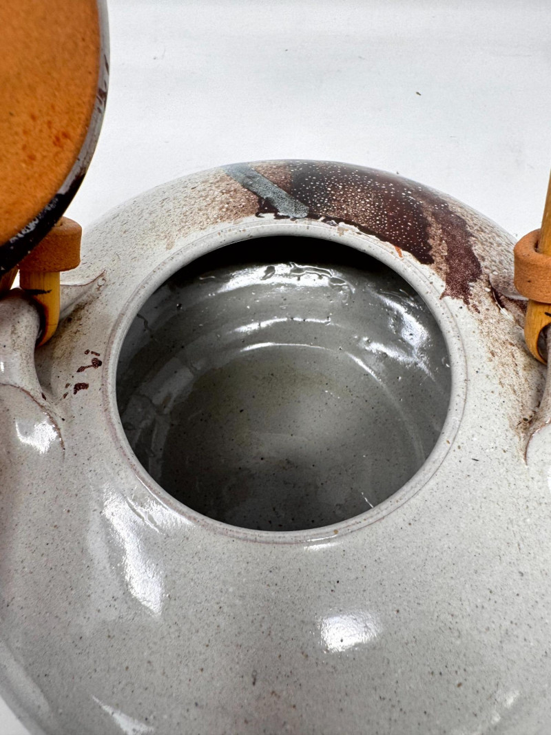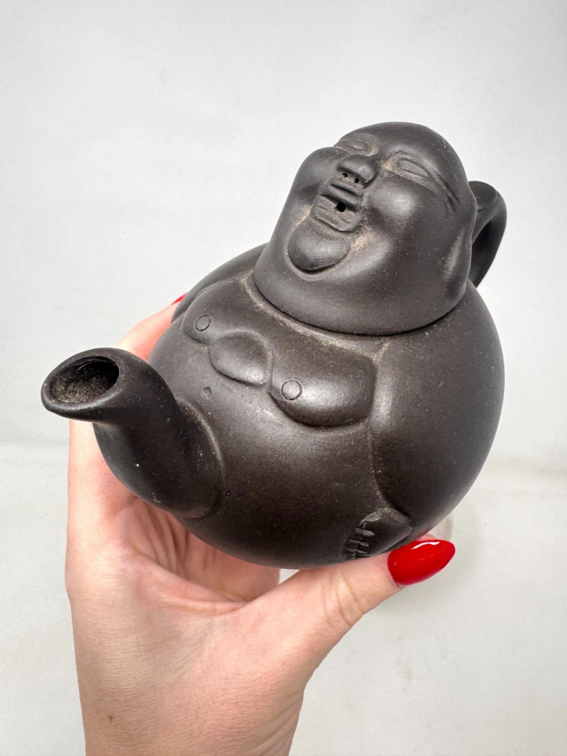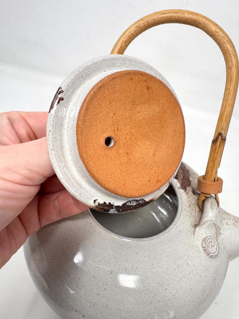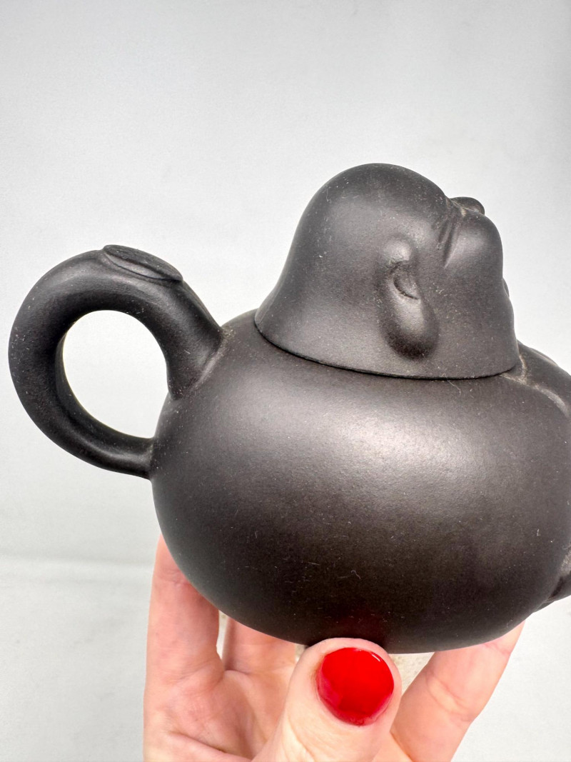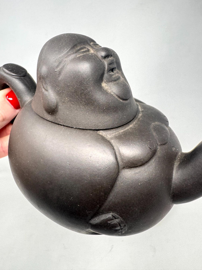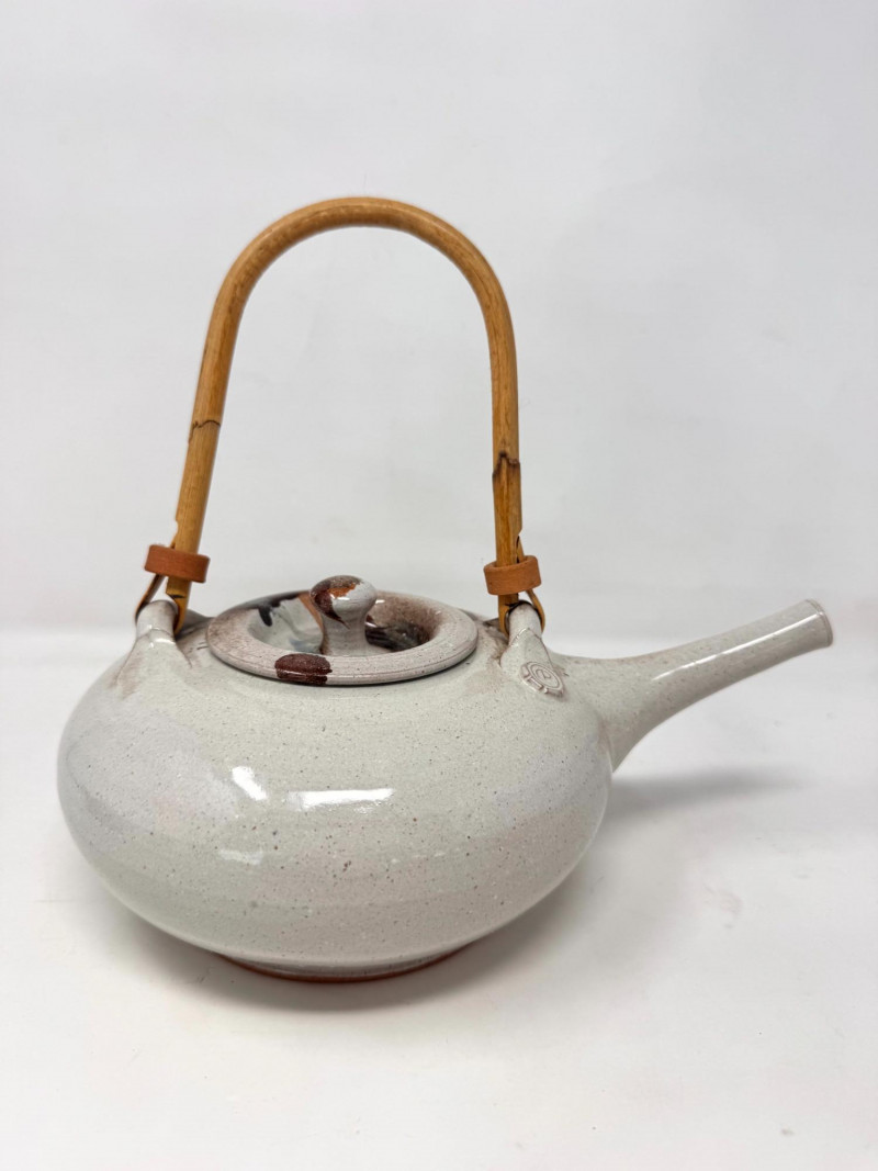 Two Asian Style Teapots Buddha Form & Studio Pottery Bamboo Handle.