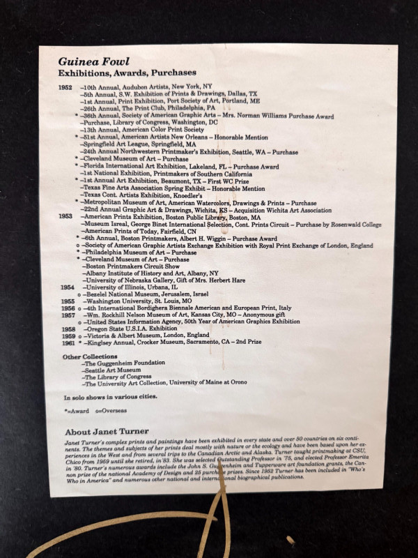 Janet Turner “Guinea Fowl” Signed & Numbered Print, Framed.