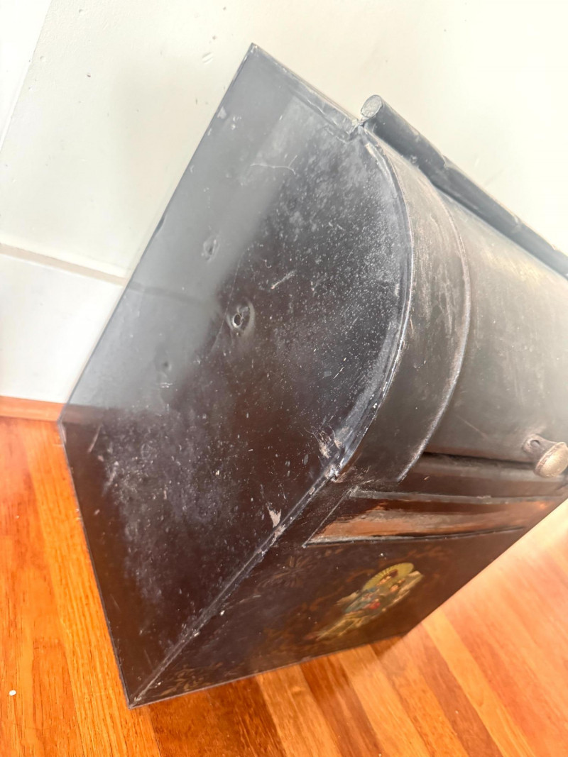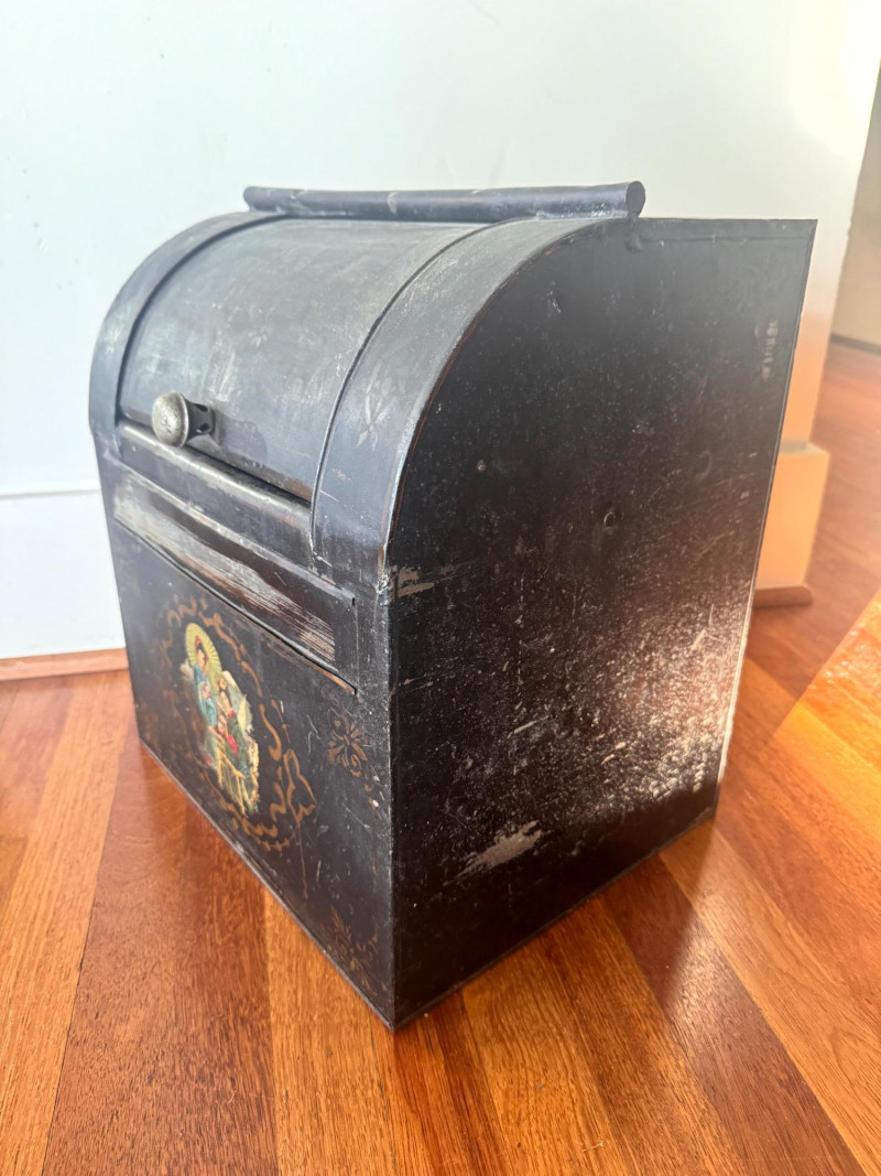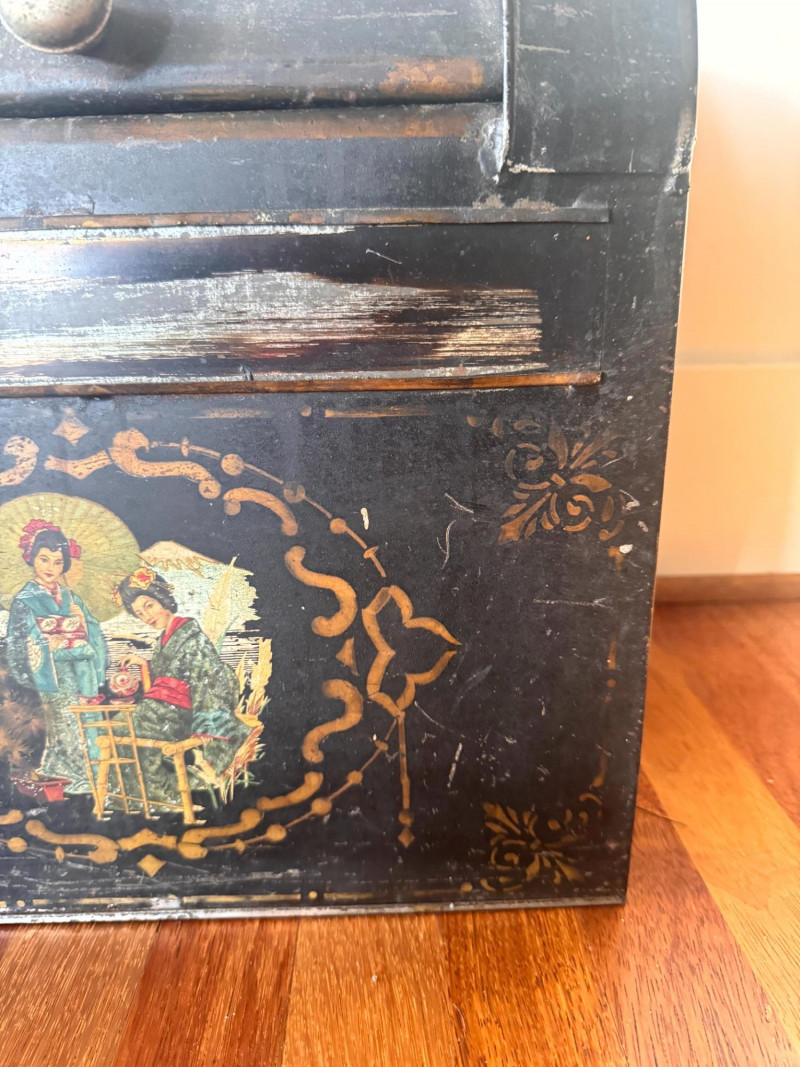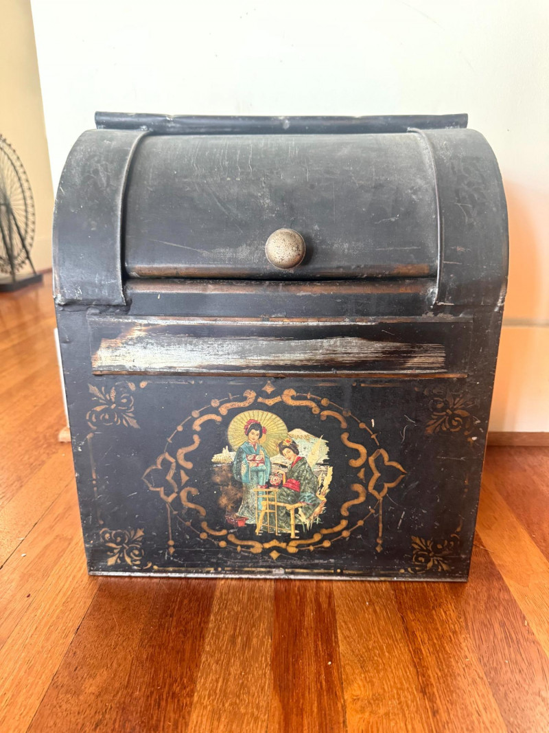 Antique Painted Tea Box / Coffee Bin w/ Figural Scene.