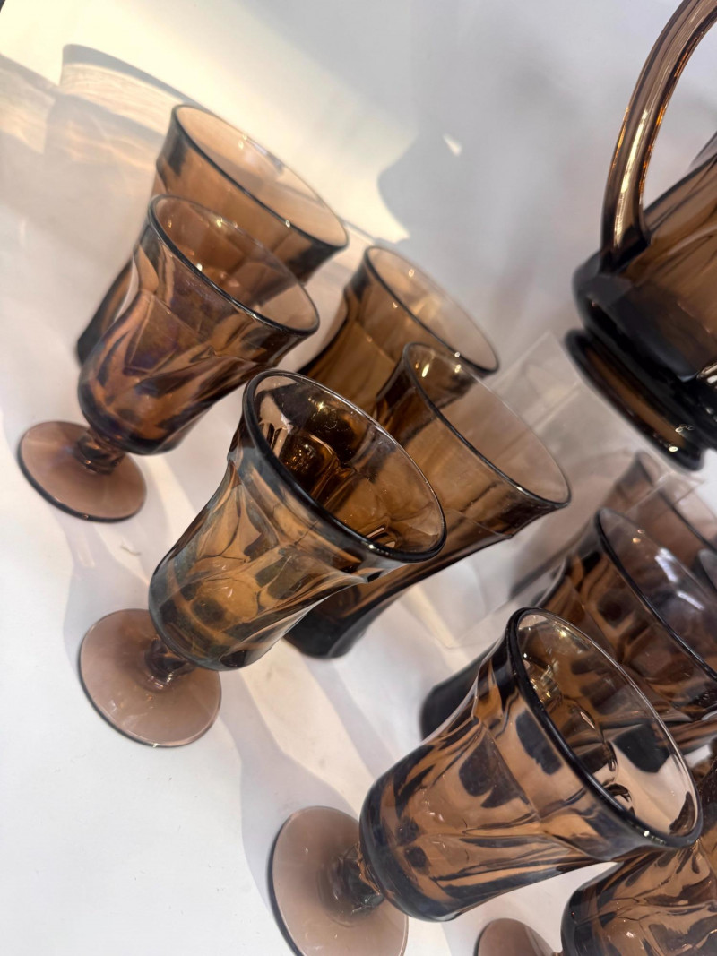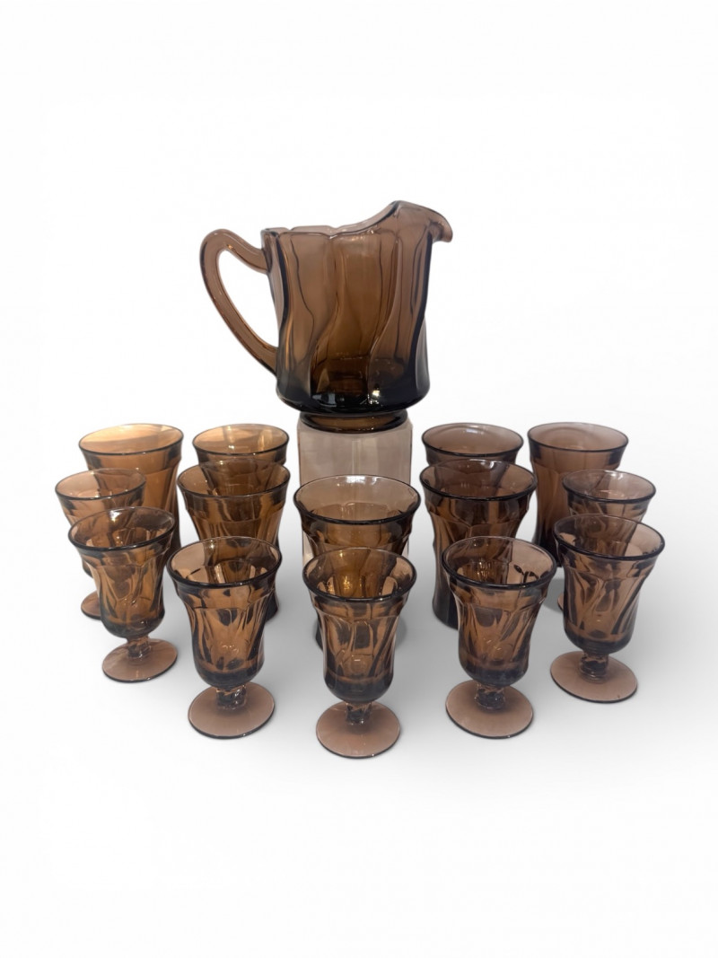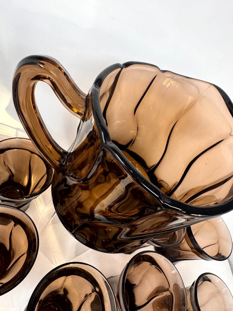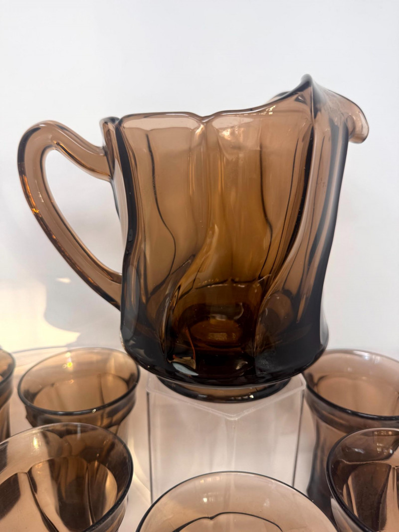 Vintage Thick Smoky Glass Pitcher w/ Matching Footed Glasses.
