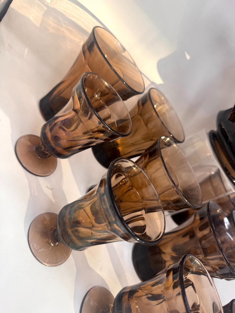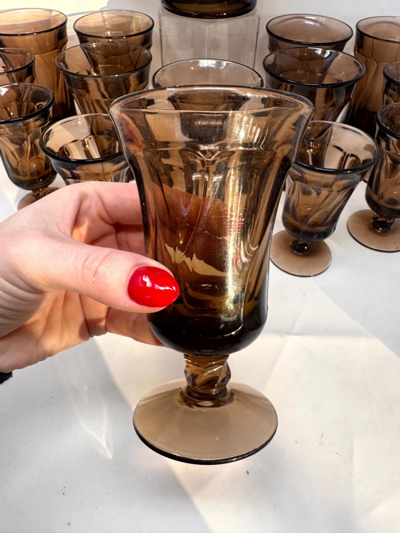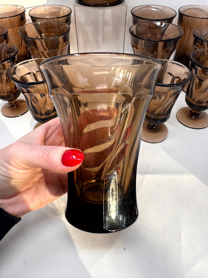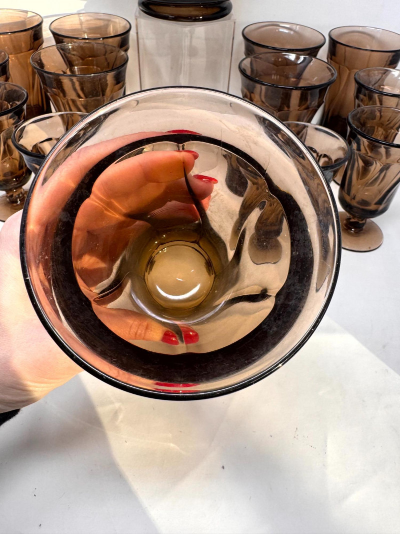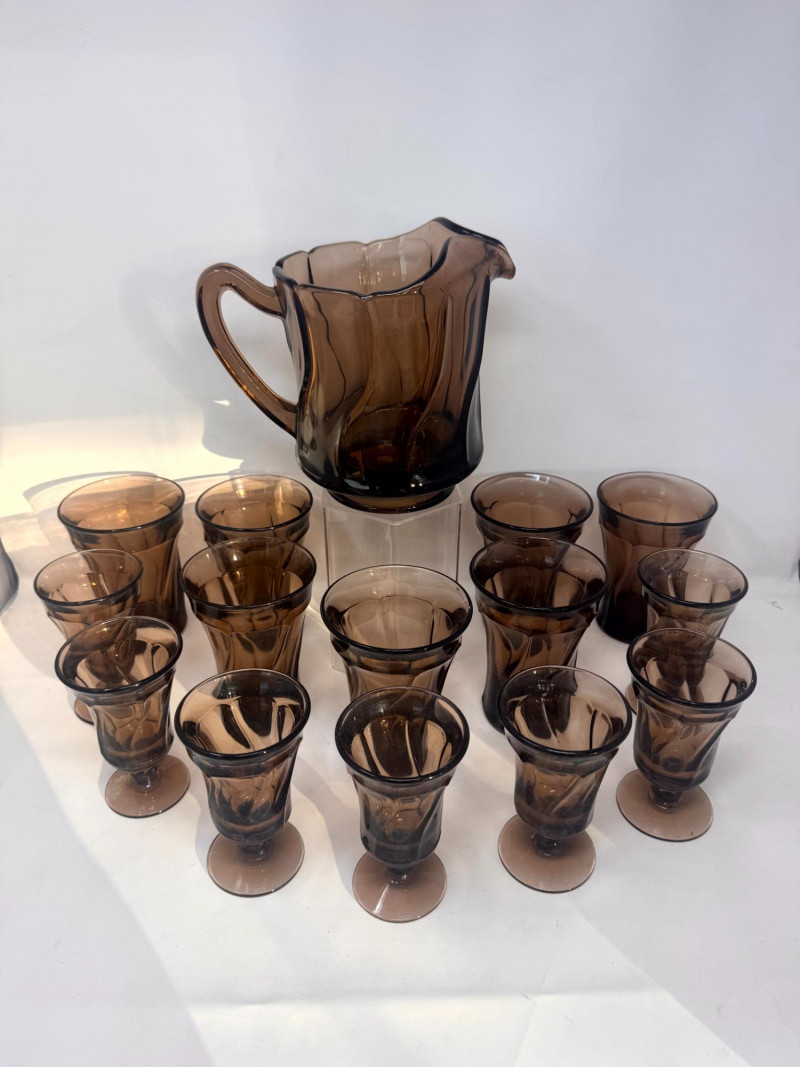 Vintage Thick Smoky Glass Pitcher w/ Matching Footed Glasses.