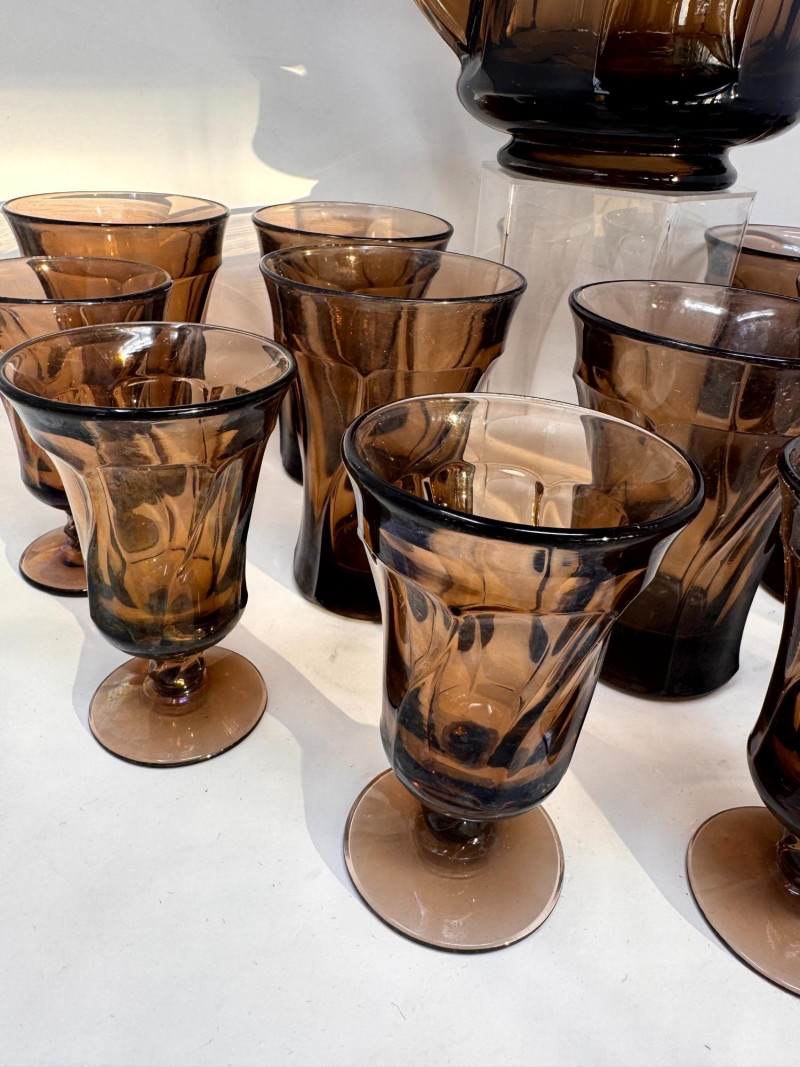 Lot # 39 - Vintage Thick Smoky Glass Pitcher w/ Matching Footed Glasses