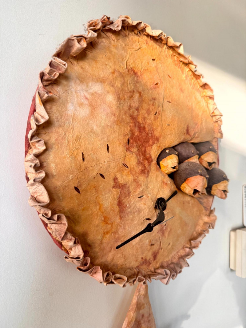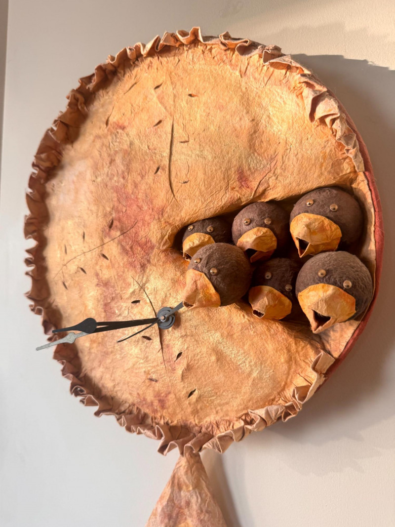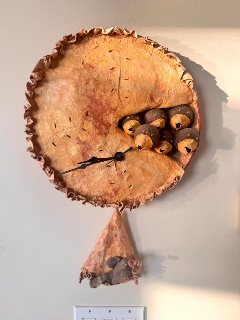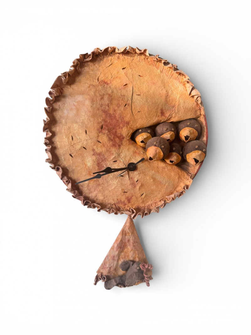 Whimsical Handmade Paper Wall Clock w/ Bird & Pie Design.