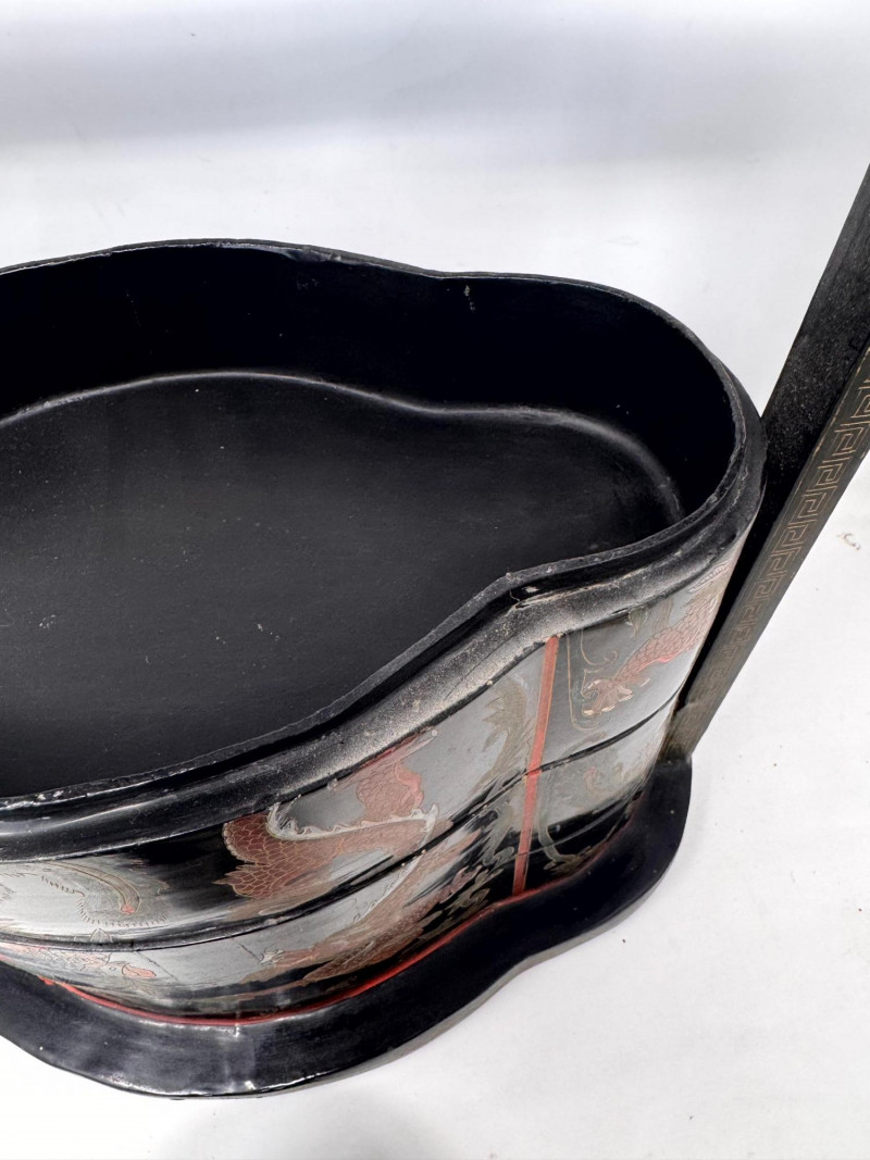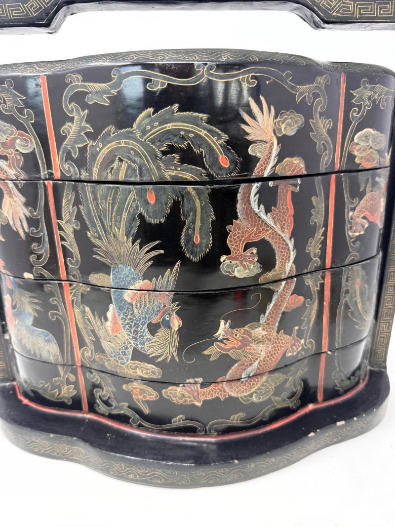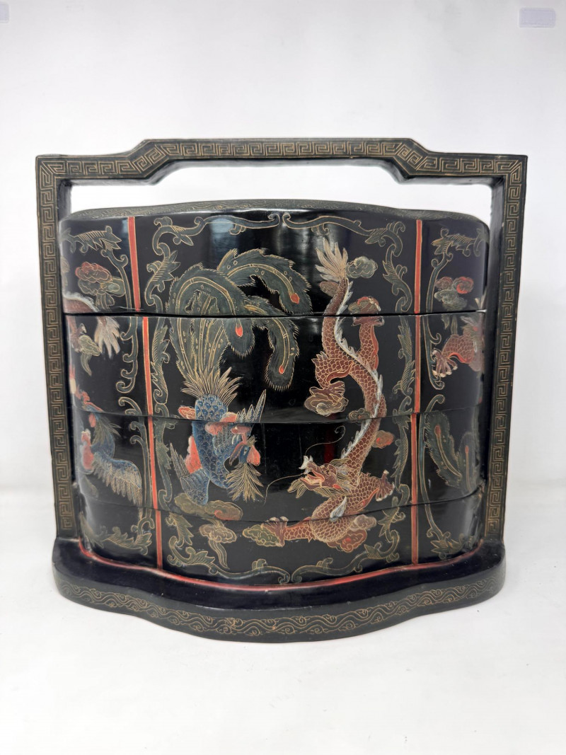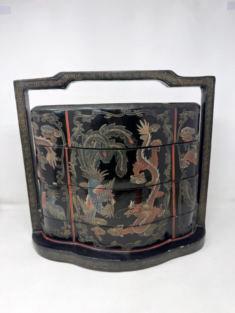 Lot # 71 - Large Vintage Tiered Wedding Basket, Painted Wood Dragon & Phoenix
