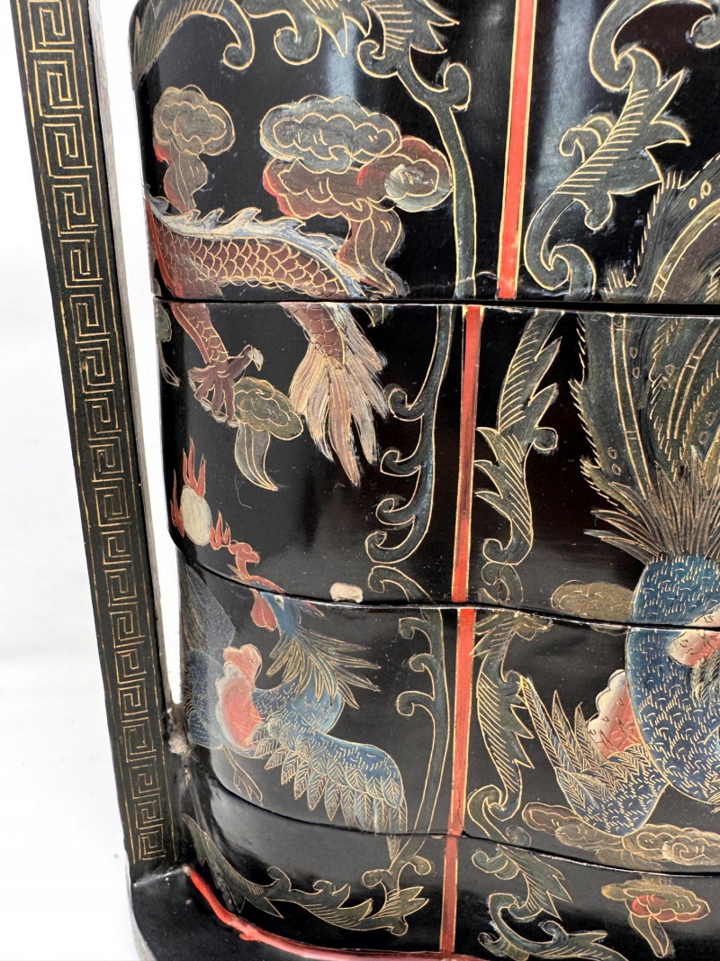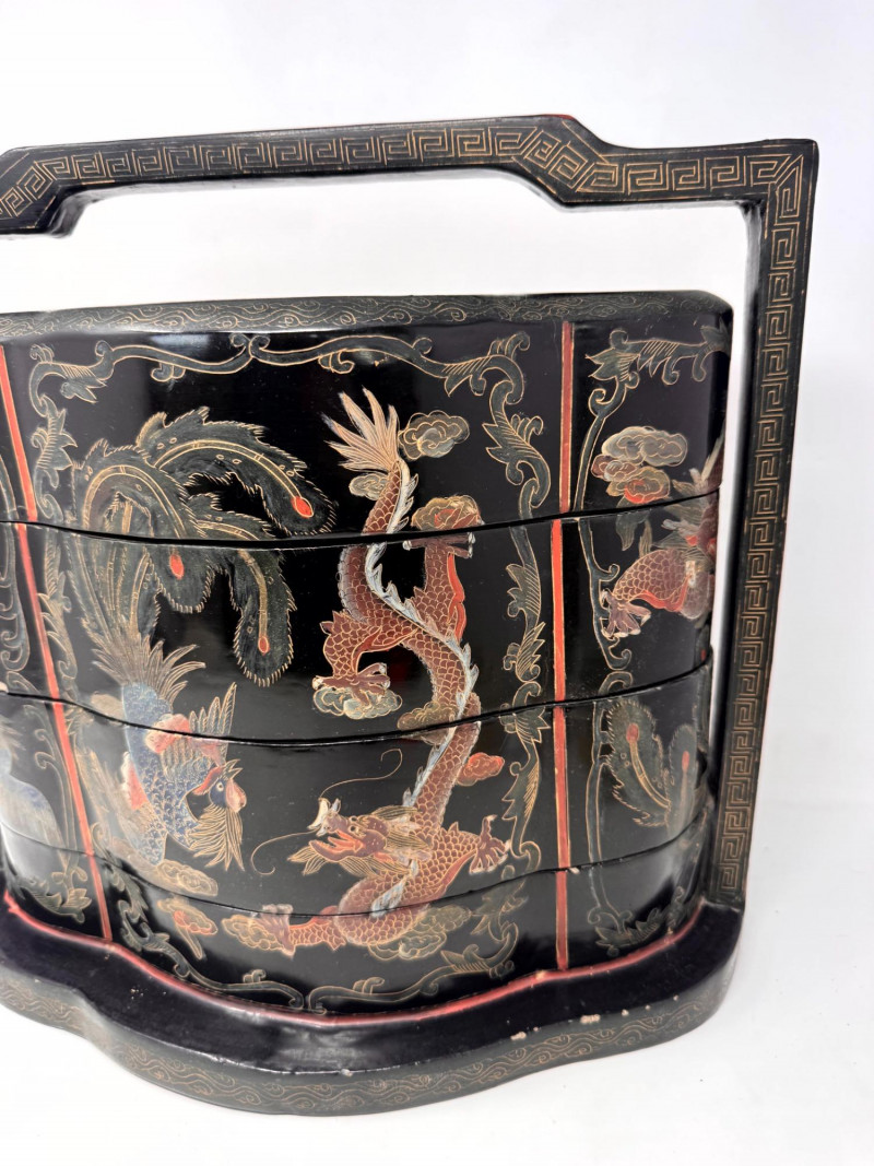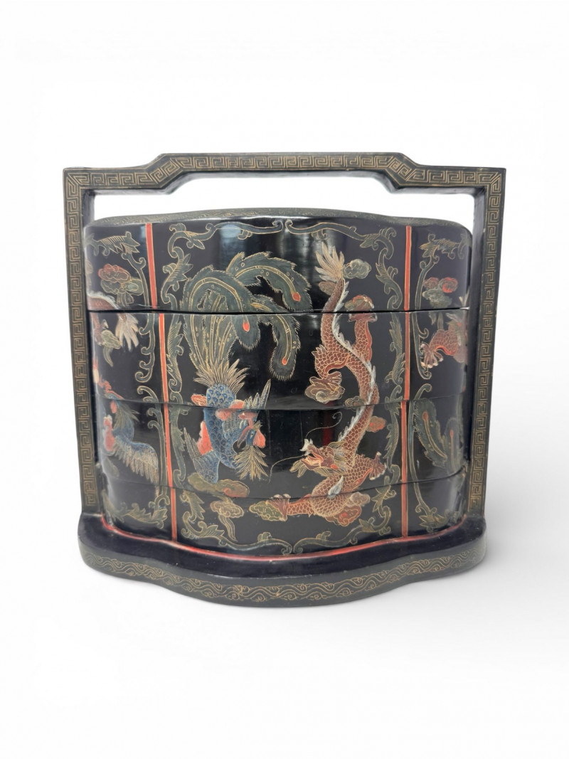 Large Vintage Tiered Wedding Basket, Painted Wood Dragon & Phoenix.