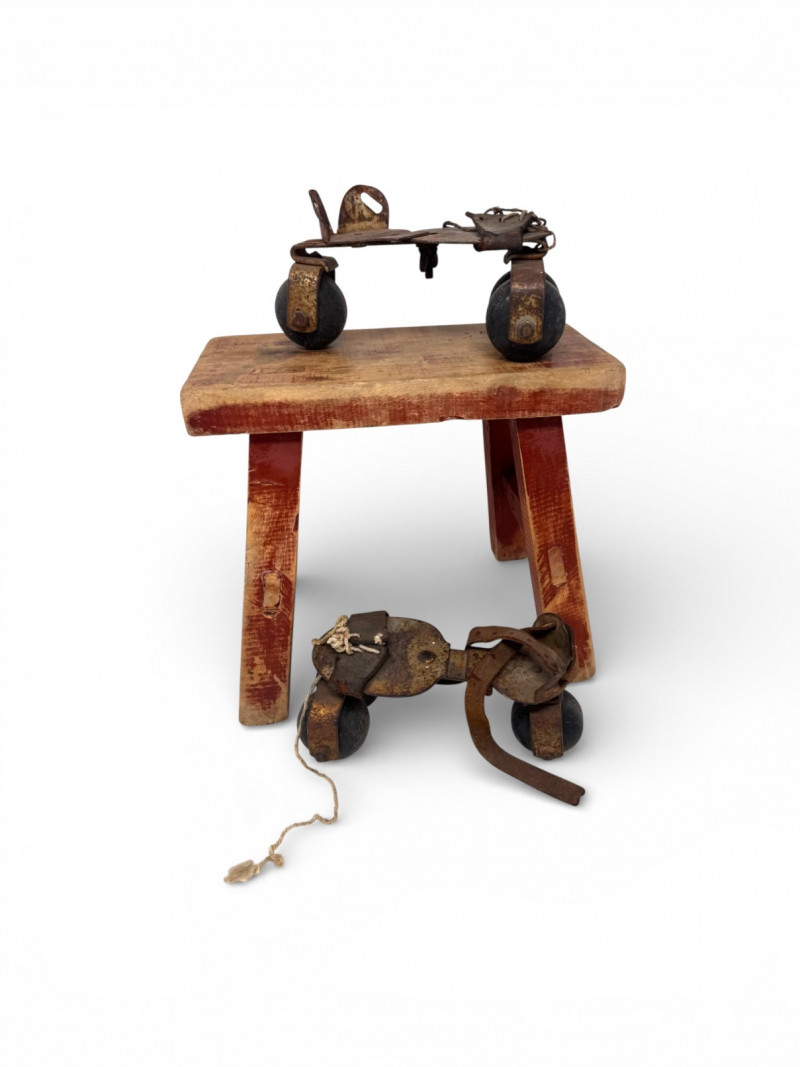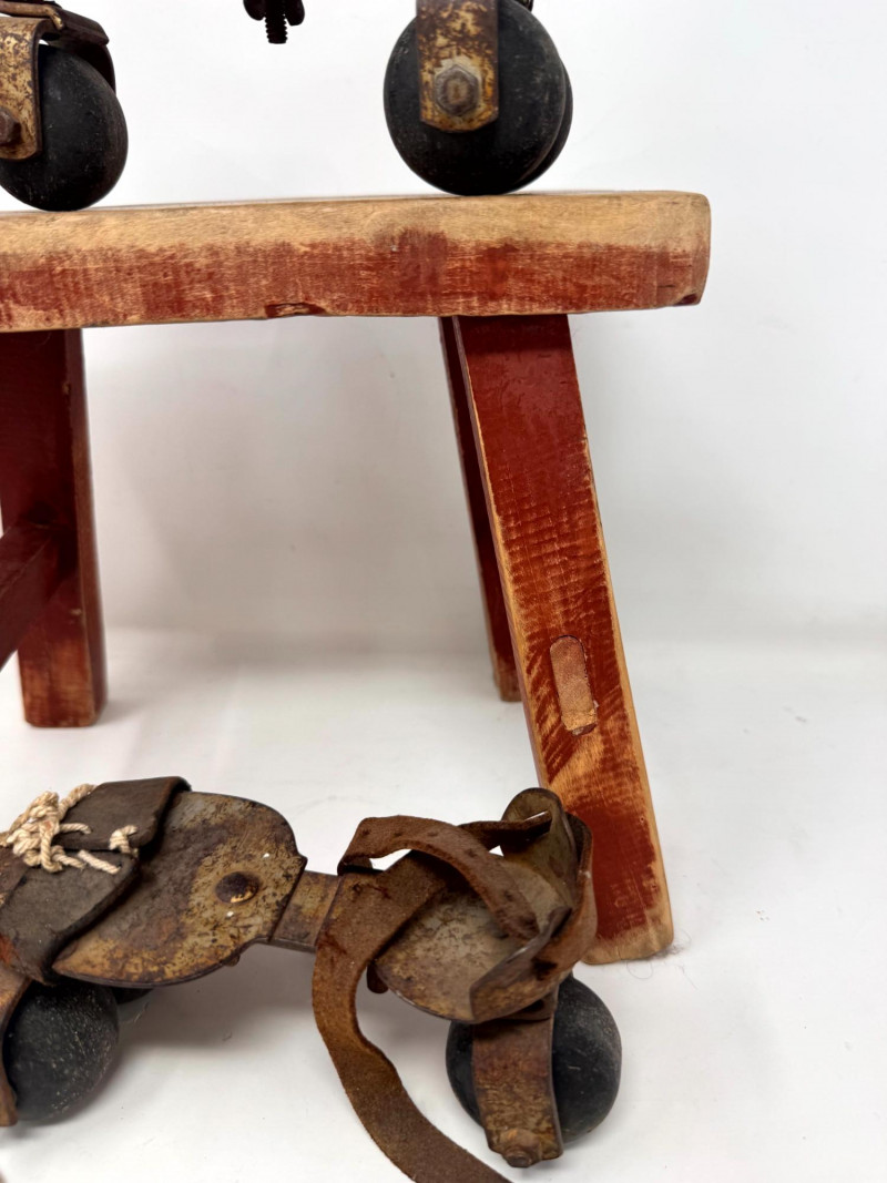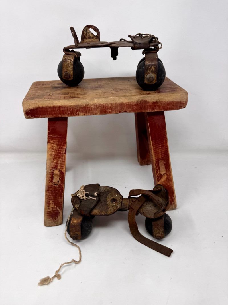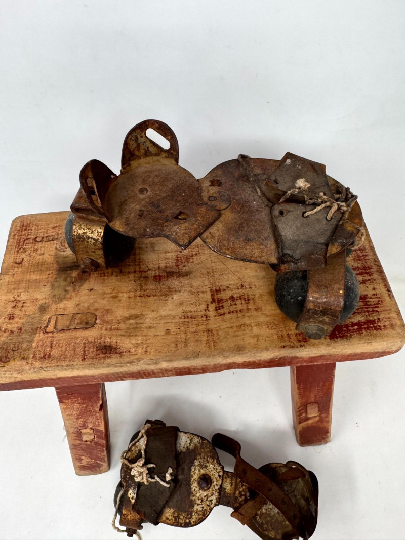 Antique Metal Roller Skates w/ Wooden Children’s Step Stool.