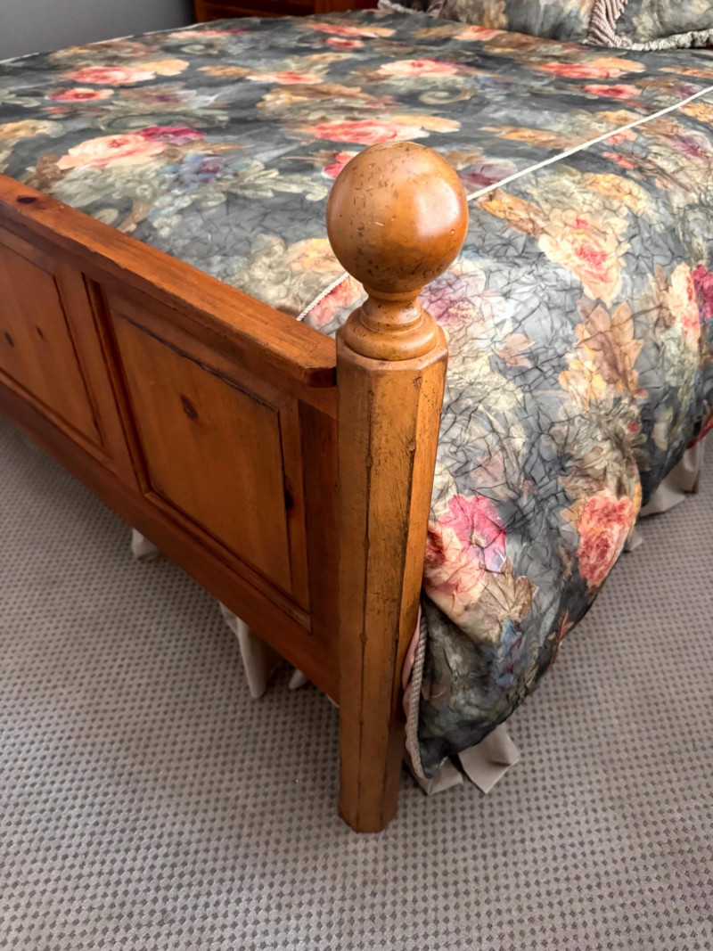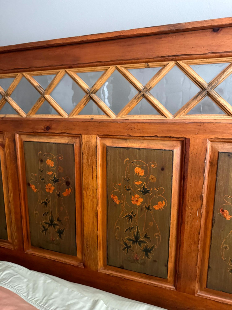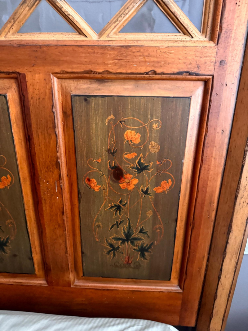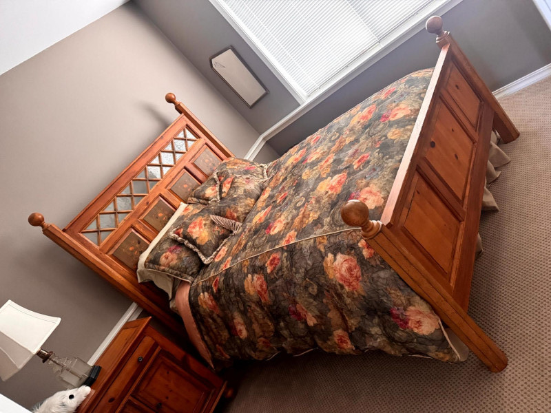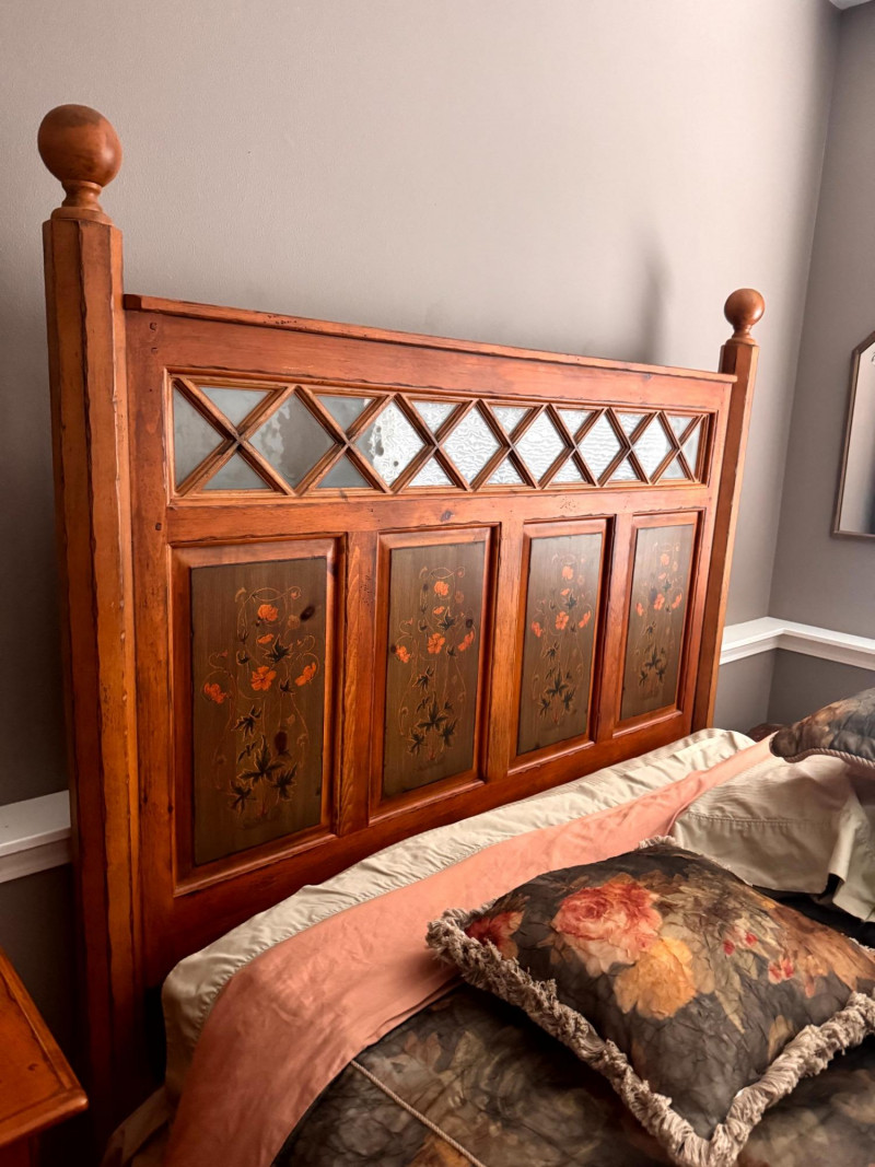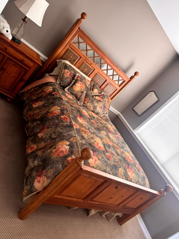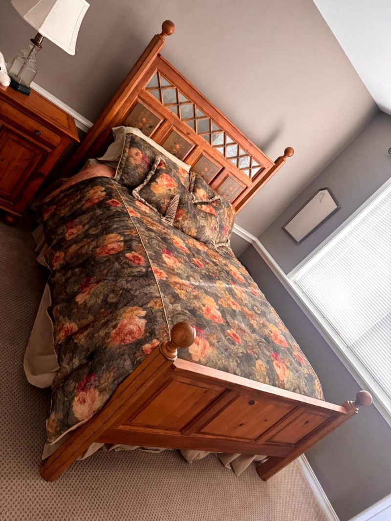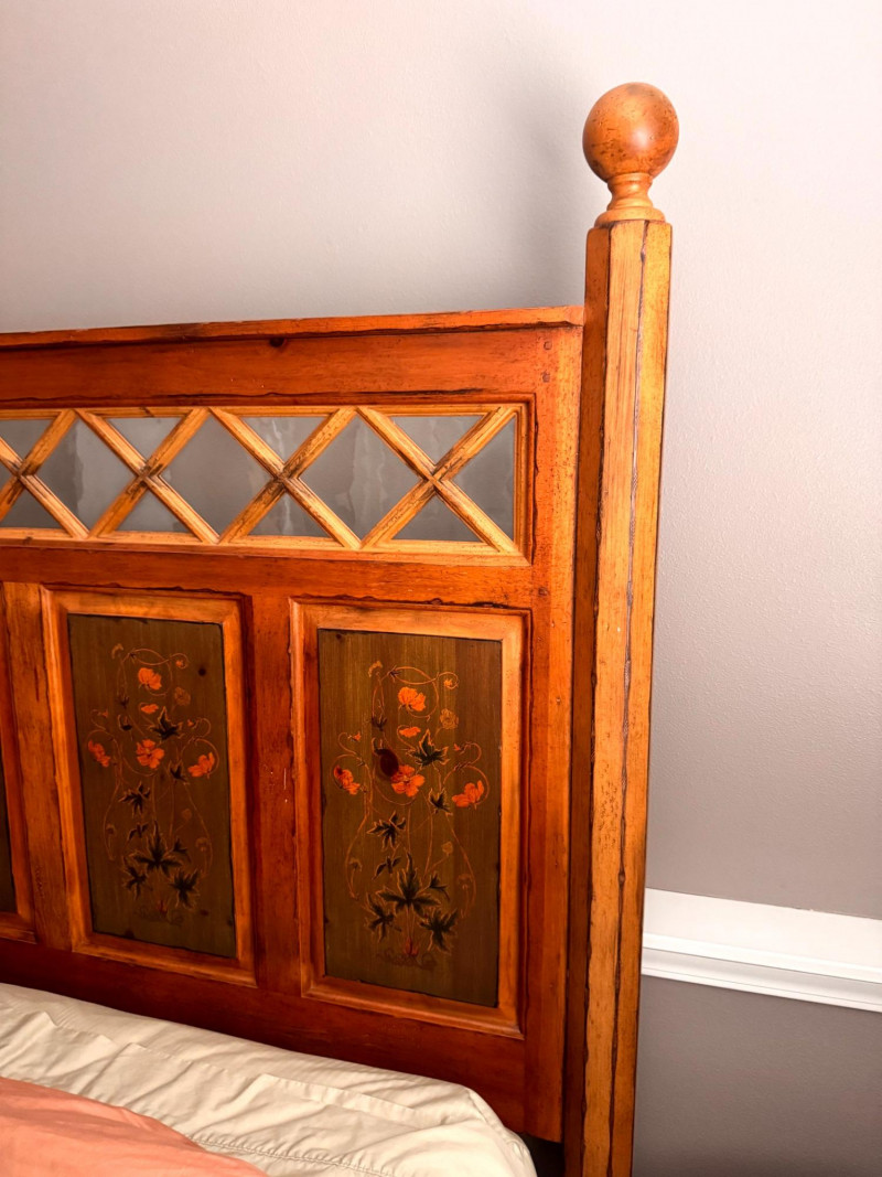 Gorgeous Queen Solid Wood Bed Glass Floral Headboard + Veratex Bedding. Size: Queen bed Bed Frame: Mattress: Bidding on this lot is an agreement that: (1.) You will have at least 2 capable, able bodied persons to lift and load at a minimum. (2.) You will bring a hand truck and/or any other tools needed to remove this item. If these steps are not followed your item will be forfeit and no refund given.