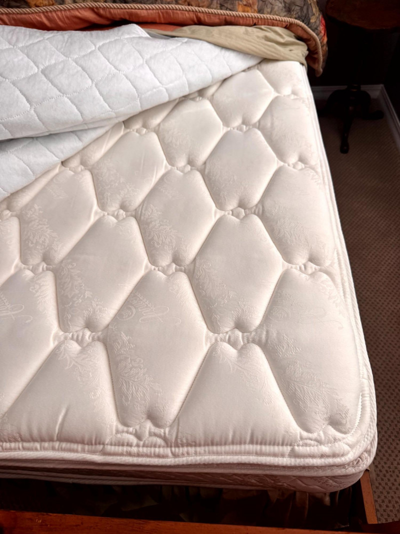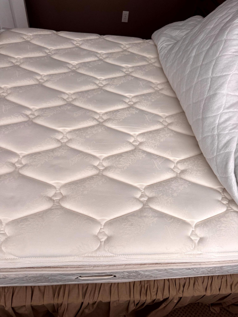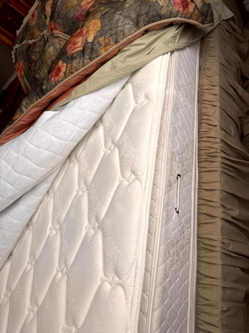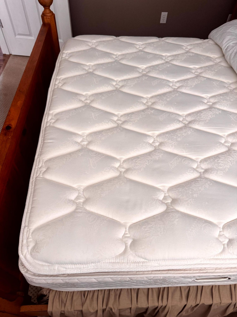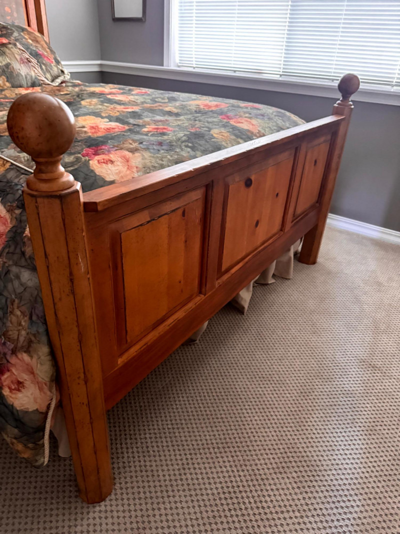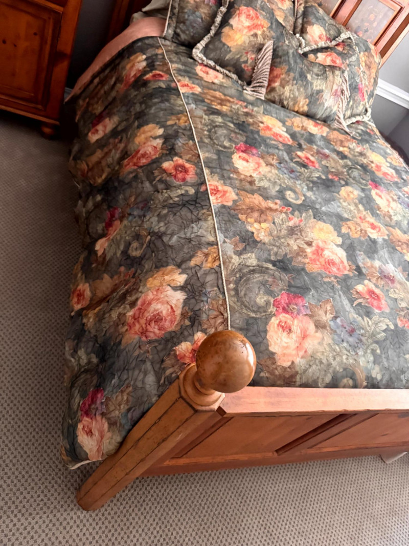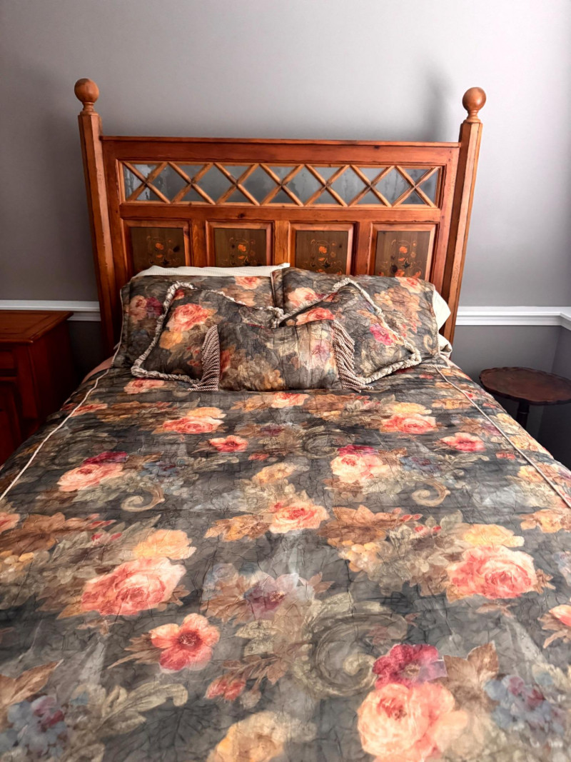 Gorgeous Queen Solid Wood Bed Glass Floral Headboard + Veratex Bedding. Size: Queen bed Bed Frame: Mattress: Bidding on this lot is an agreement that: (1.) You will have at least 2 capable, able bodied persons to lift and load at a minimum. (2.) You will bring a hand truck and/or any other tools needed to remove this item. If these steps are not followed your item will be forfeit and no refund given.