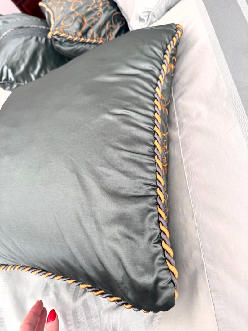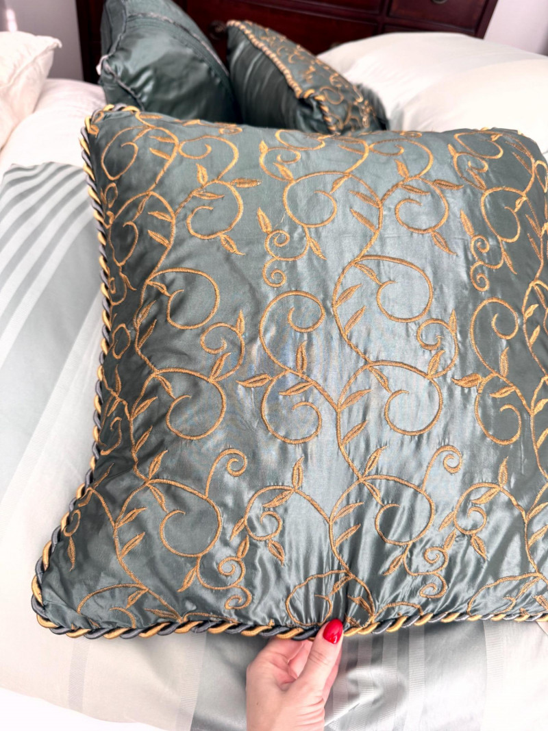 Luxury Queen Bedding, Seafoam & Teal Milli Home Pillows, Comforter + Size: Queen Color palette: Set includes: