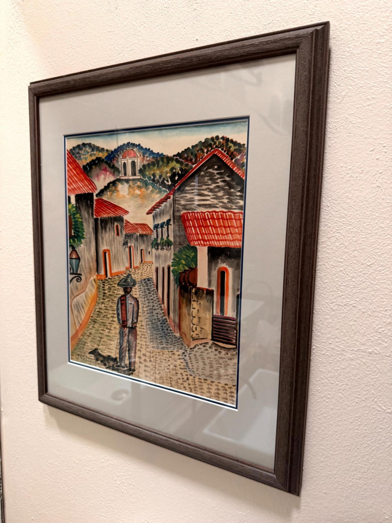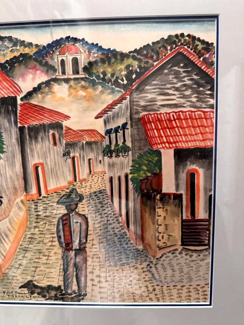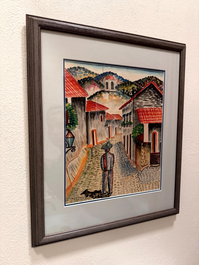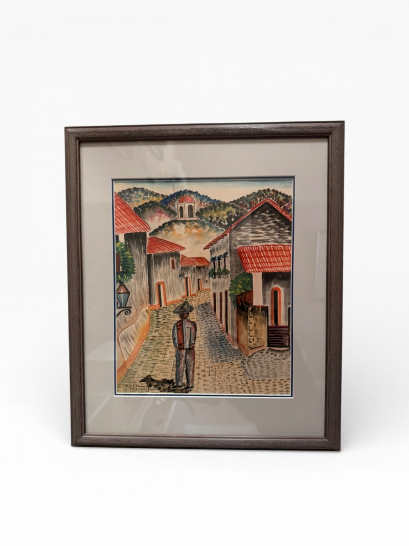 Signed Mexican Village Street Scene w/ Red Tile Roofs, Framed.