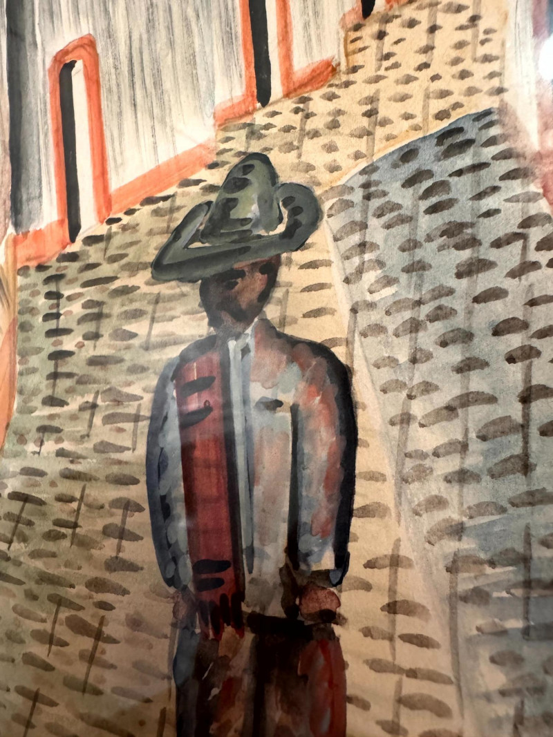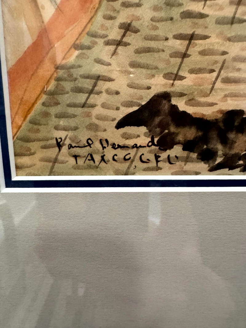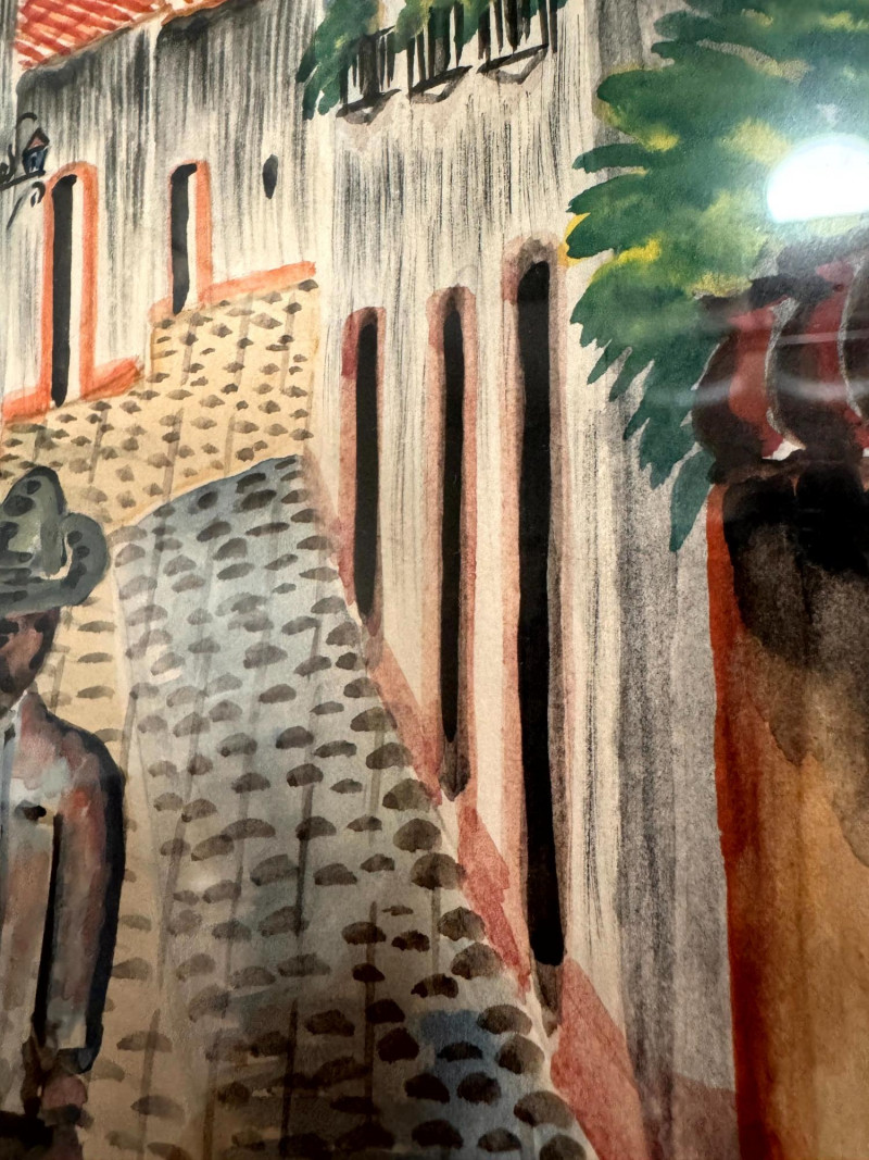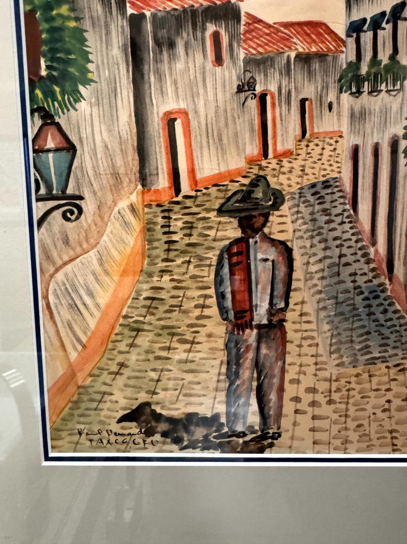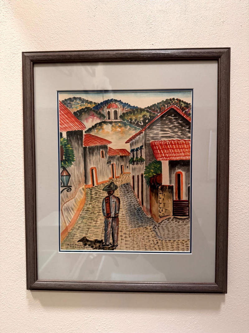 Signed Mexican Village Street Scene w/ Red Tile Roofs, Framed.