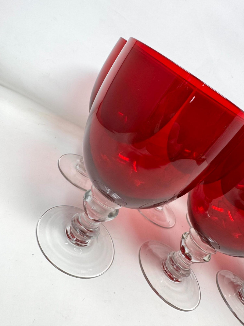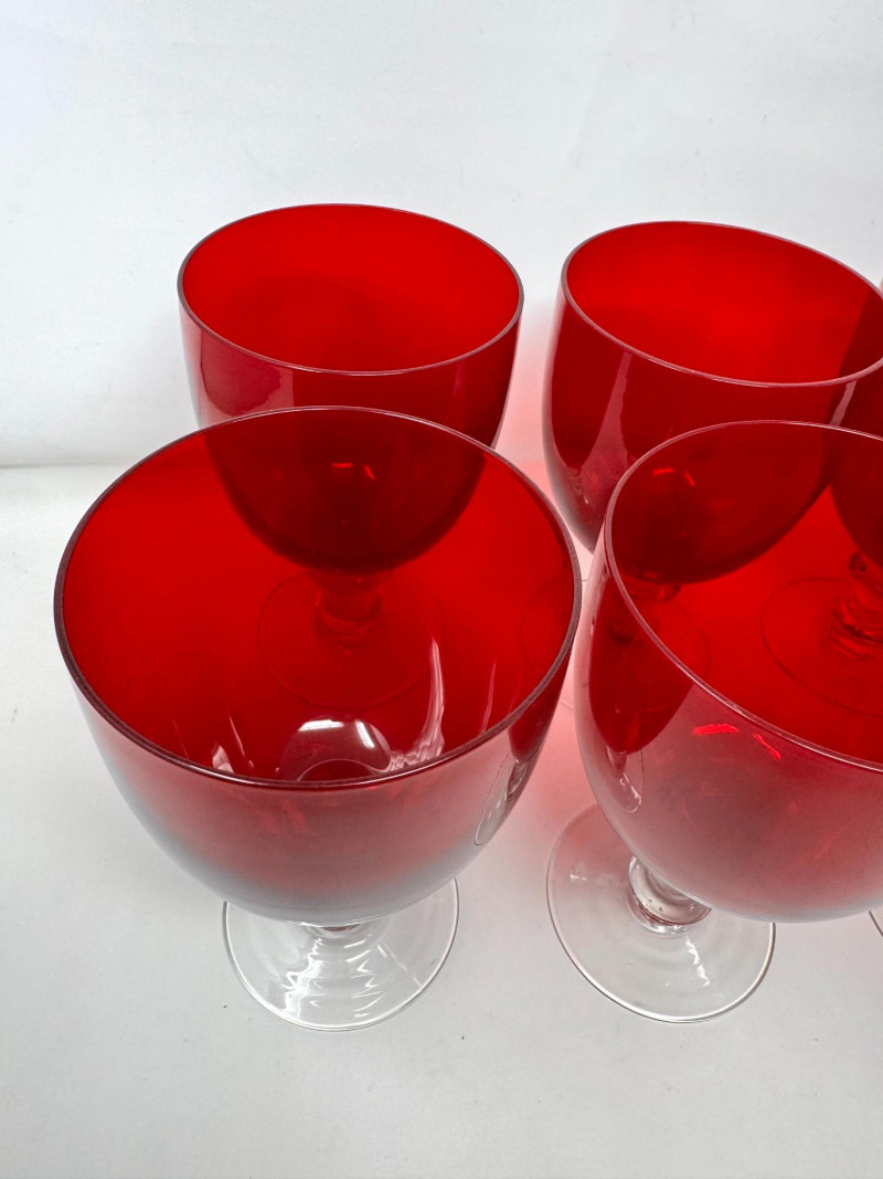 8 Oversized Ruby Red Blown Glass Goblets Clear Stems.