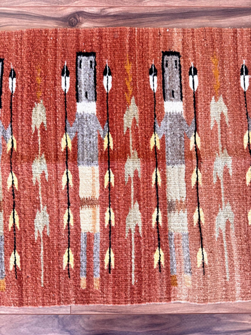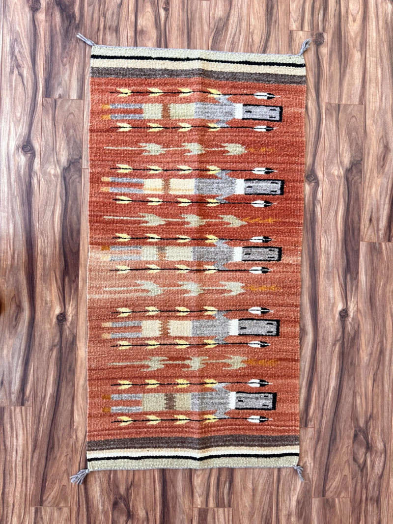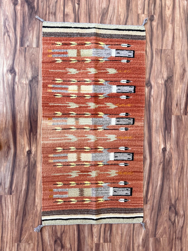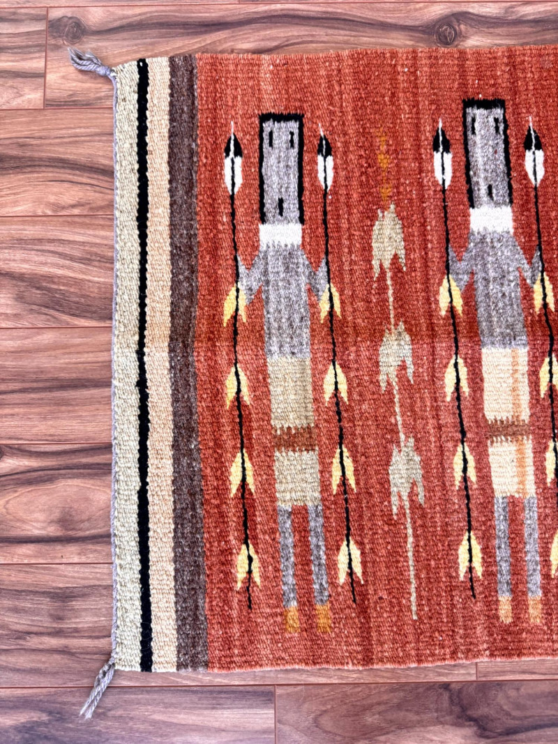Navajo-Style Wool Rug – Little Men Figural Design, Orange Field.