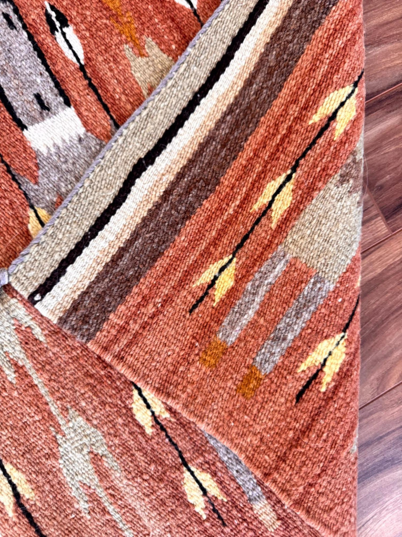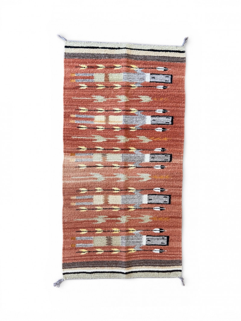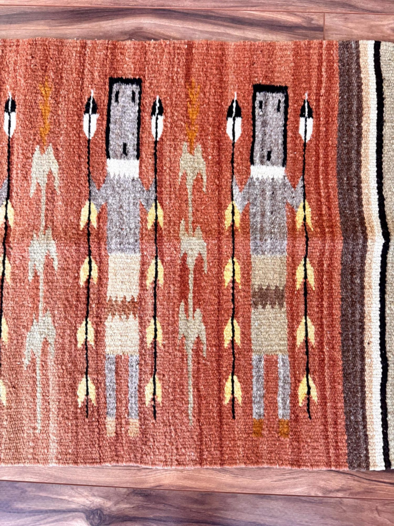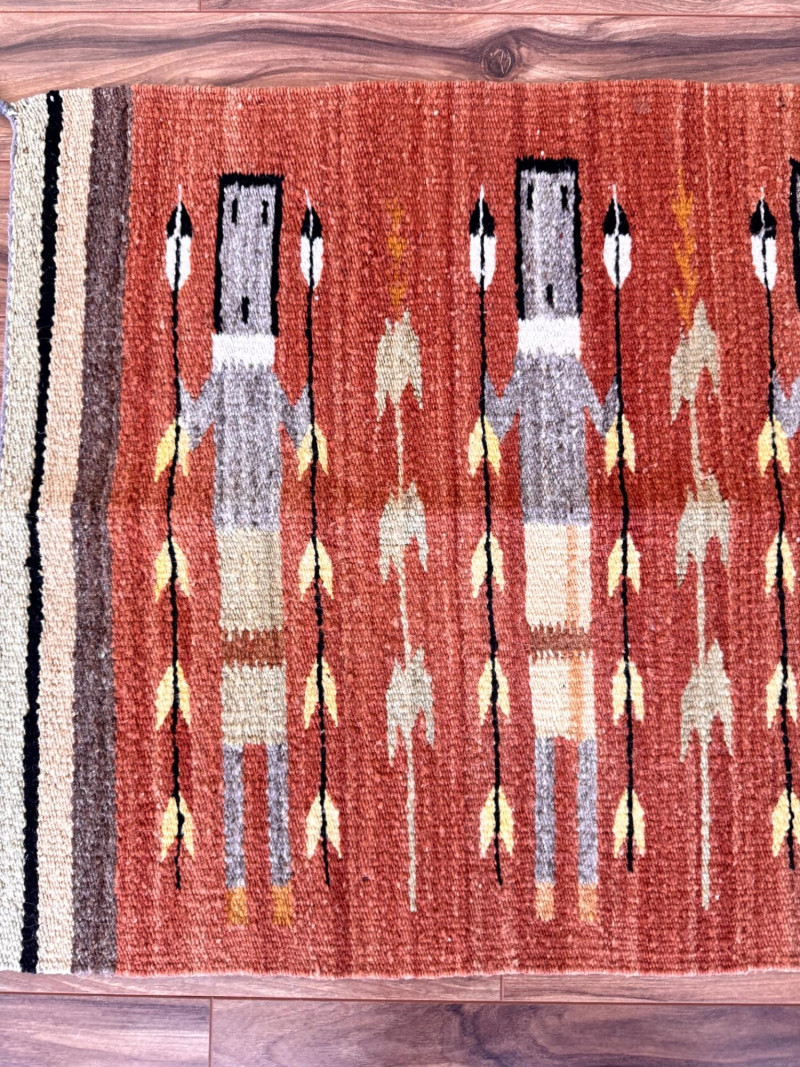 Navajo-Style Wool Rug – Little Men Figural Design, Orange Field.