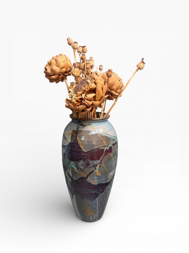 Lot # 49 - Tall Glazed Art Pottery Floor Vase w/ Dried Floral Arrangement