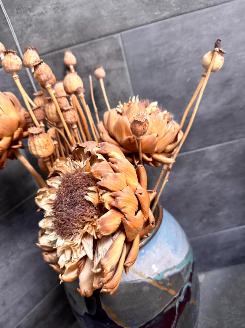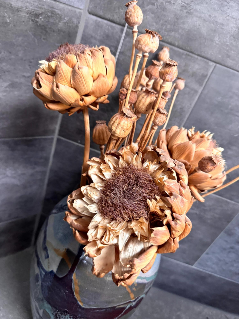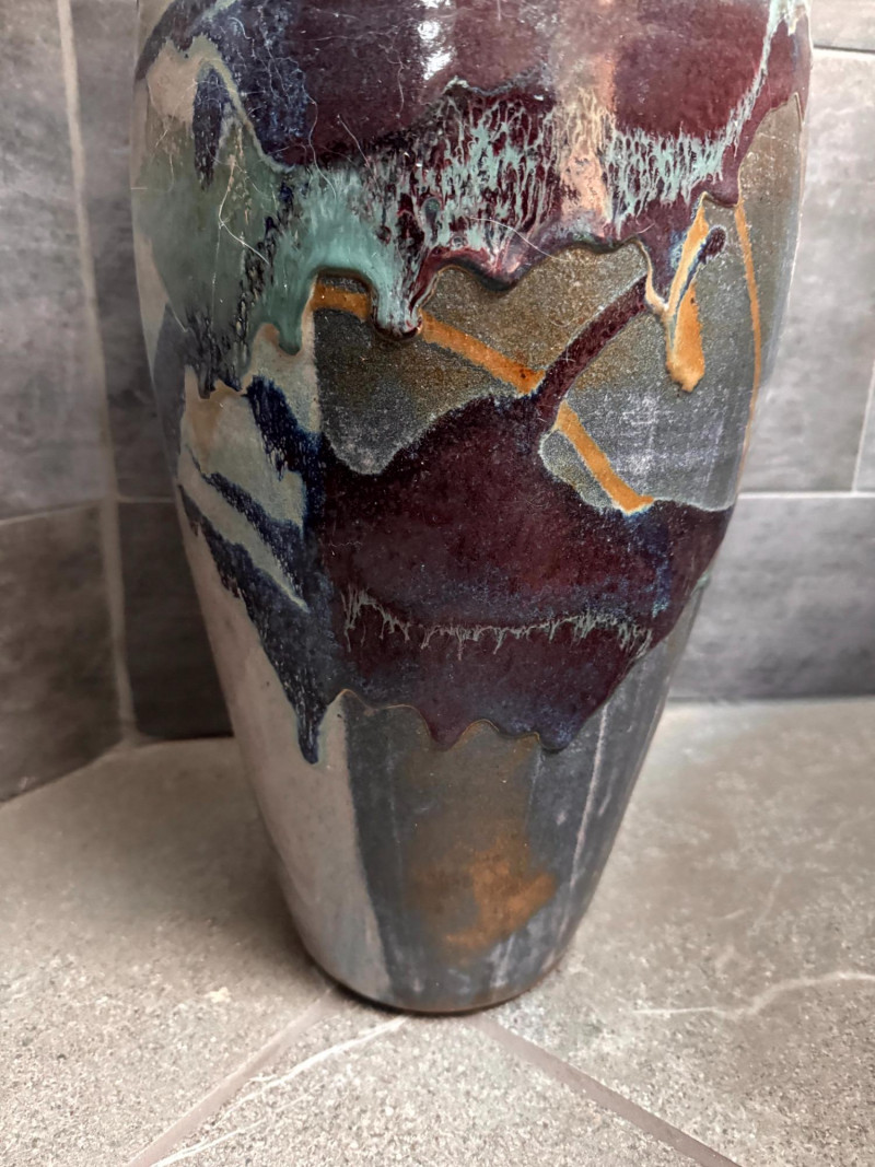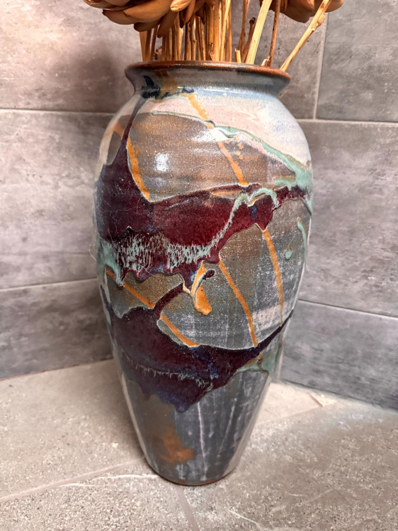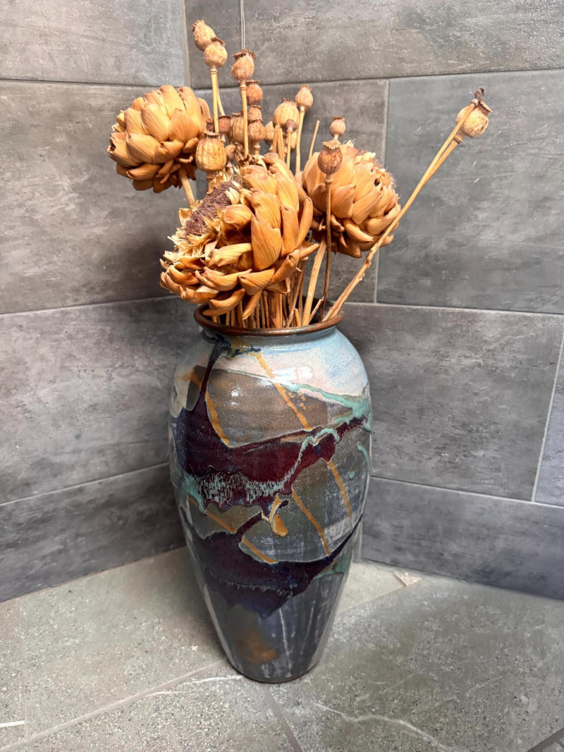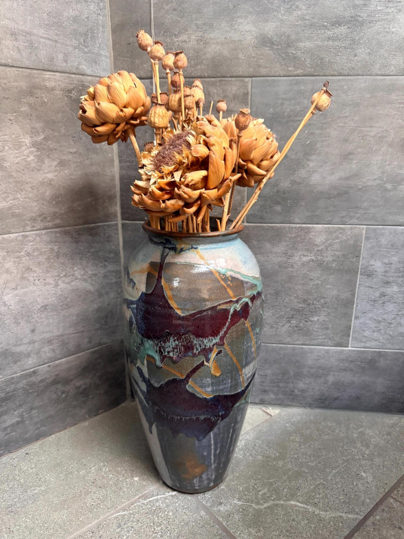 Tall Glazed Art Pottery Floor Vase w/ Dried Floral Arrangement.