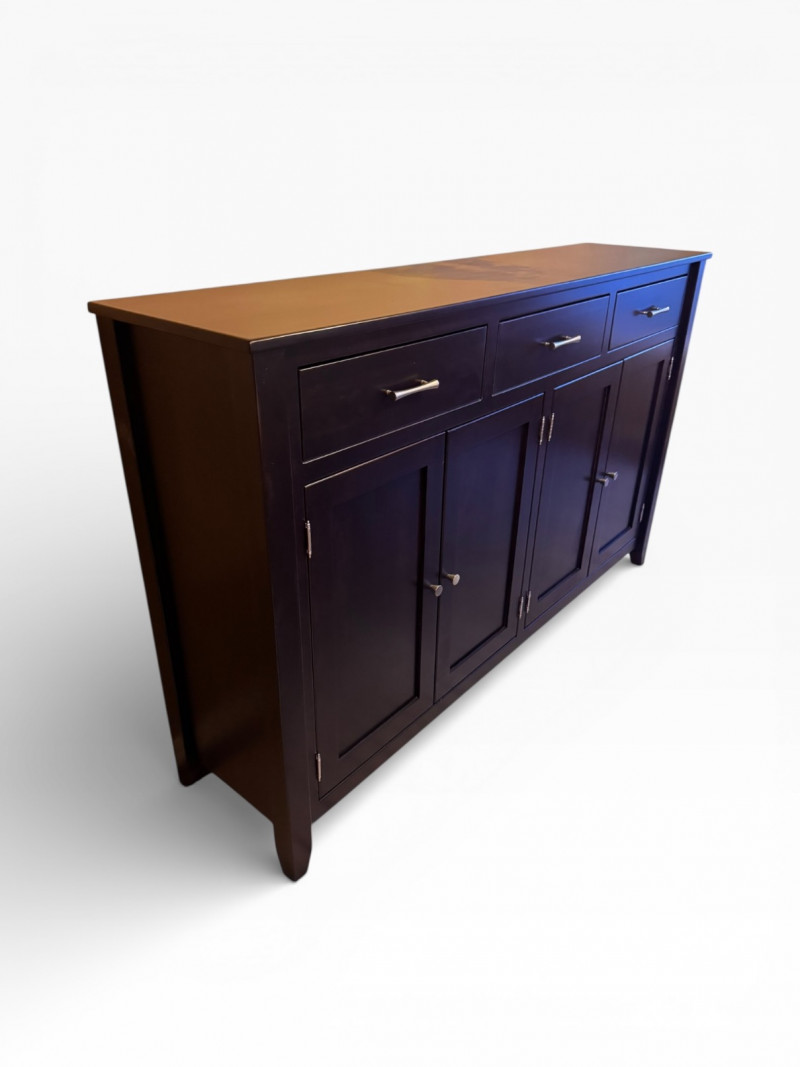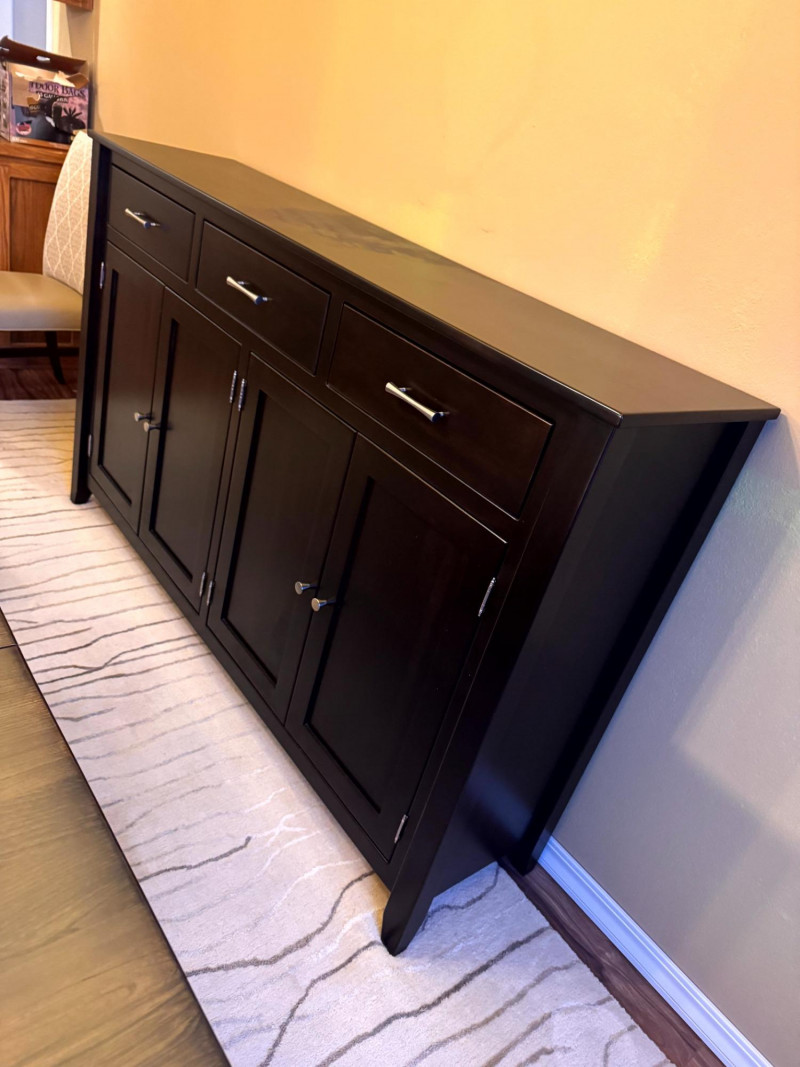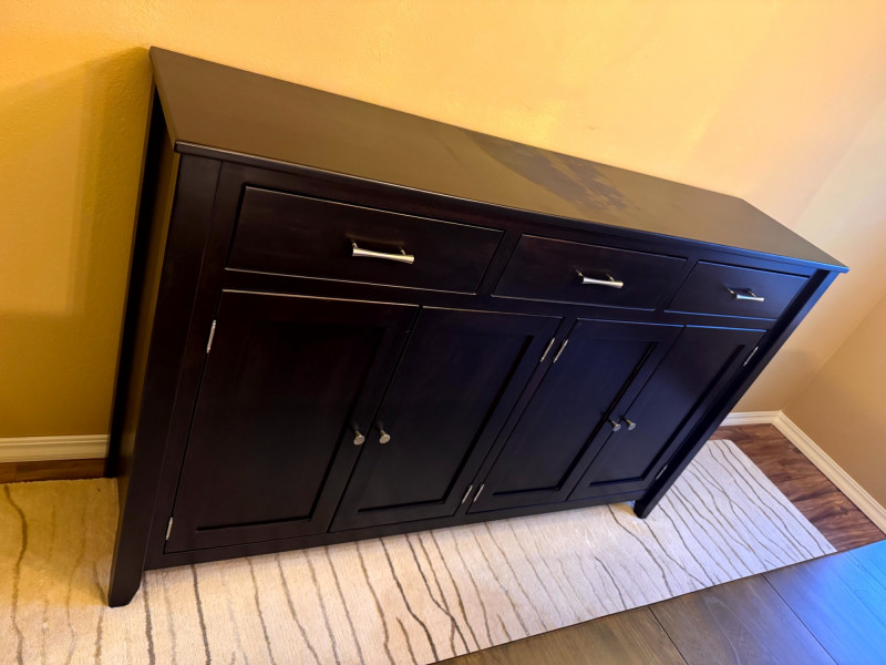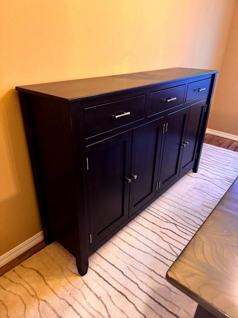 Large Modern Solid Wood Buffet w/ 3 Drawers & Metal Pulls. Bidding on this lot is an agreement that: (1.) You will have at least 2 capable, able bodied persons to lift and load at a minimum. (2.) You will bring a hand truck and/or any other tools needed to remove this item. If these steps are not followed your item will be forfeit and no refund given.