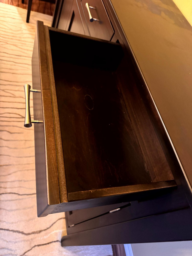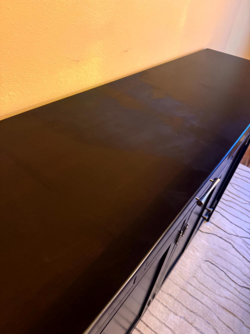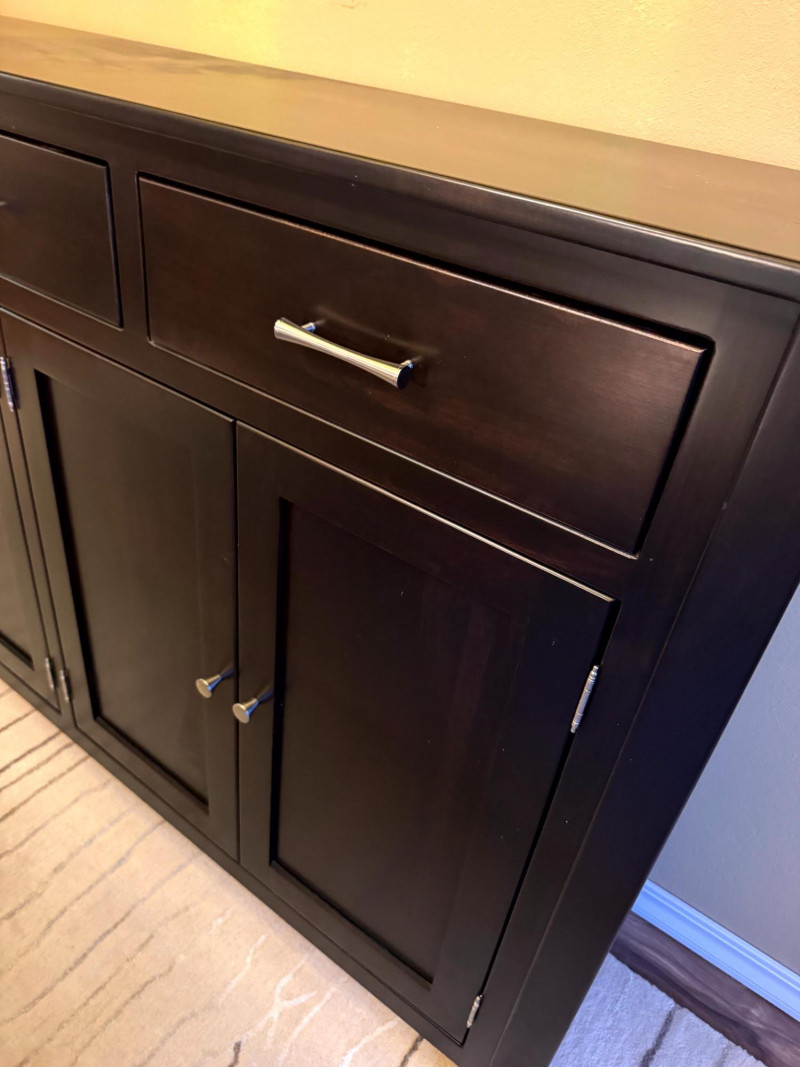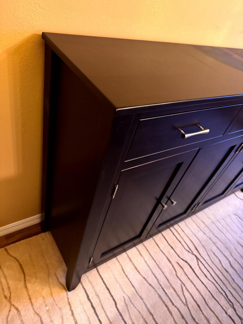 Large Modern Solid Wood Buffet w/ 3 Drawers & Metal Pulls. Bidding on this lot is an agreement that: (1.) You will have at least 2 capable, able bodied persons to lift and load at a minimum. (2.) You will bring a hand truck and/or any other tools needed to remove this item. If these steps are not followed your item will be forfeit and no refund given.