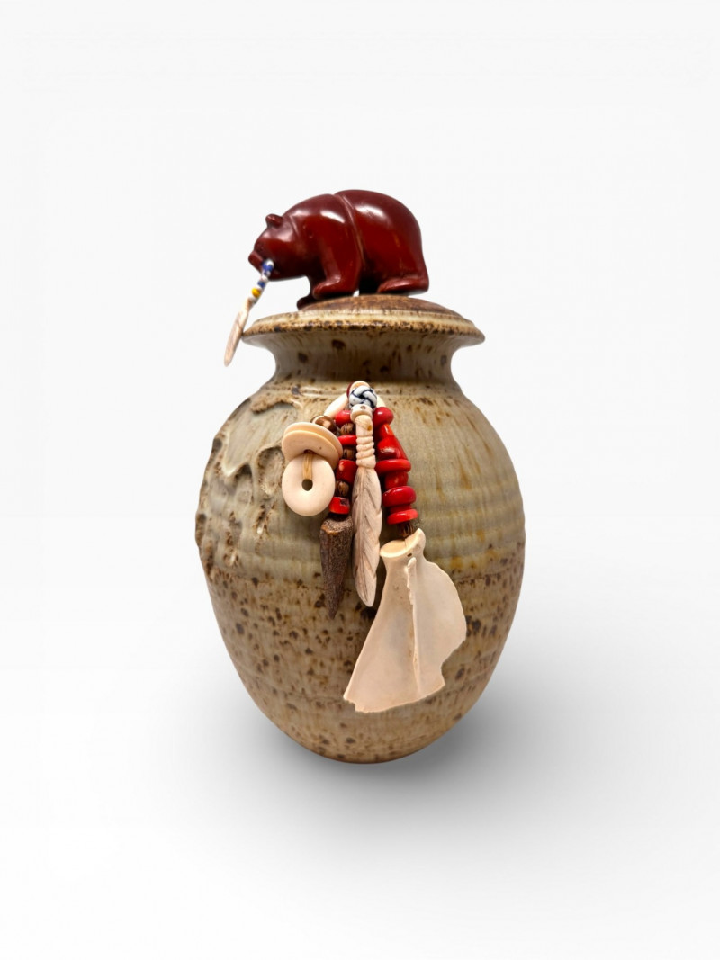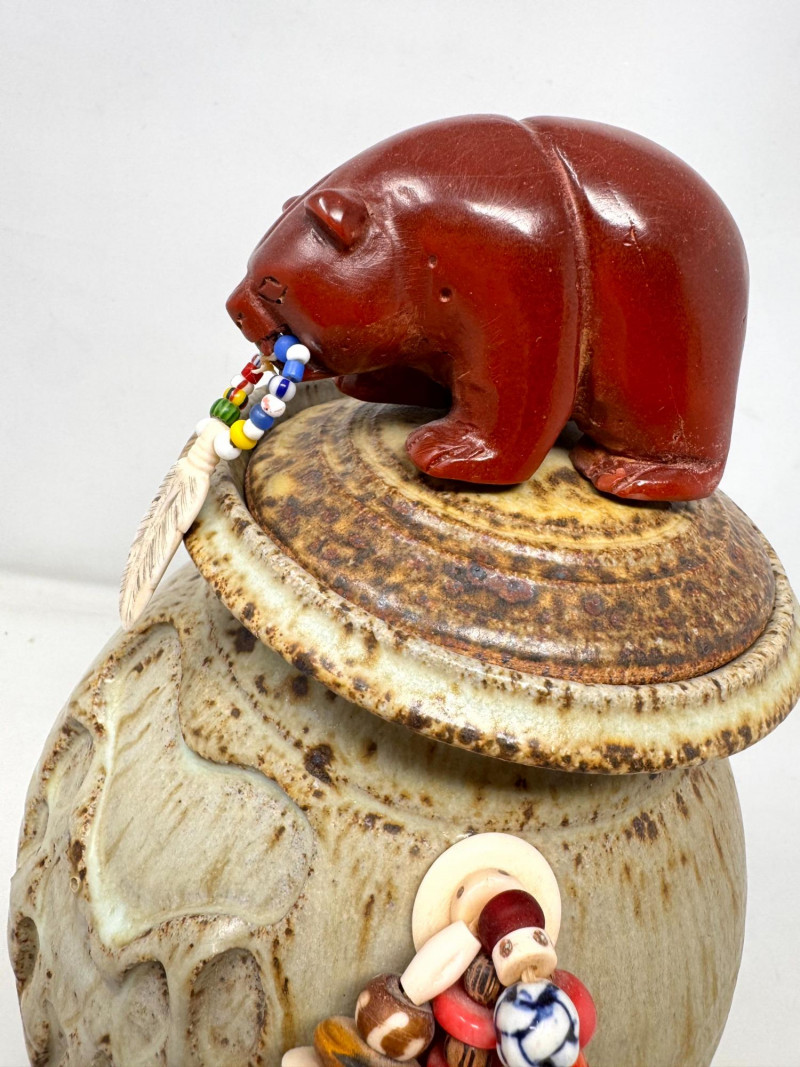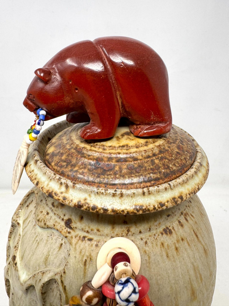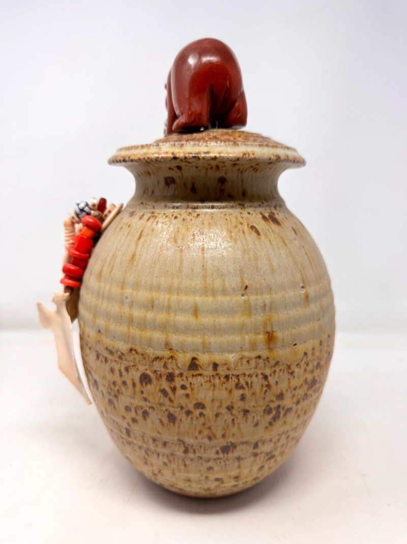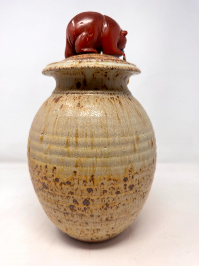 Lot # 72 - Haida Spirit Vessel Stoneware Jar w/ Bear Lid – Wood Ash Glaze