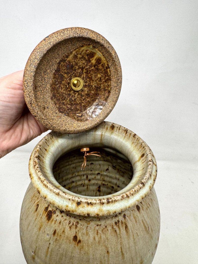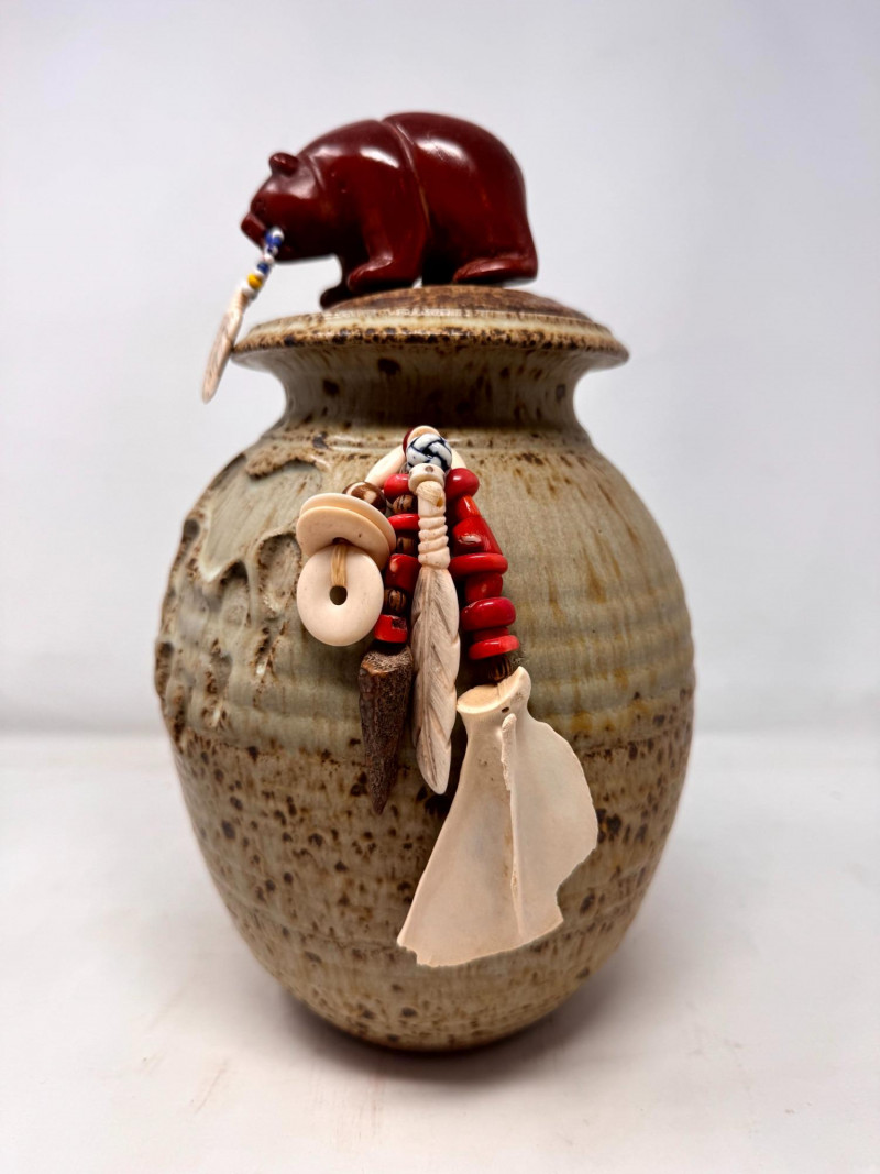 Haida Spirit Vessel Stoneware Jar w/ Bear Lid – Wood Ash Glaze.
