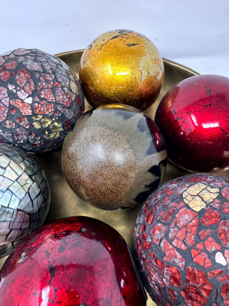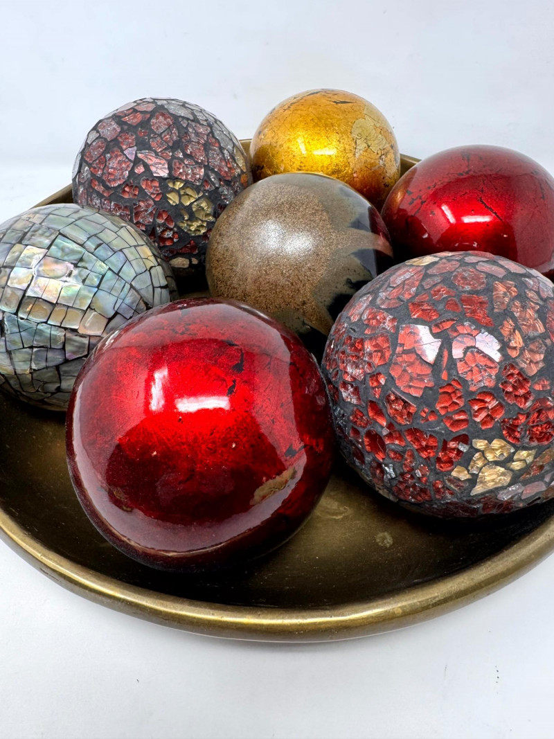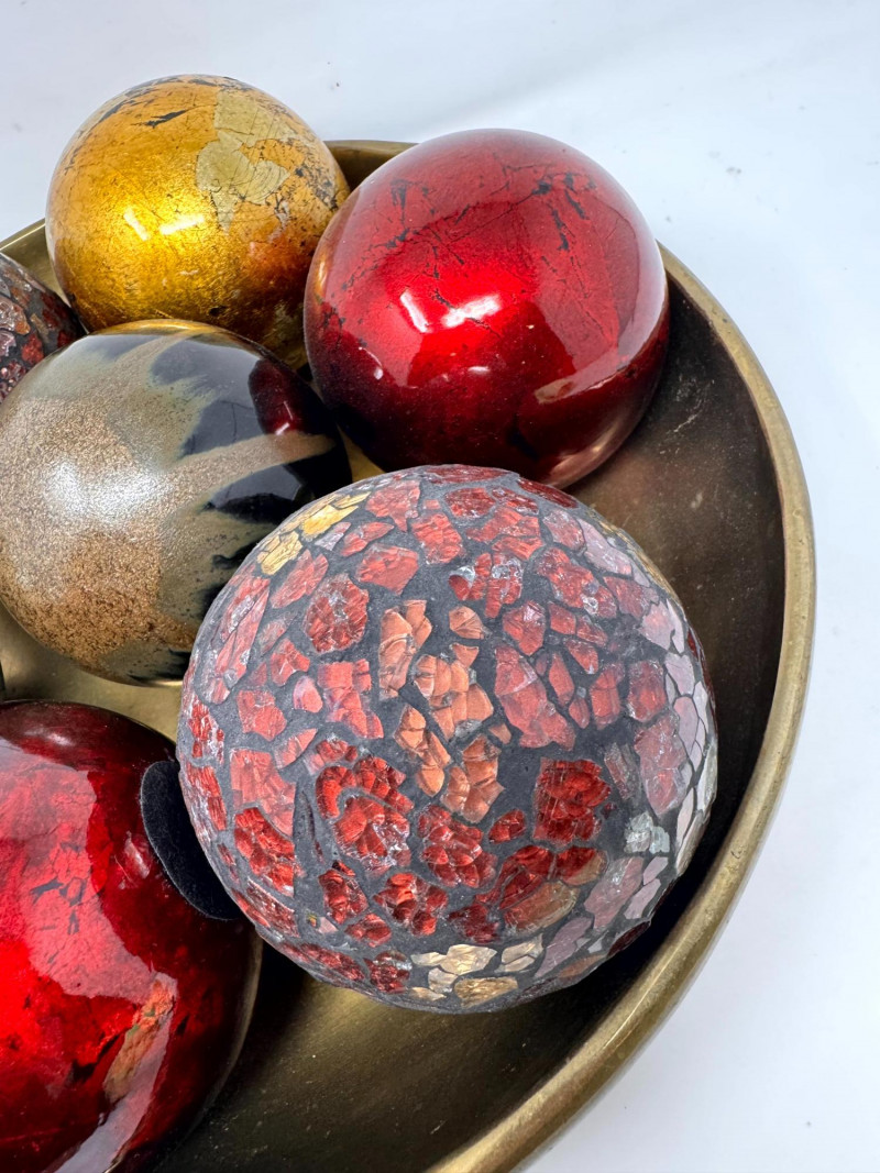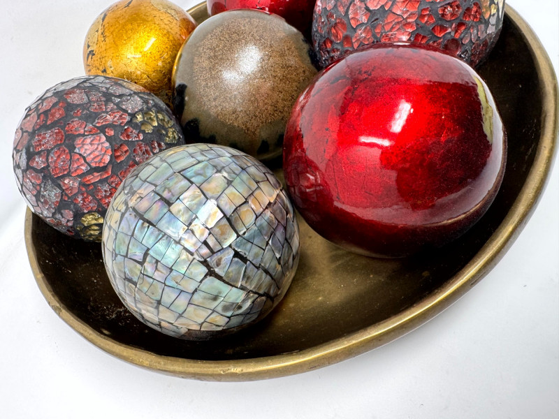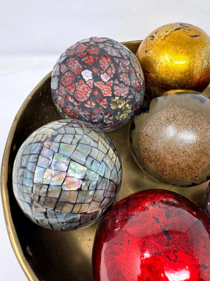 Made In Italy Heavy Brass Bowl w/ Glass, Pottery & Abalone Balls +
