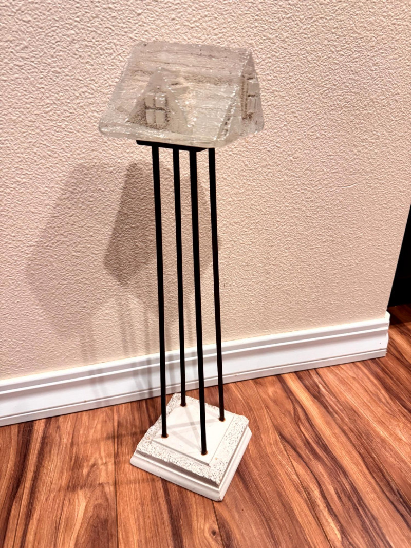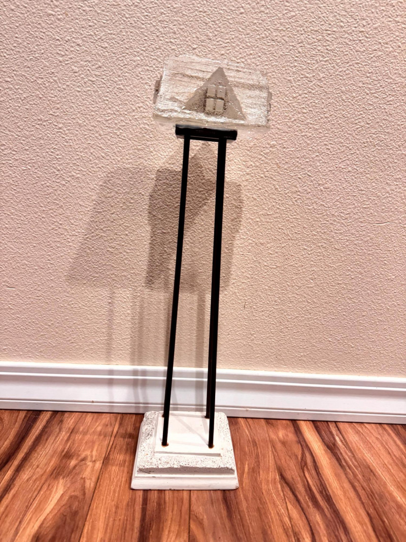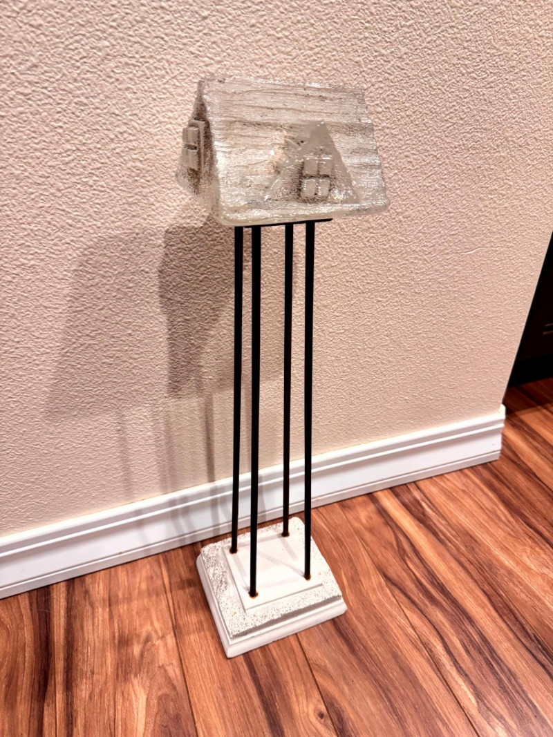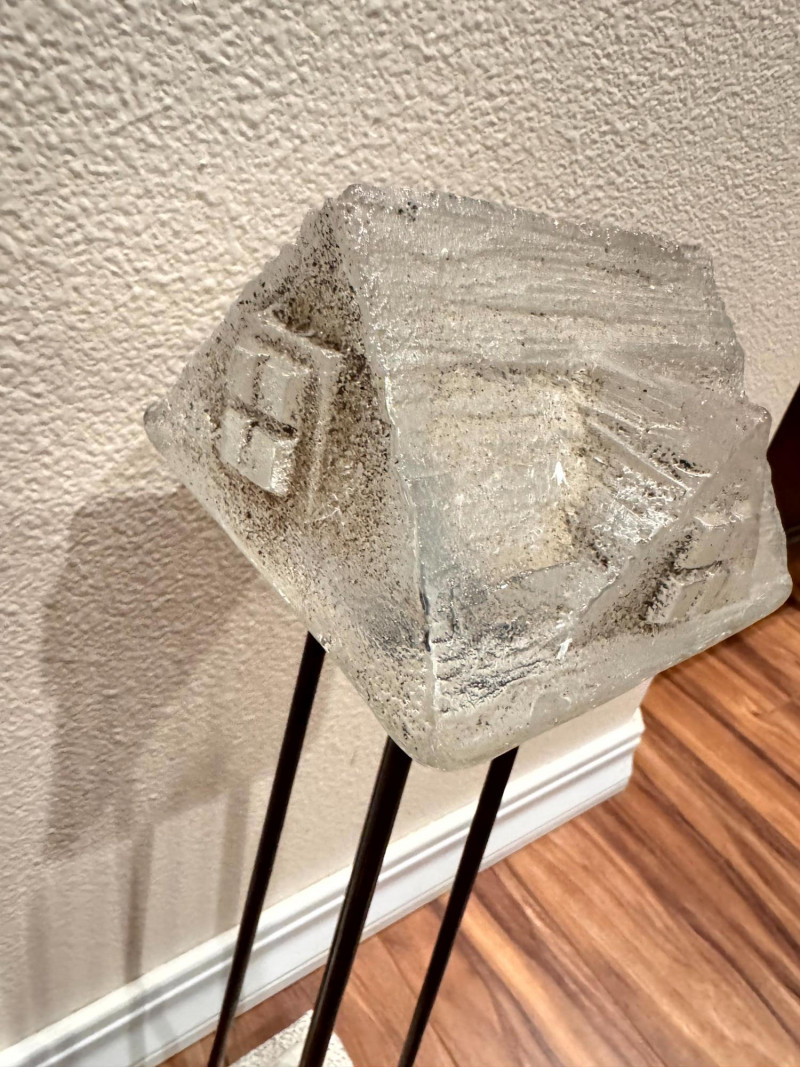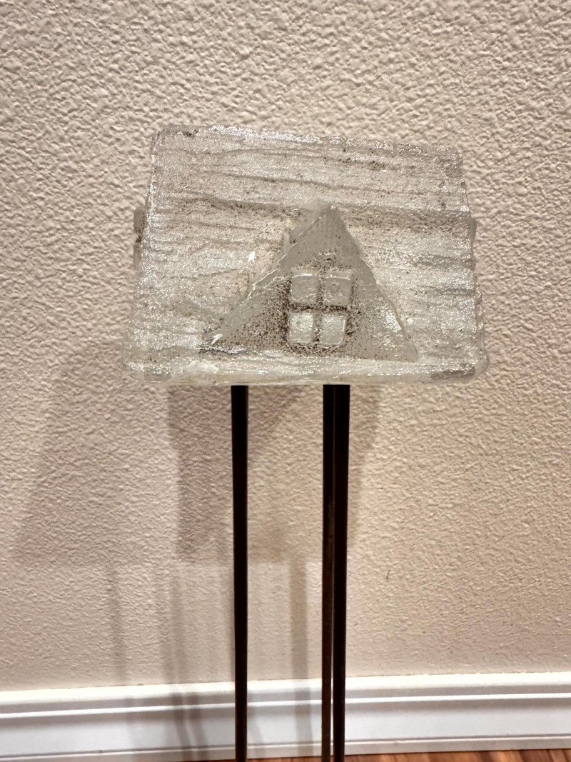 Tall Textured Glass House Sculpture on Iron Rod Base.