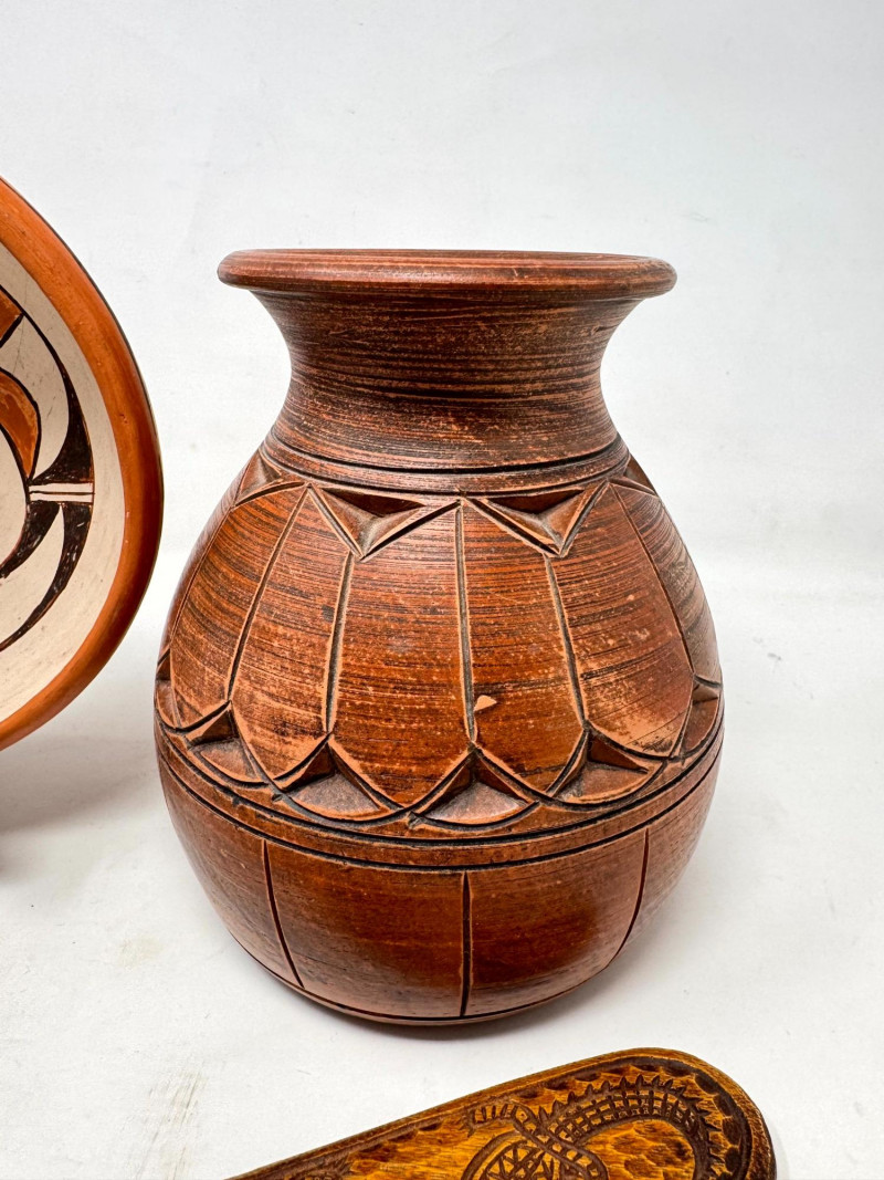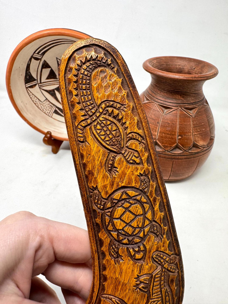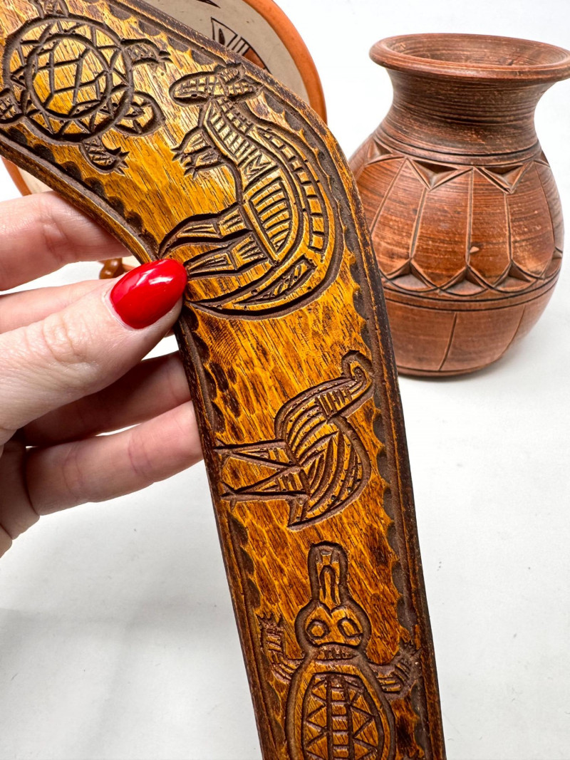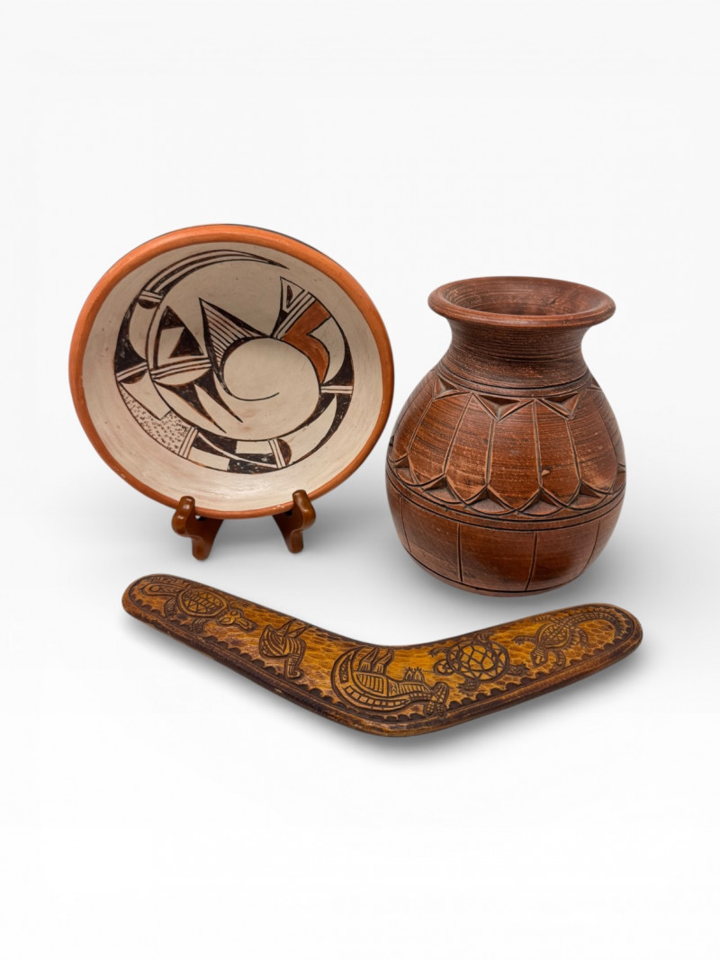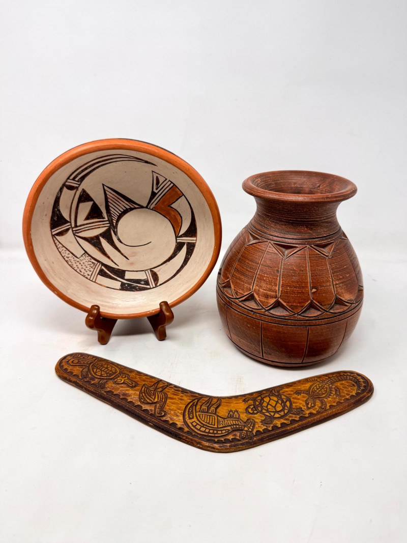 Hopi Polychrome Signed Bowl, F. Rentz Boomerang & Carved Pottery Vase.