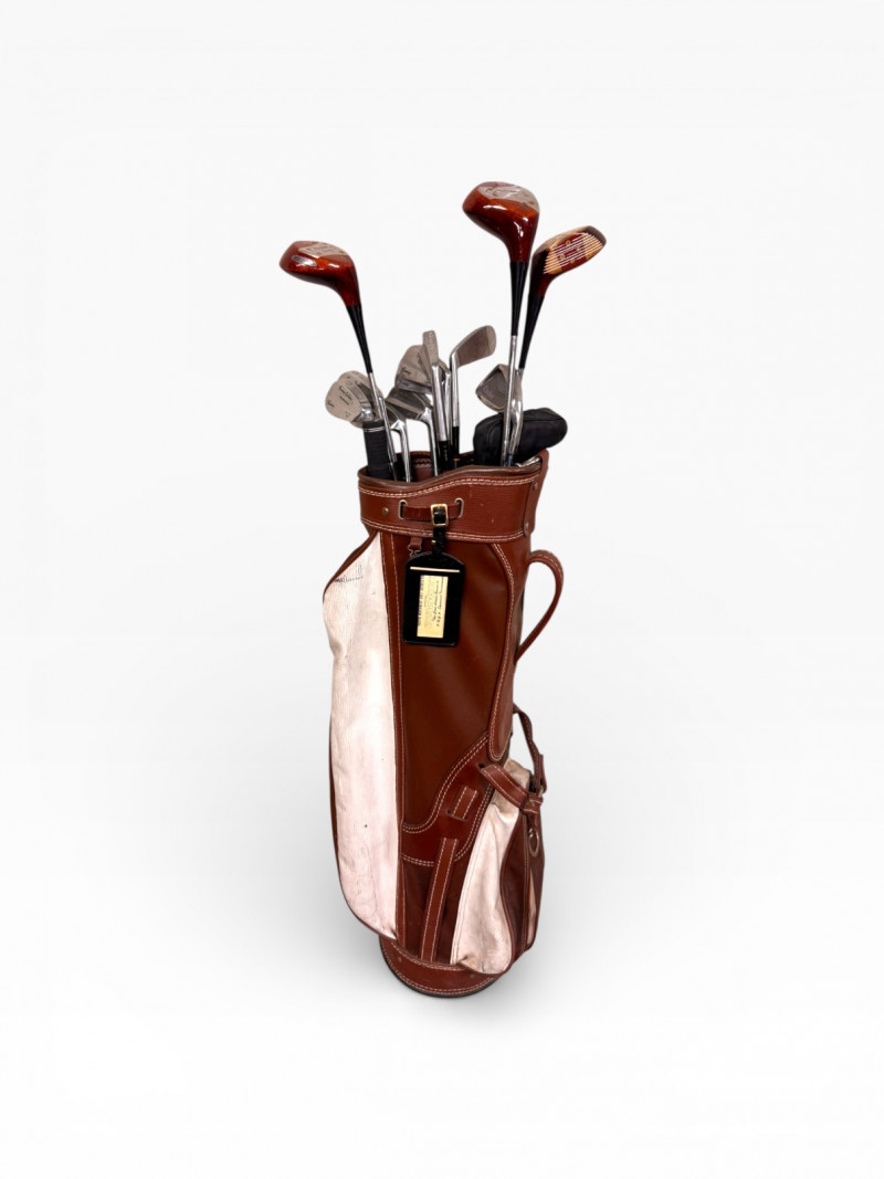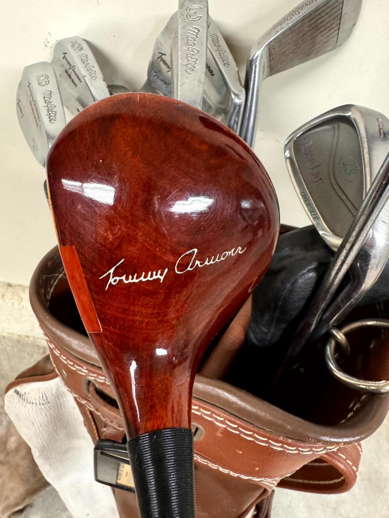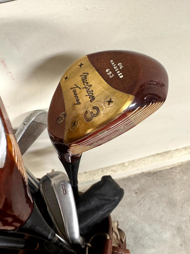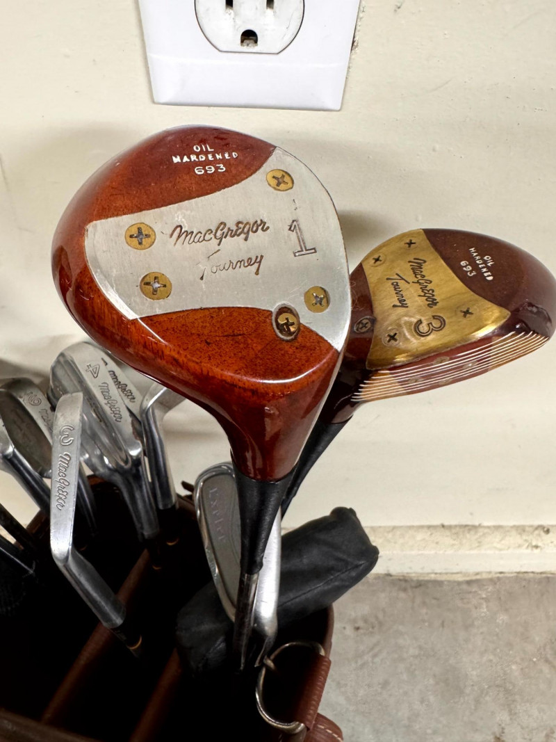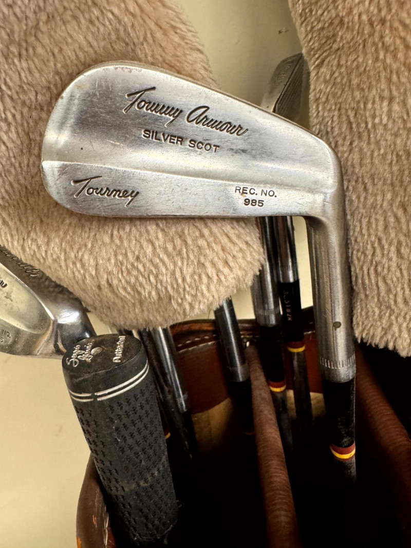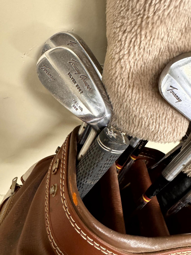 MacGregor Tommy Armour RH Golf Clubs w/ Bag - Right-Handed. MacGregor woods including: 1 Wood – MacGregor Tourney Oil Hardened 693 3 Wood – MacGregor Tourney Oil Hardened 693 Tommy Armour Silver Scot irons Marked “Tommy Armour Silver Scot” Rec. No. 985 Additional MacGregor irons included (see photos) Brown and cream leather golf bag Carry handle and strap Tag attached to bag Includes head covers