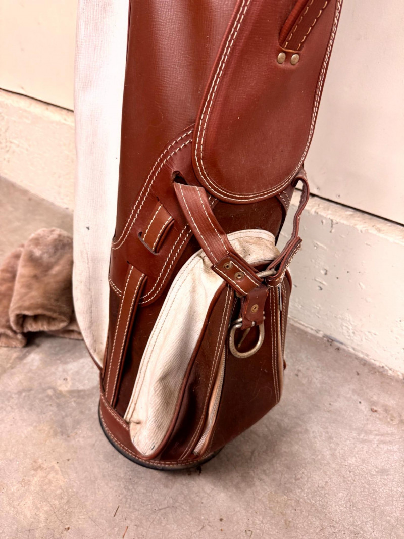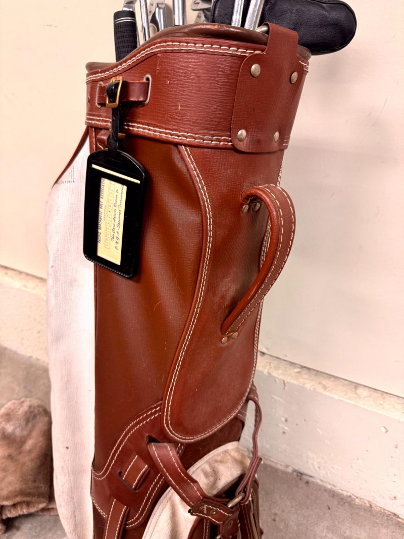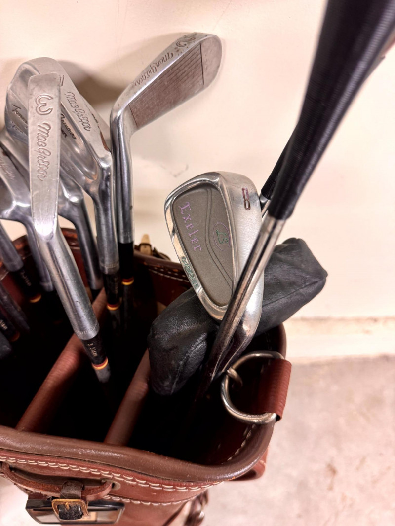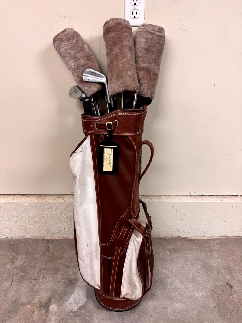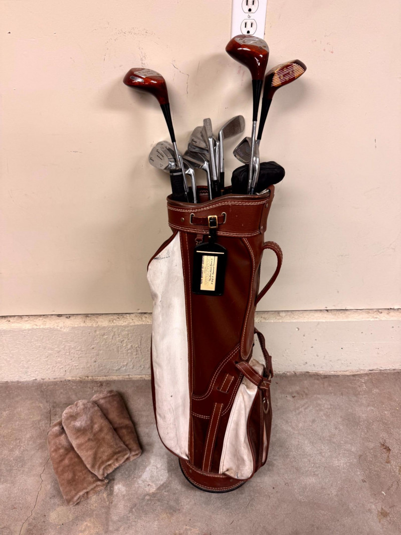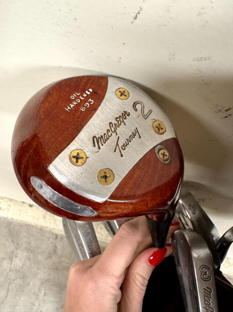 MacGregor Tommy Armour RH Golf Clubs w/ Bag - Right-Handed. MacGregor woods including: 1 Wood – MacGregor Tourney Oil Hardened 693 3 Wood – MacGregor Tourney Oil Hardened 693 Tommy Armour Silver Scot irons Marked “Tommy Armour Silver Scot” Rec. No. 985 Additional MacGregor irons included (see photos) Brown and cream leather golf bag Carry handle and strap Tag attached to bag Includes head covers