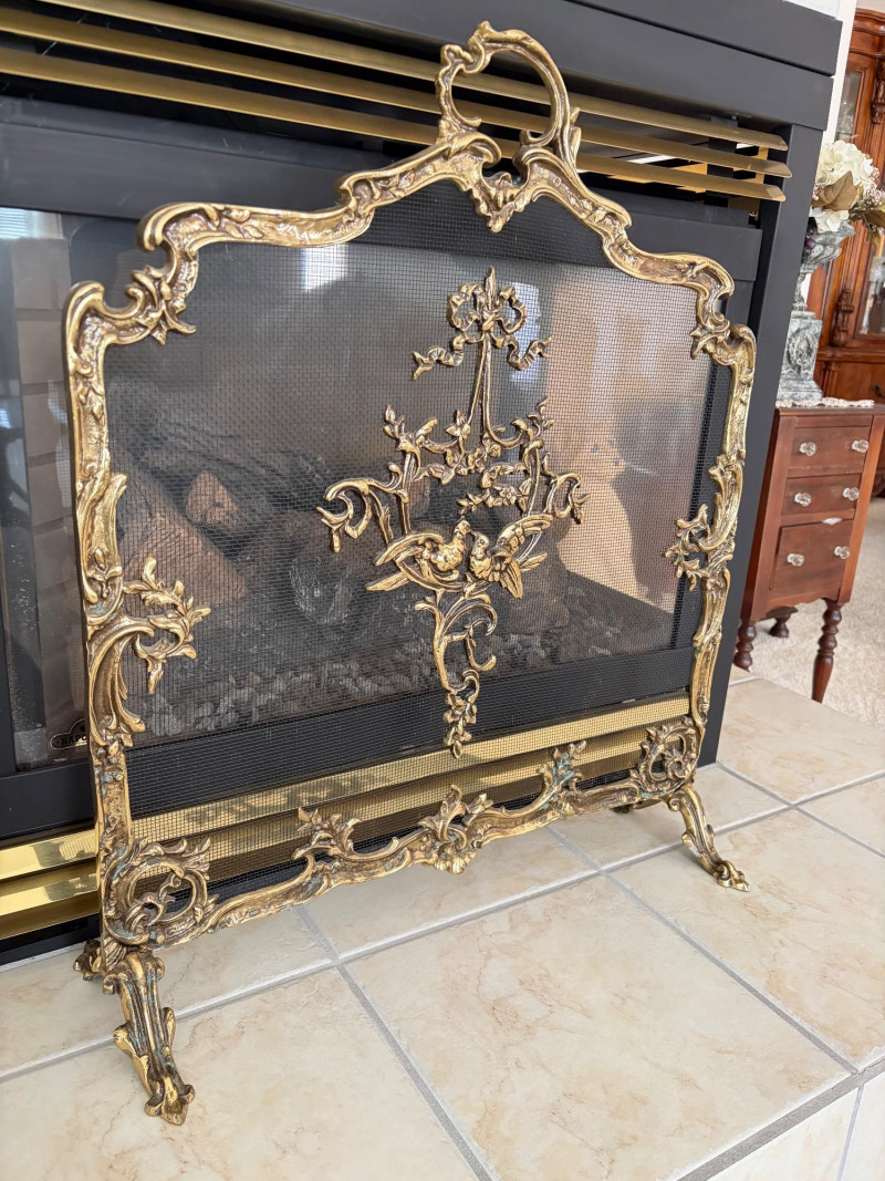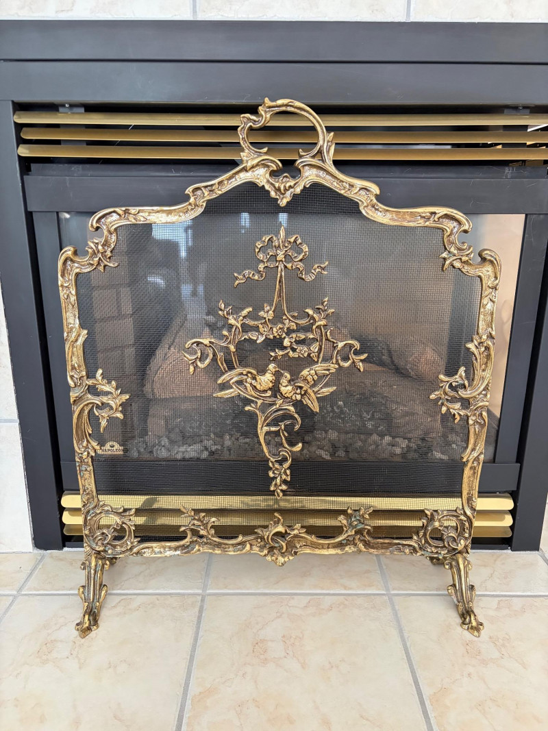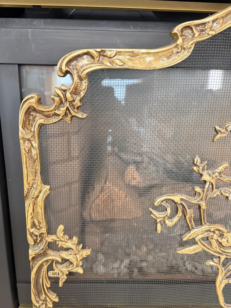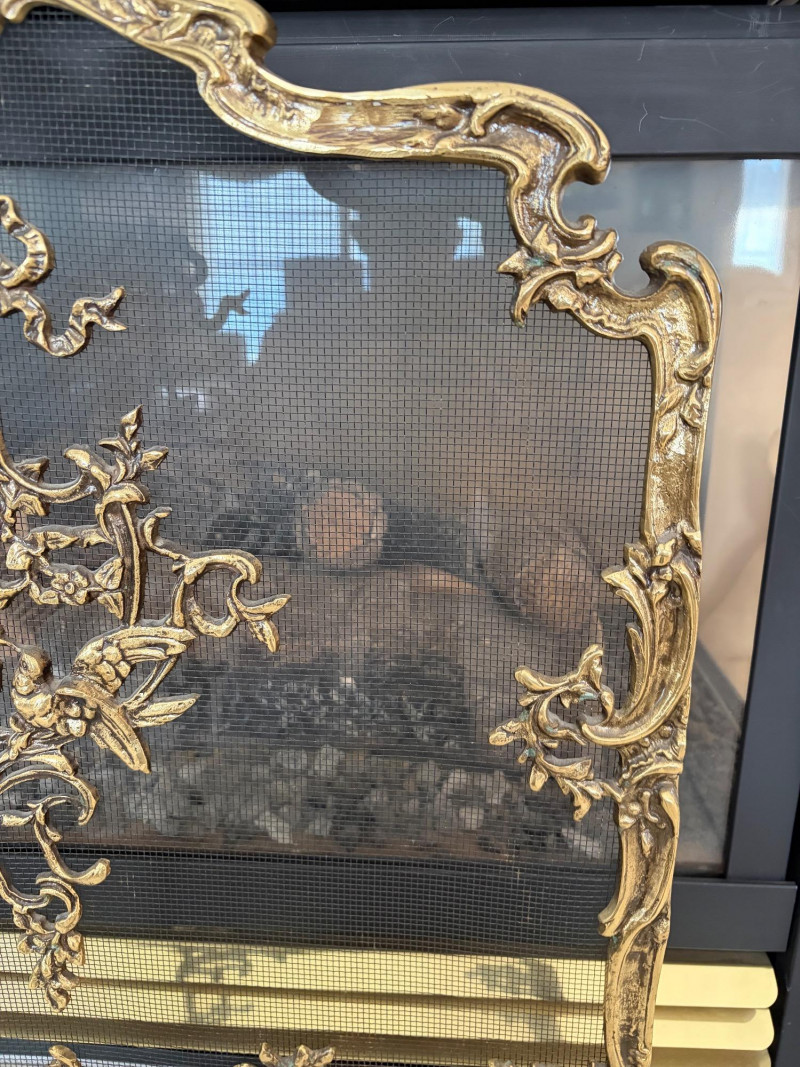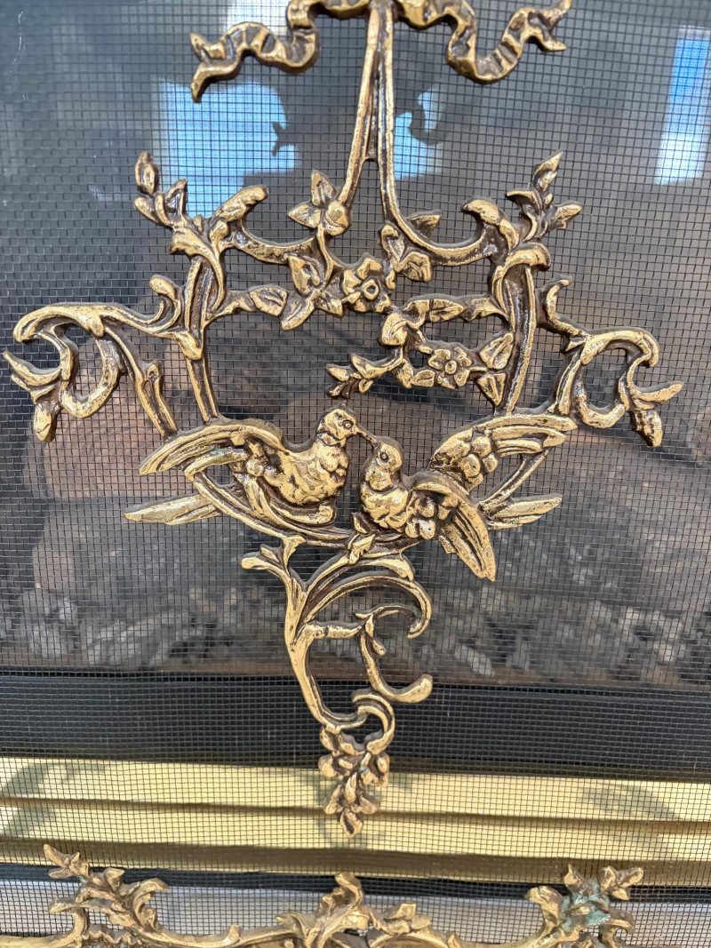 Louis XVI Style Brass Fireplace Screen Ornate Bird Motif.