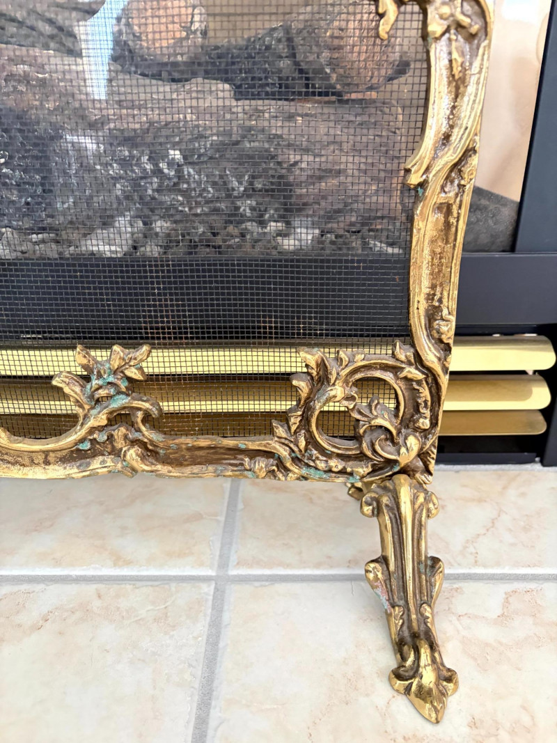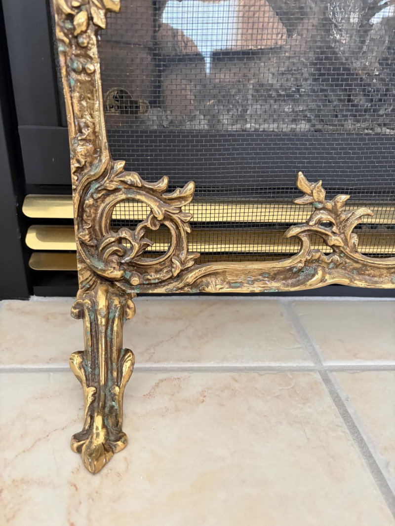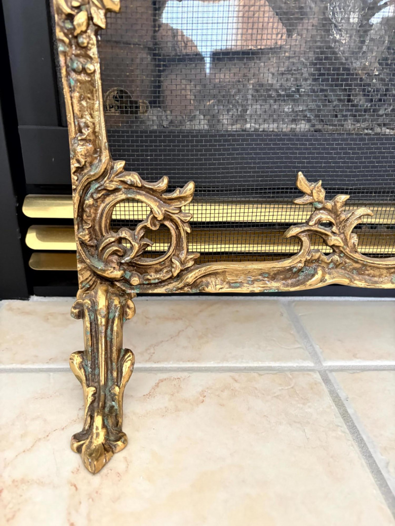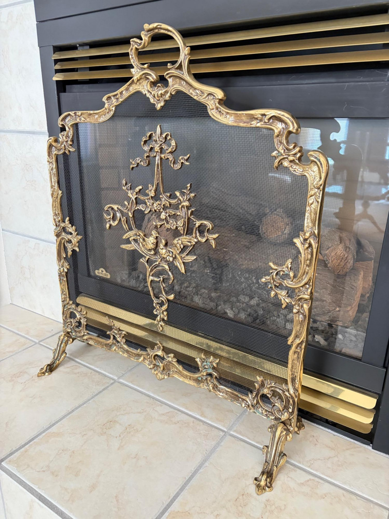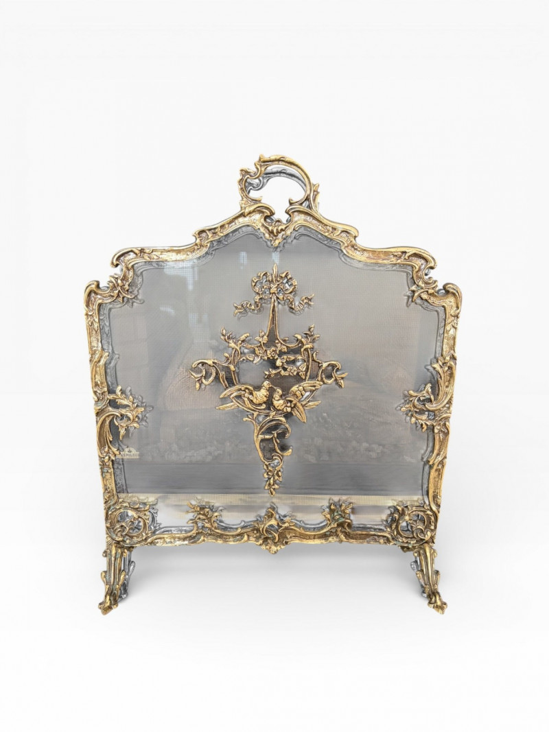 Louis XVI Style Brass Fireplace Screen Ornate Bird Motif.