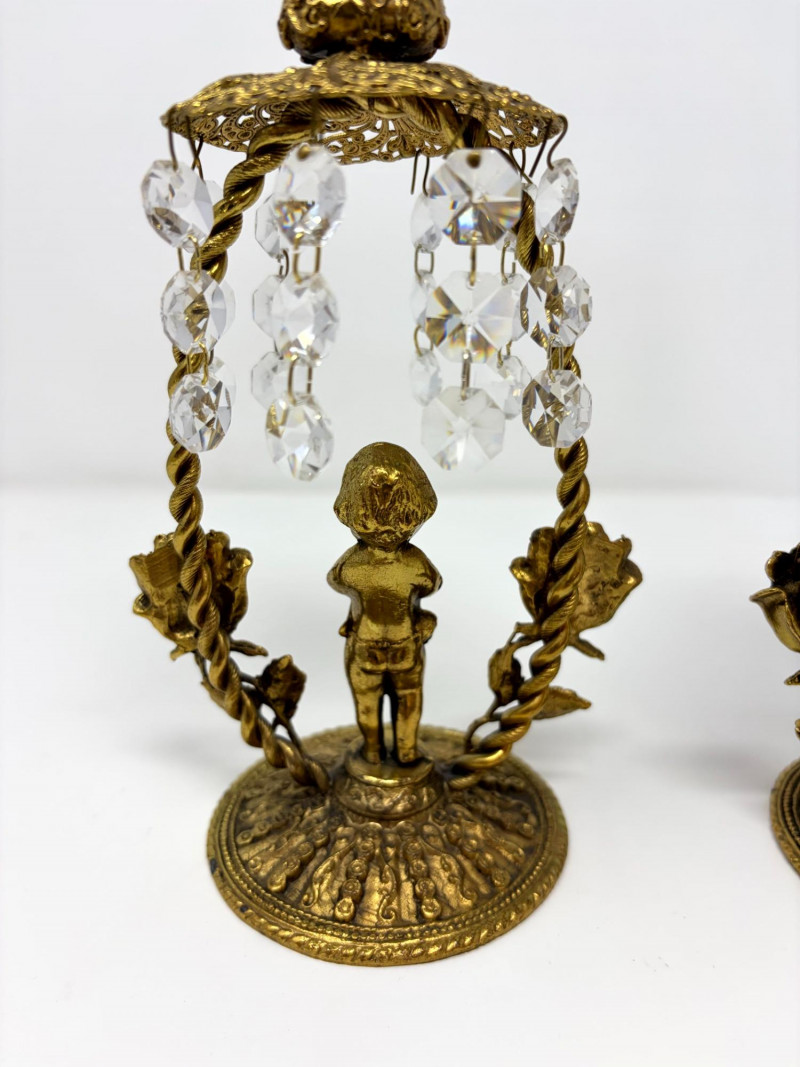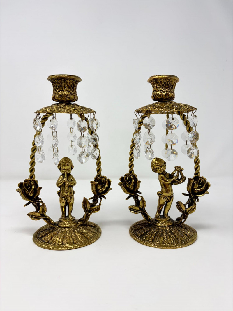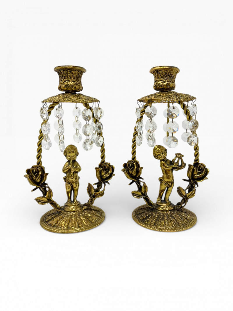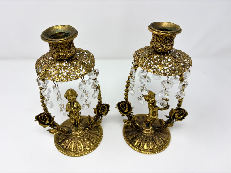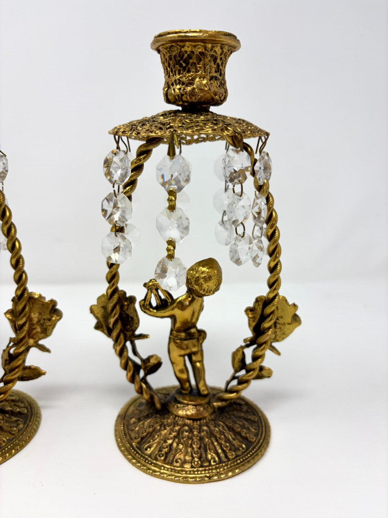 Lot # 12 - Vintage Gilt Cherub Candlesticks w/ Hanging Crystals – Pair