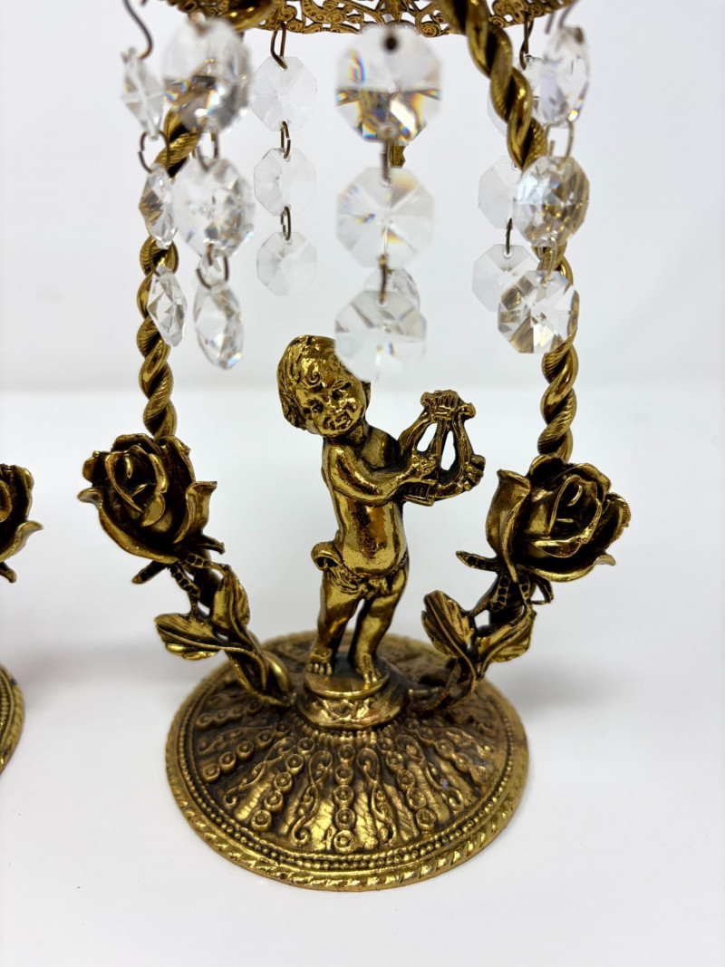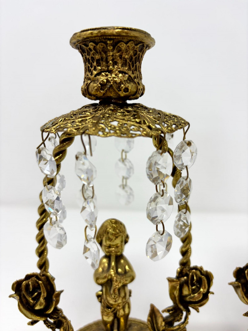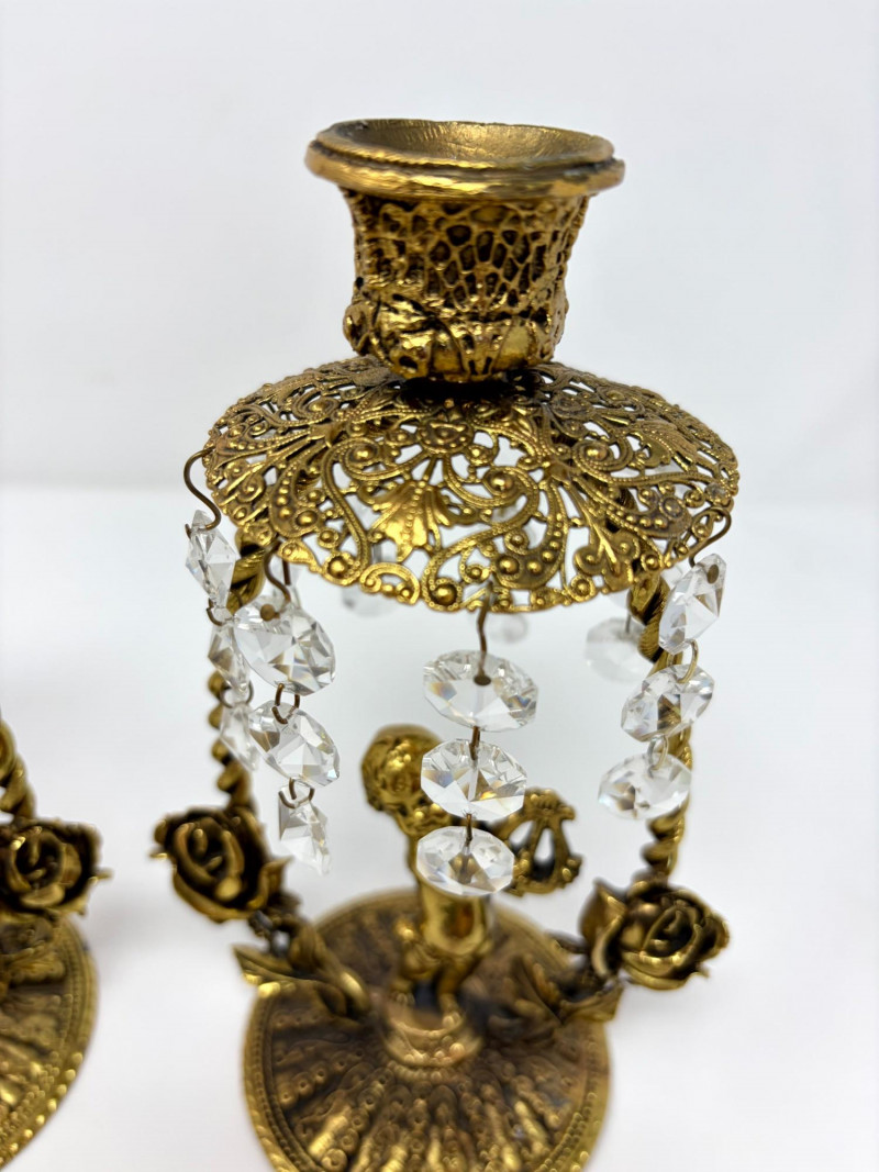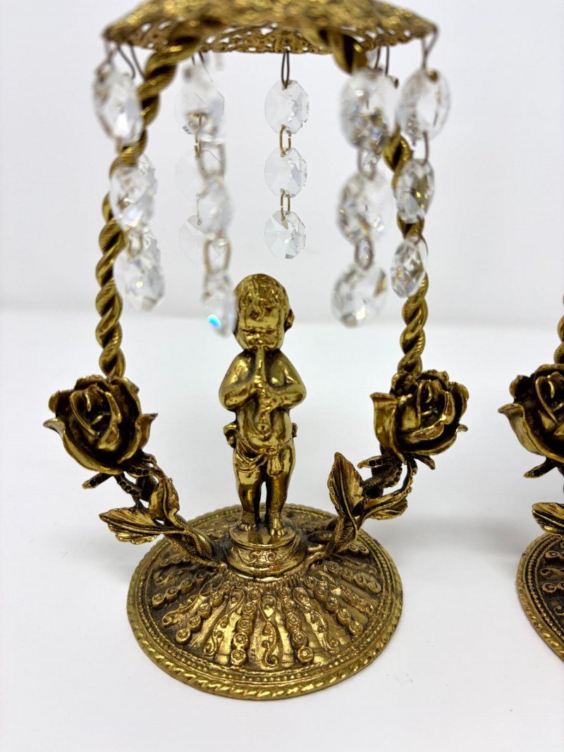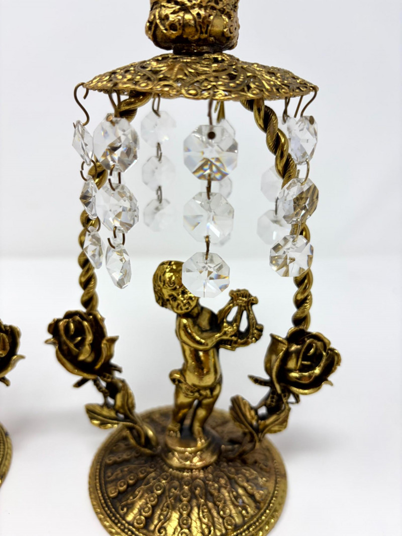 Lot # 12 - Vintage Gilt Cherub Candlesticks w/ Hanging Crystals – Pair