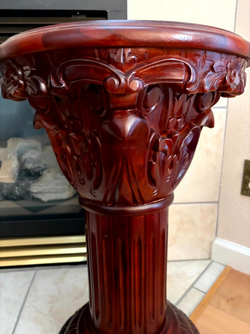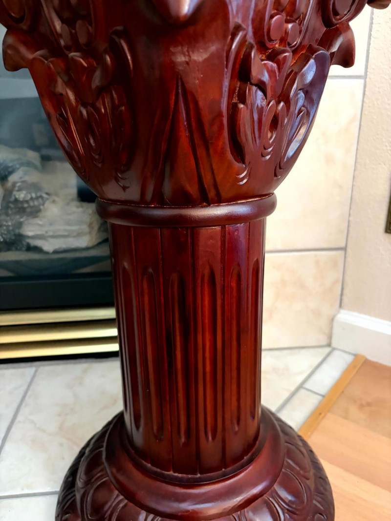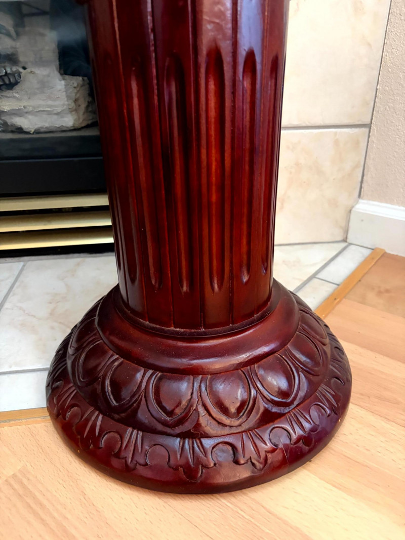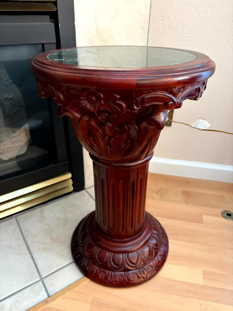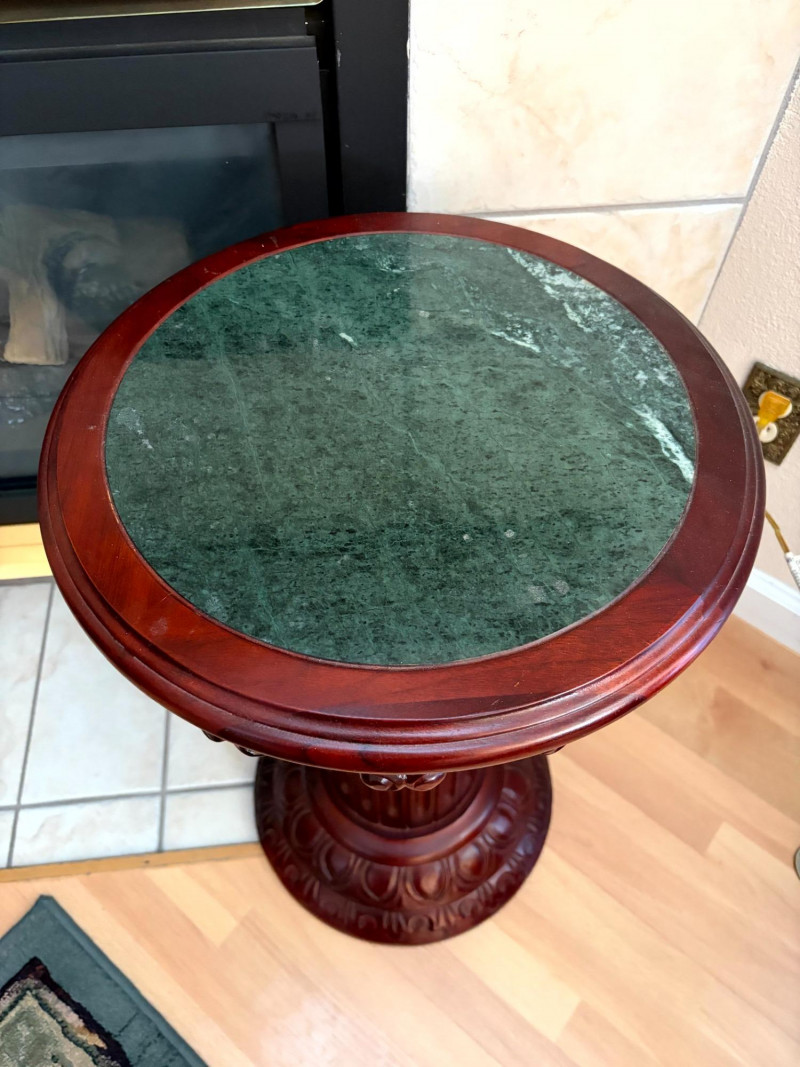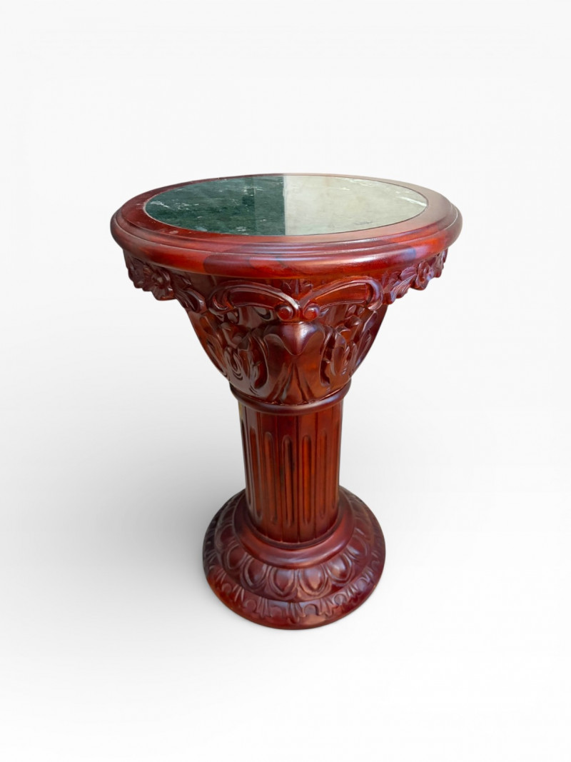 Carved Cherry Finish Pedestal Stand w/ Green Marble Top.