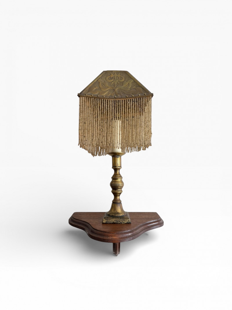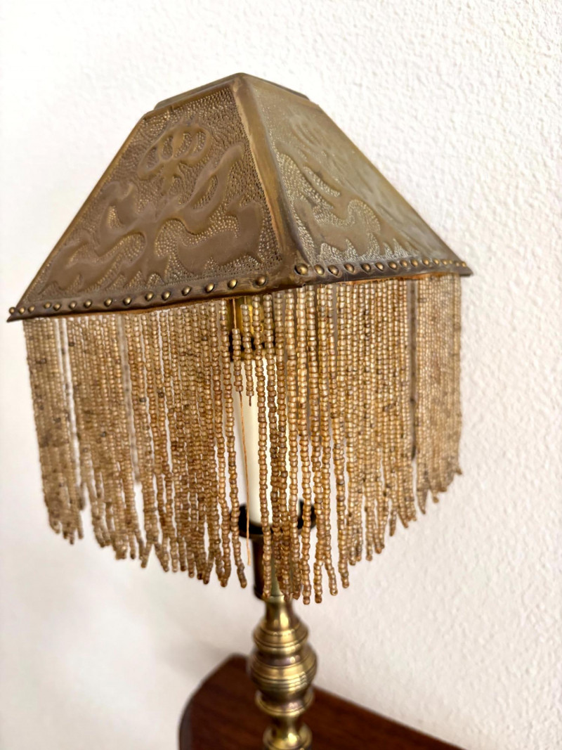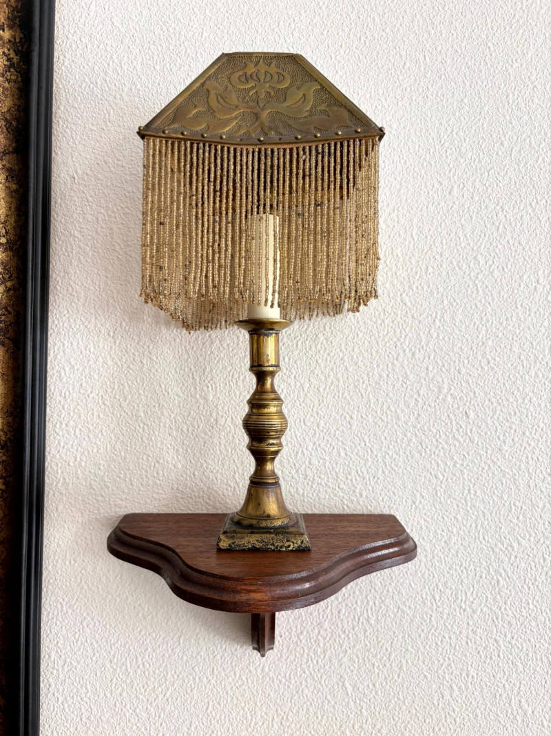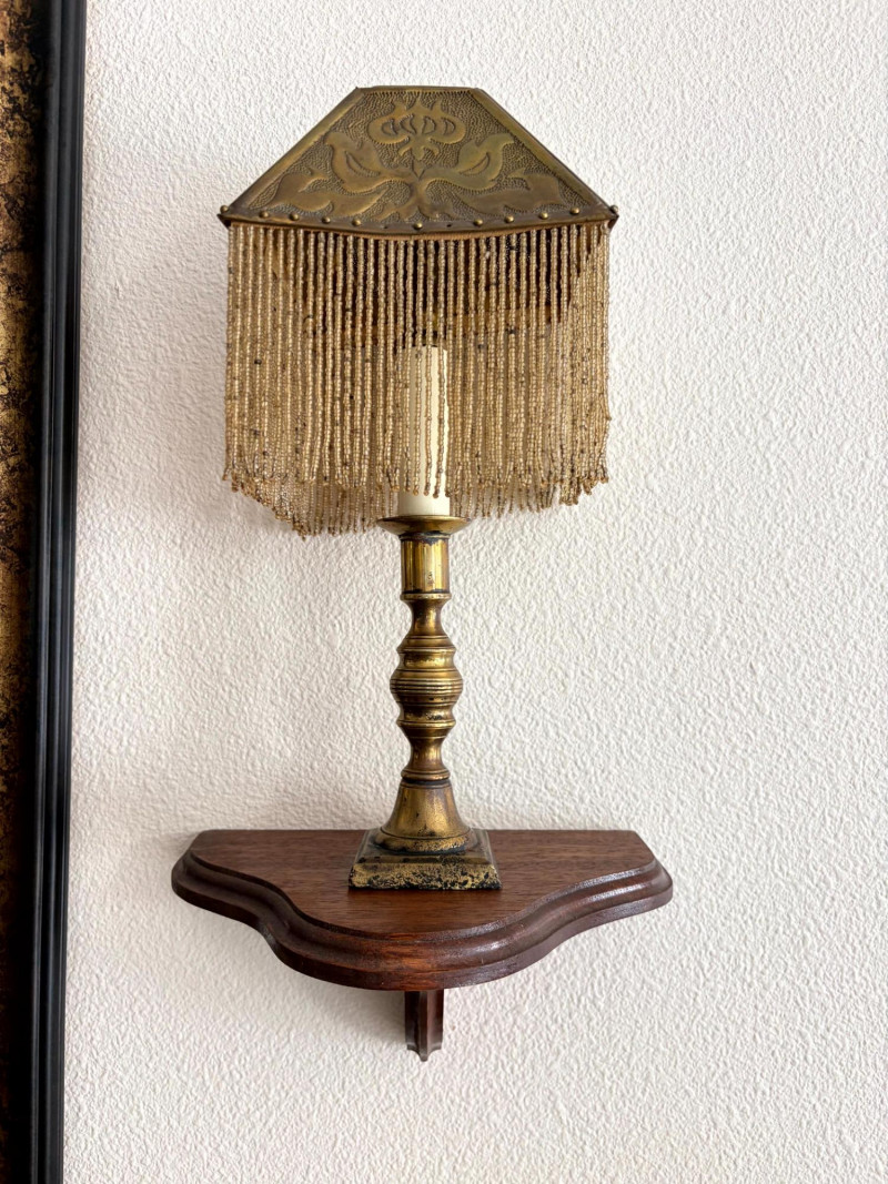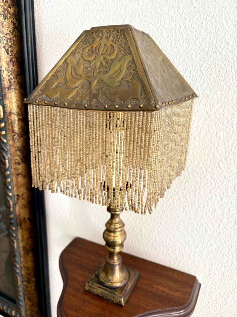 Antique Beaded Table Lamps w/ Embossed Metal Shades & Wall Shelves.