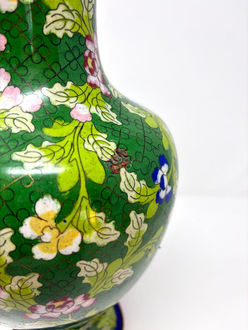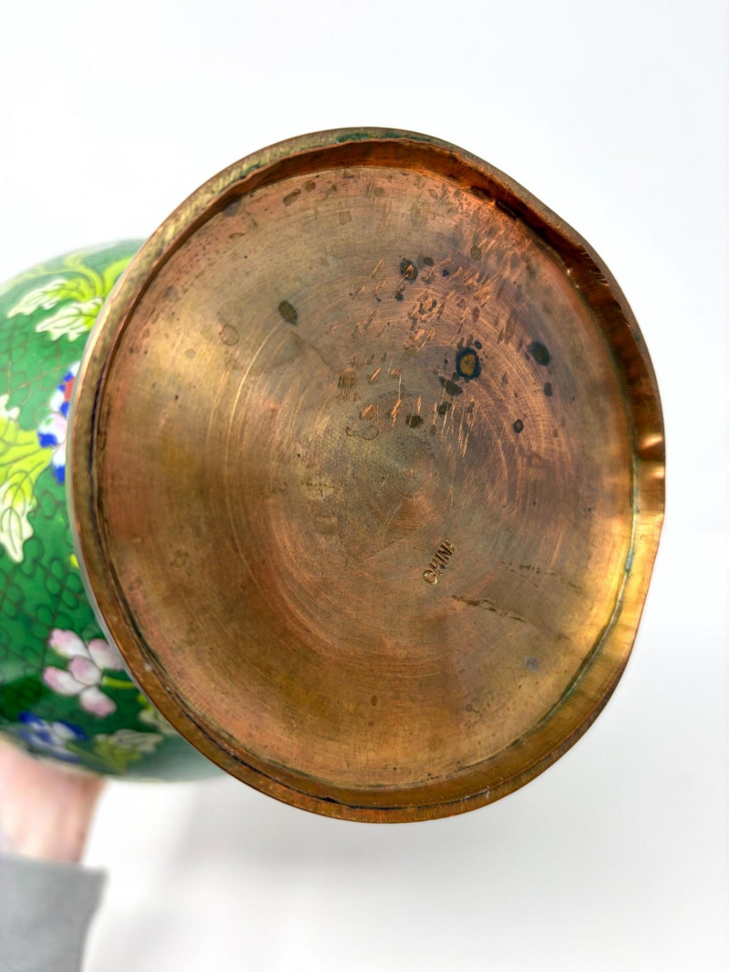 Vintage Green Cloisonné Enamel Vase w/ Floral Motif.