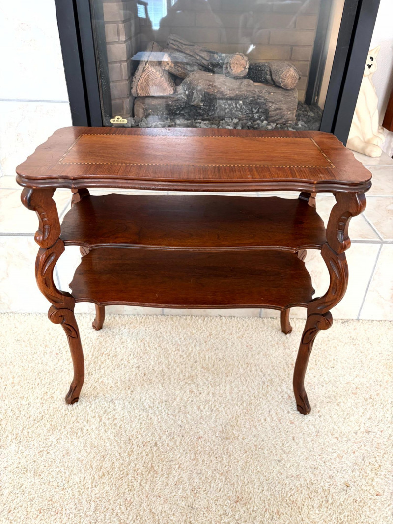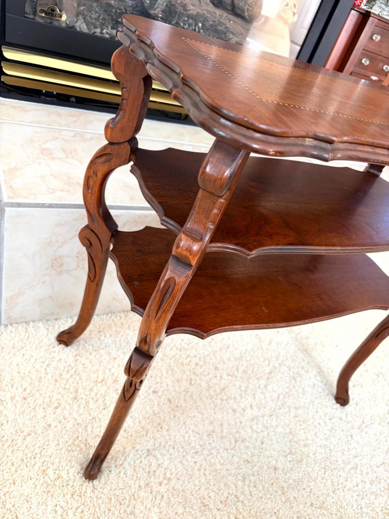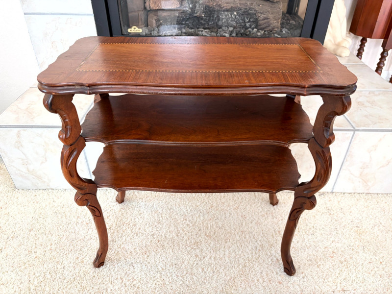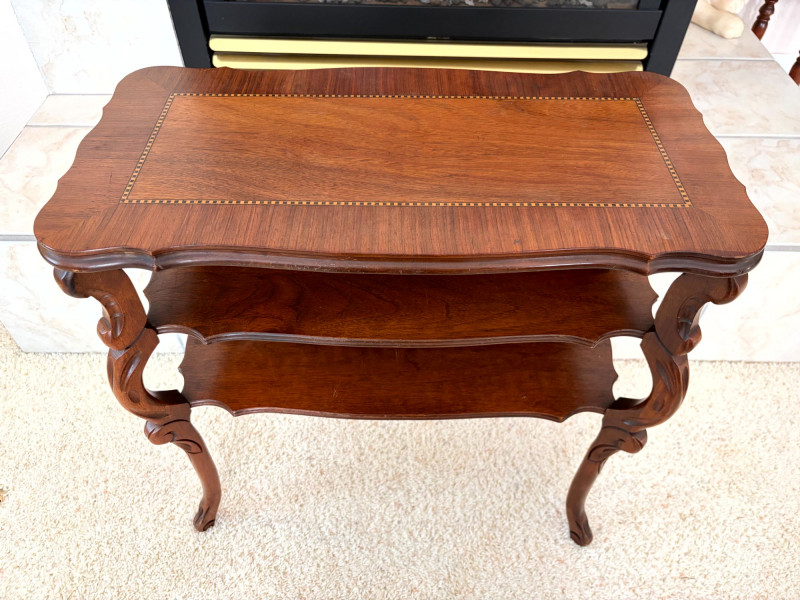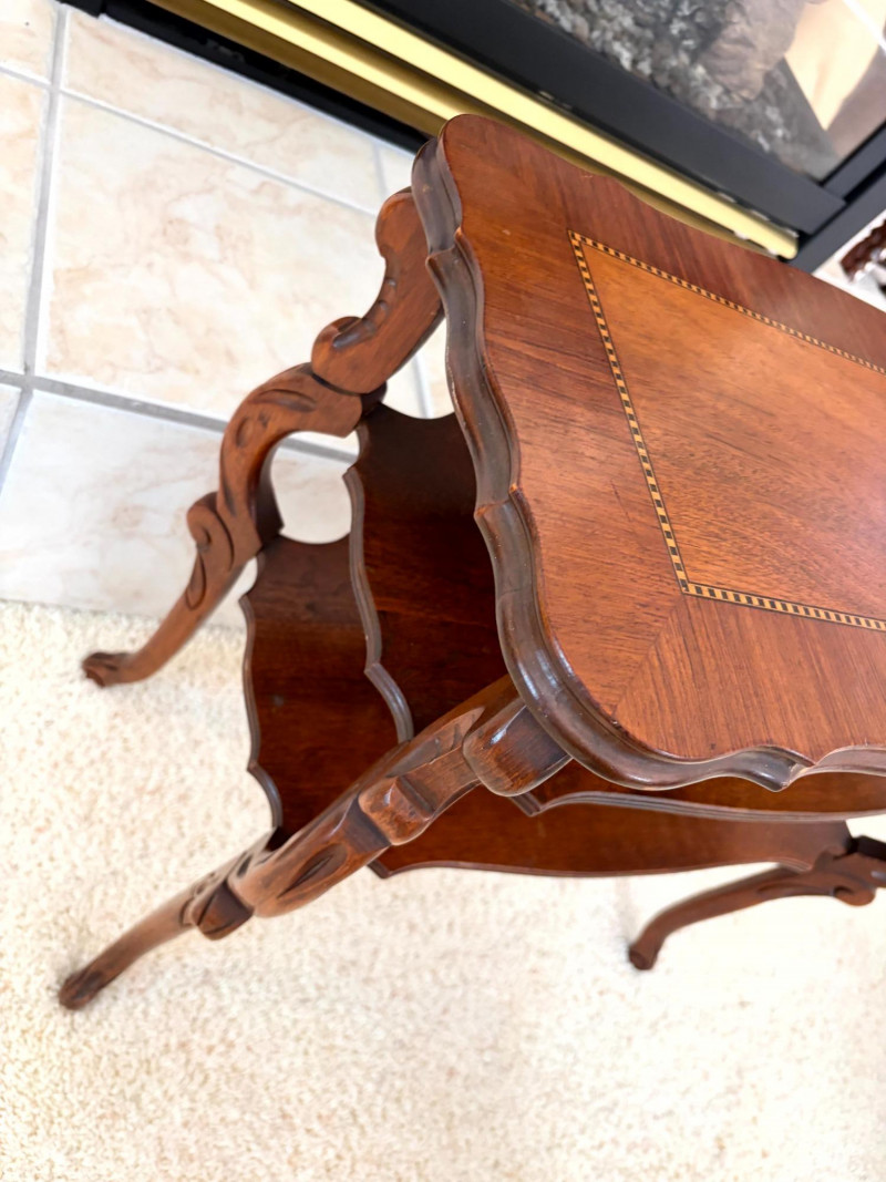 Petite Antique Inlaid Wood End Table w/ Two-Tier Shelf.