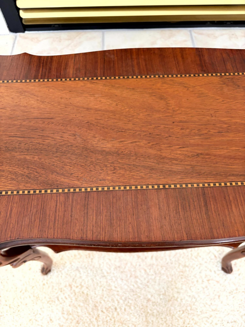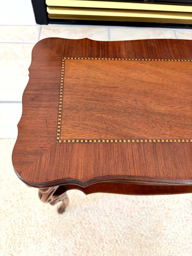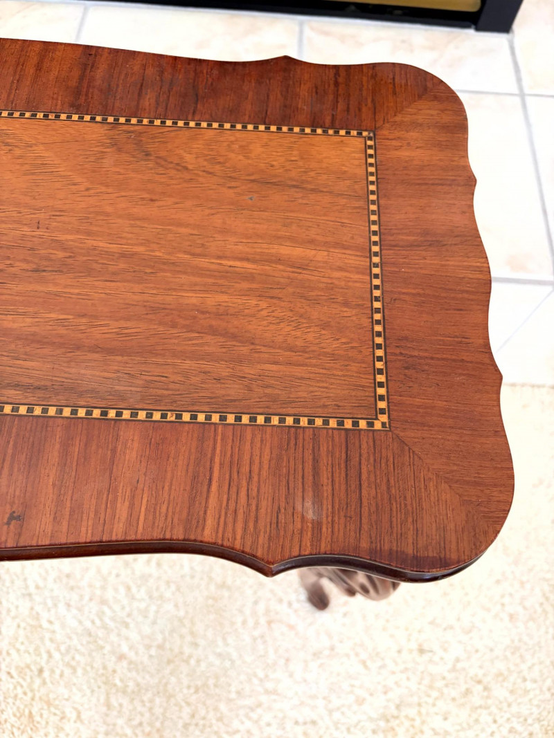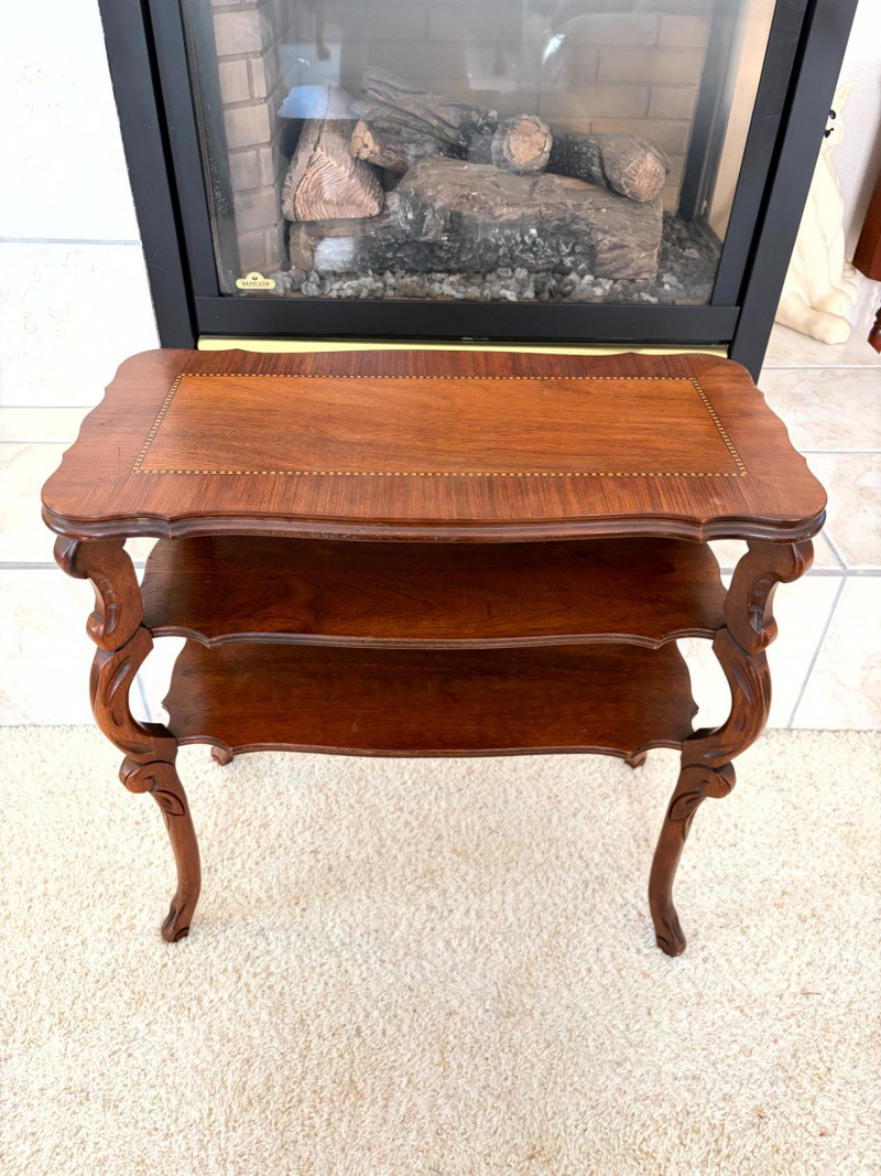 Petite Antique Inlaid Wood End Table w/ Two-Tier Shelf.