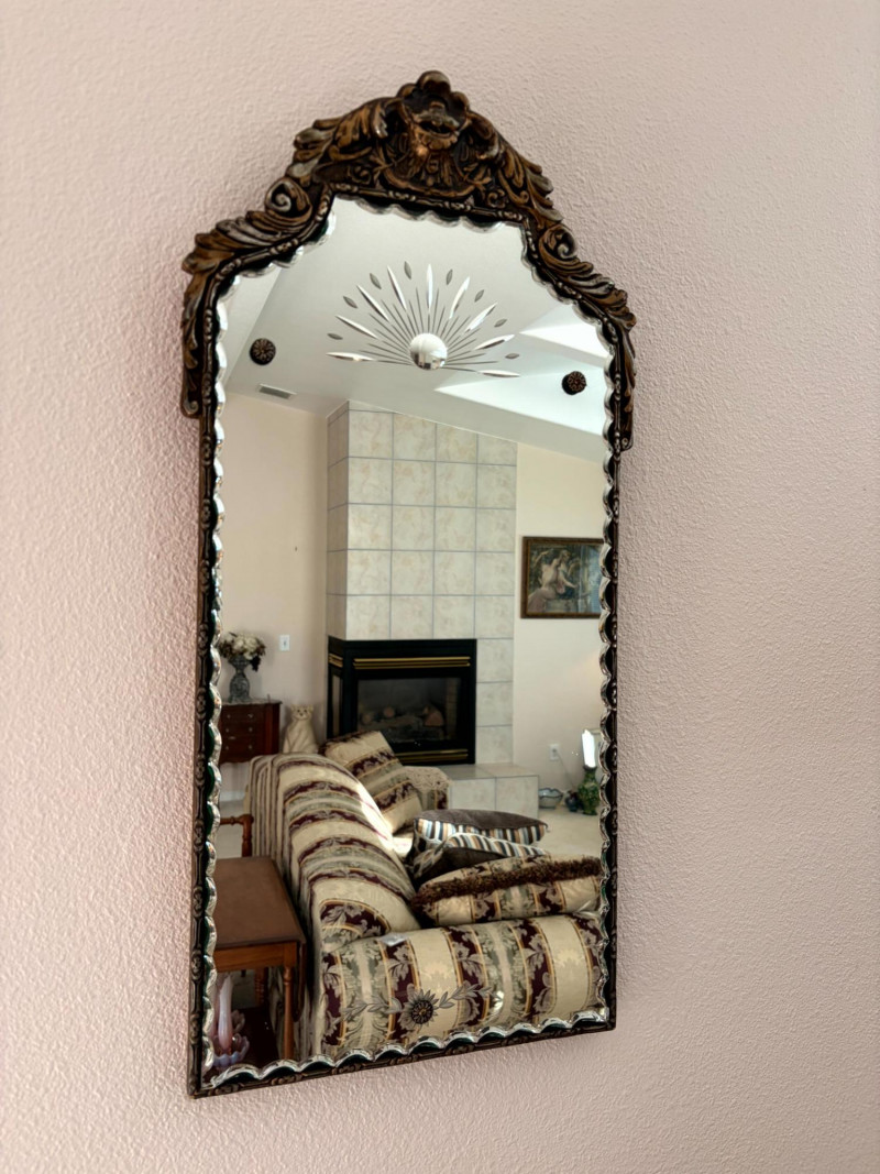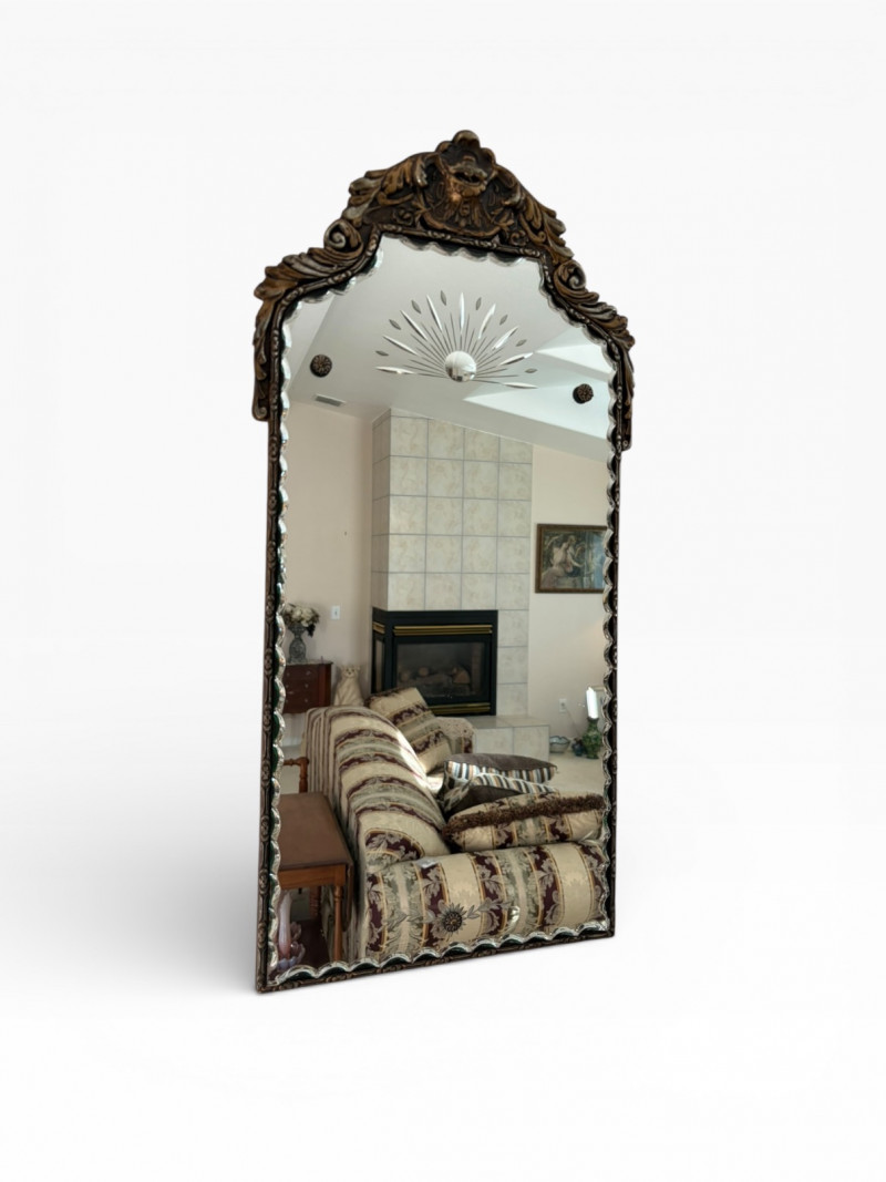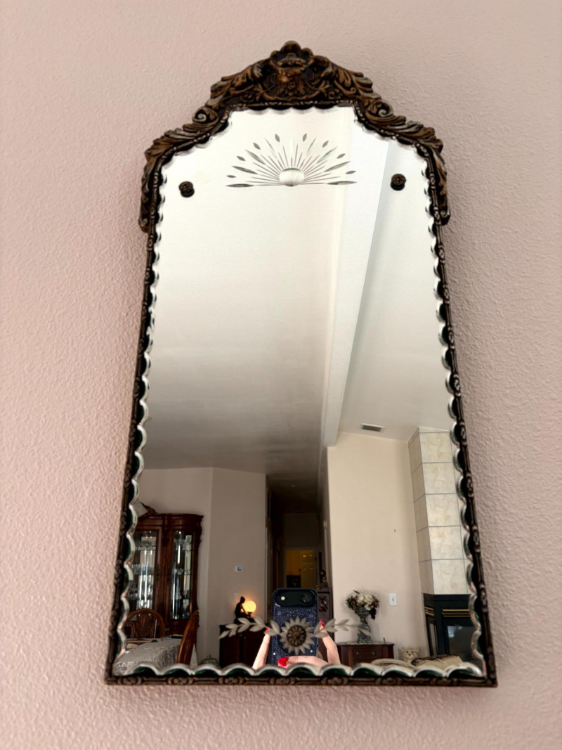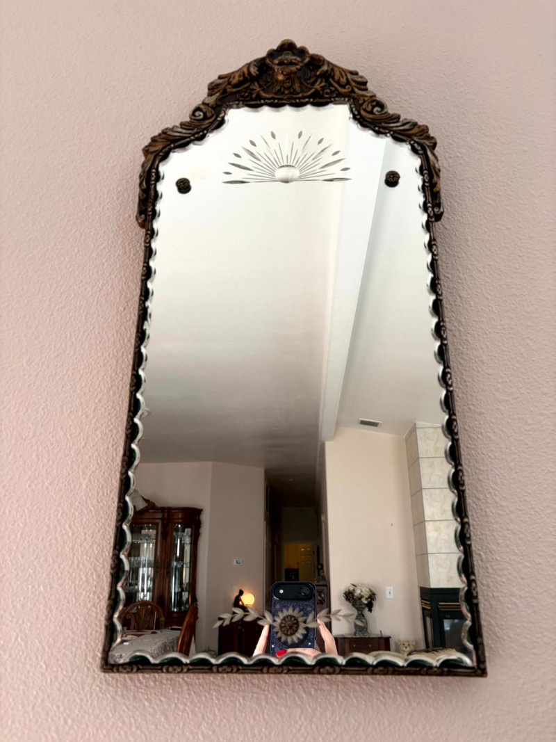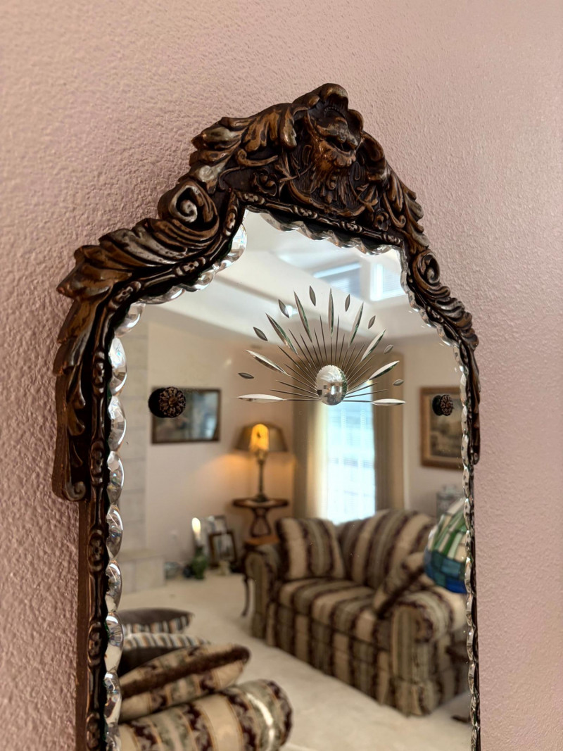 Antique Regency Wall Mirror w/ Etched Sunburst & Ornate Frame.