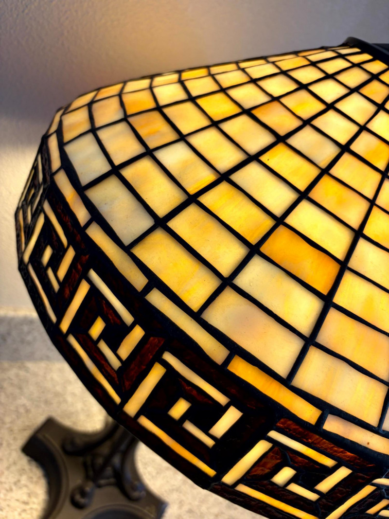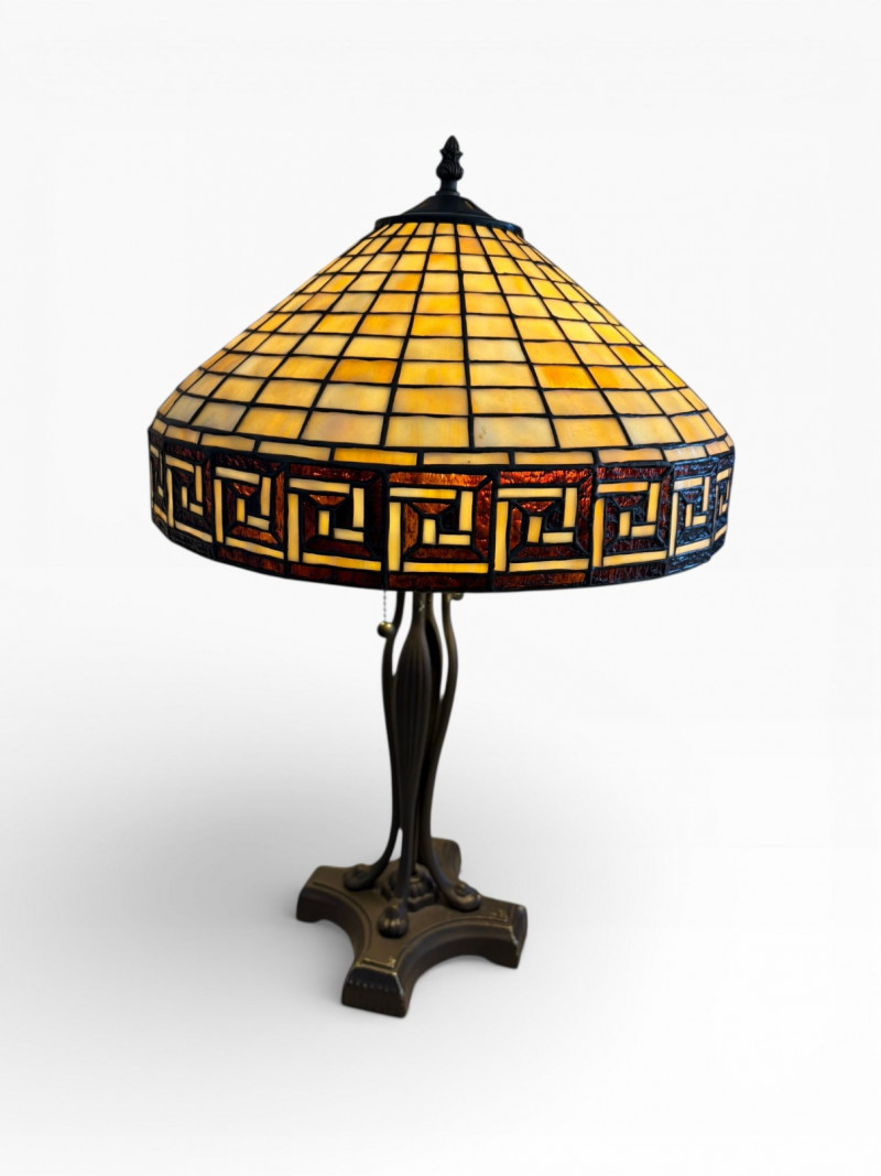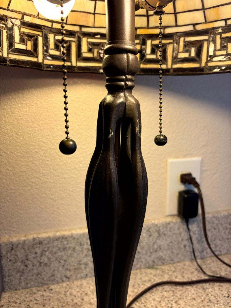 Lot # 25 - Tiffany Style Slag Glass Table Lamp w/ Sculpted Metal Claw Foot Base