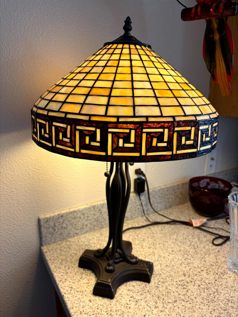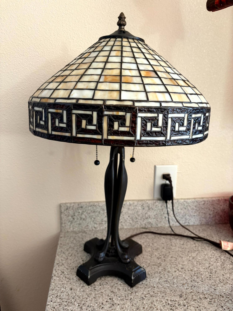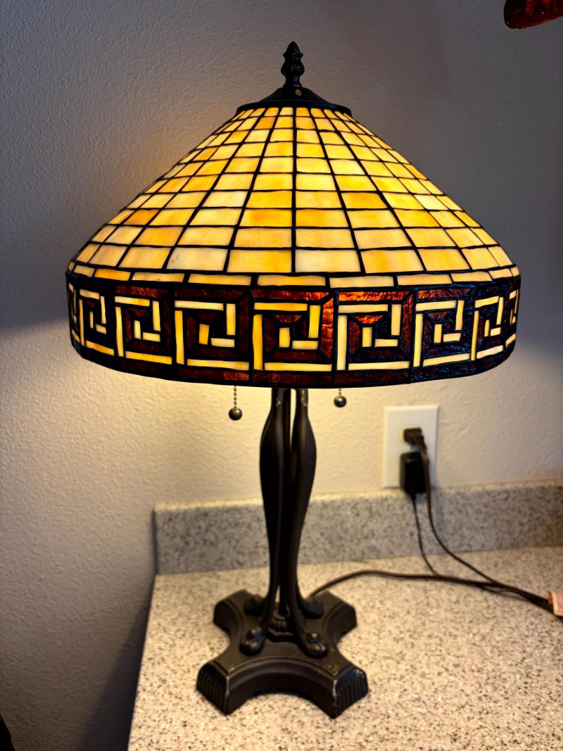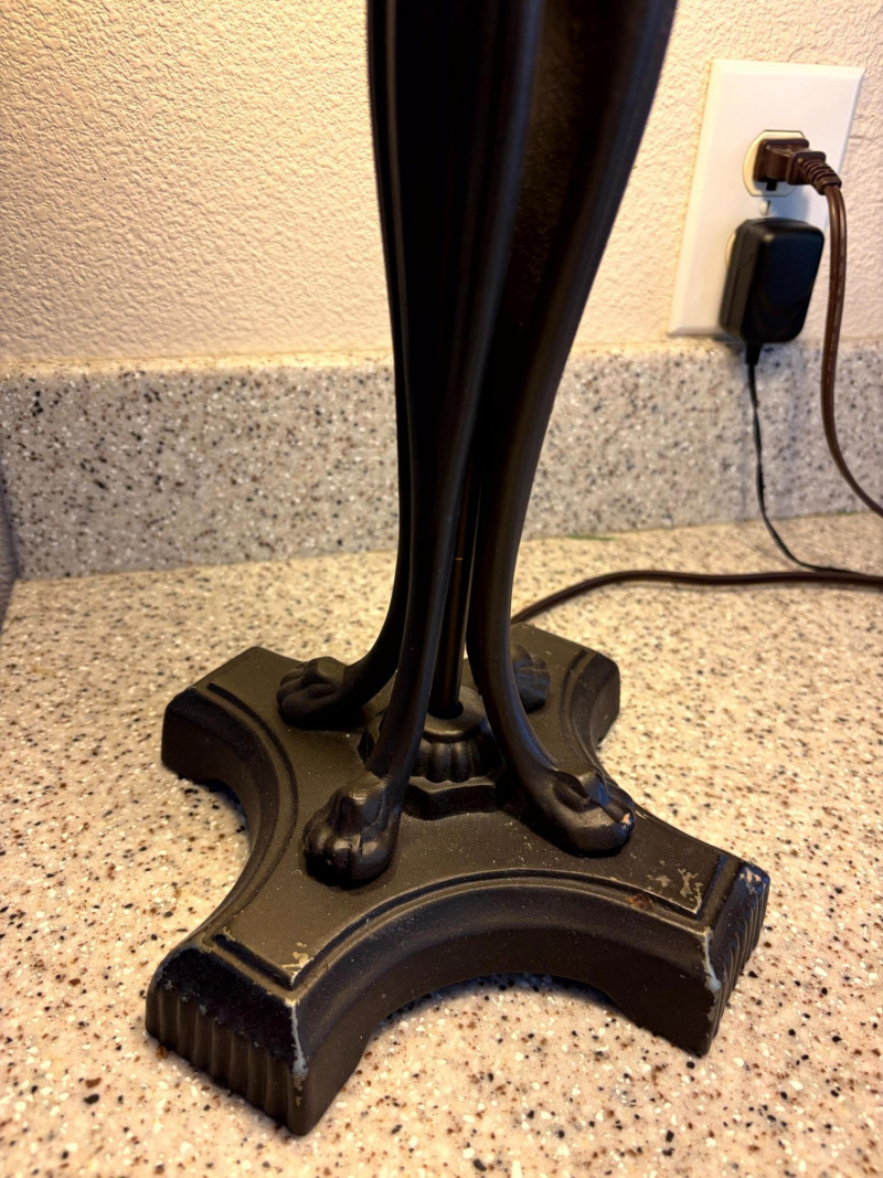 Tiffany Style Slag Glass Table Lamp w/ Sculpted Metal Claw Foot Base.