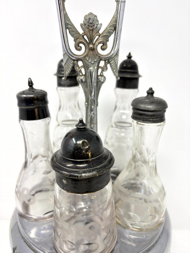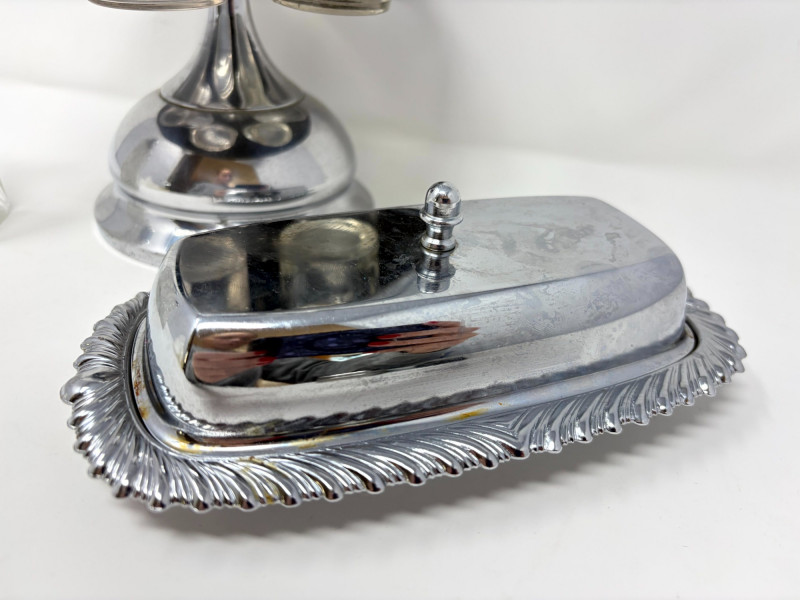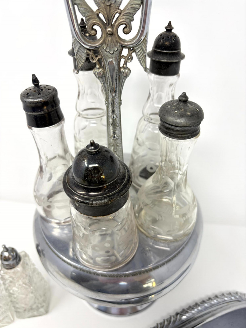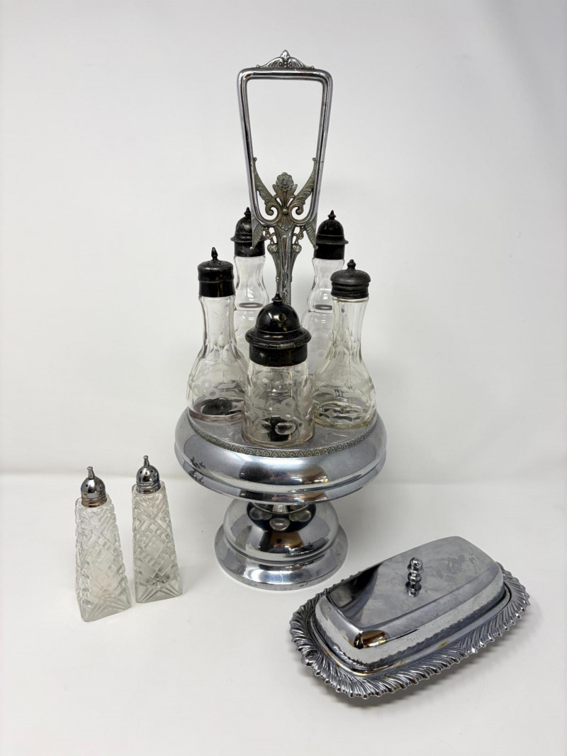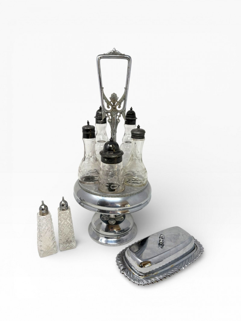 Lot # 28 - Victorian Style Castor Set, Condiment Bottles & Irvinware Butter Dish