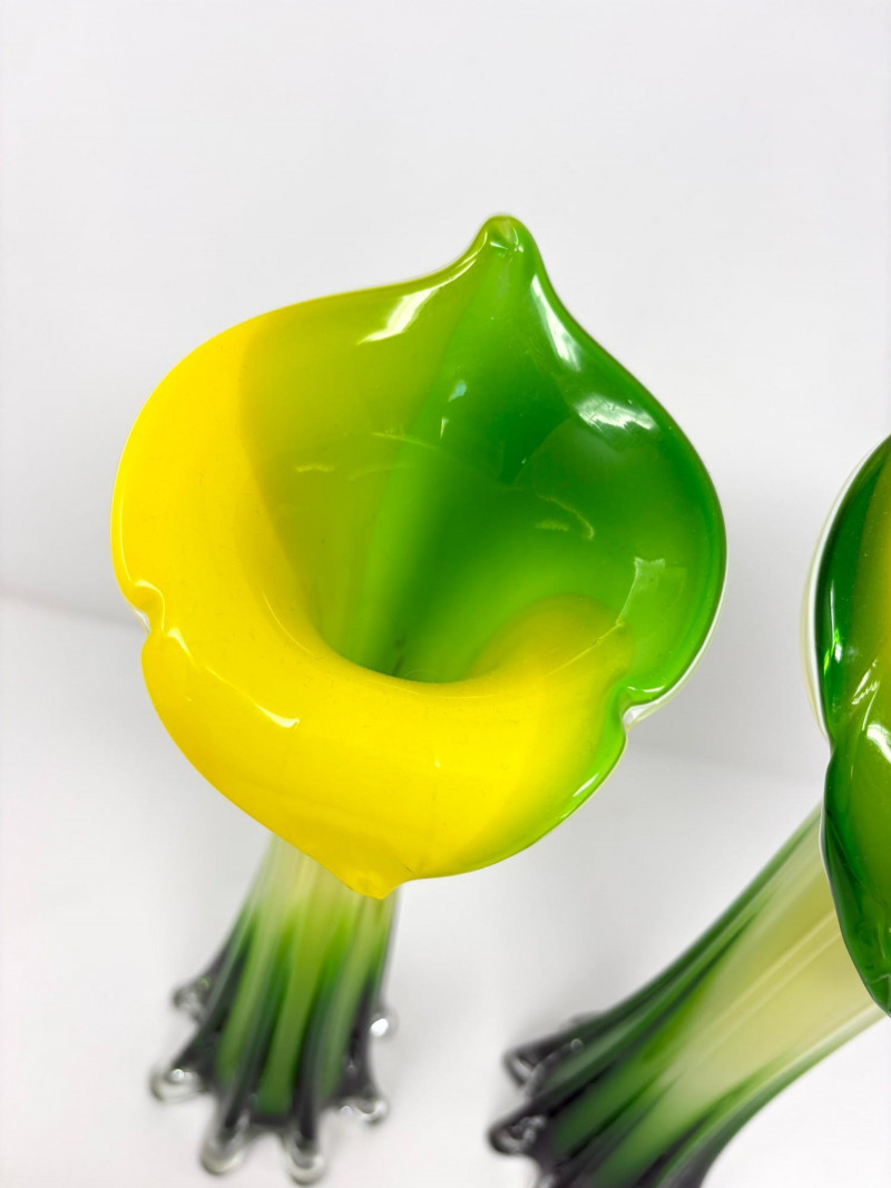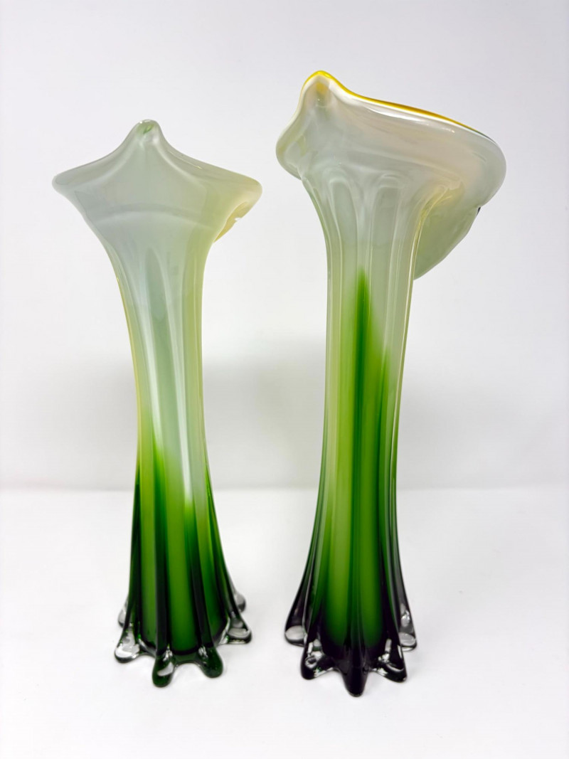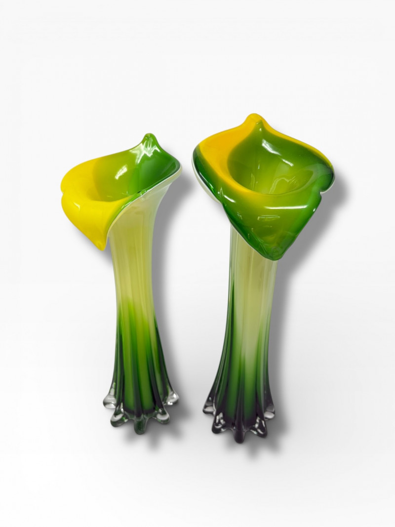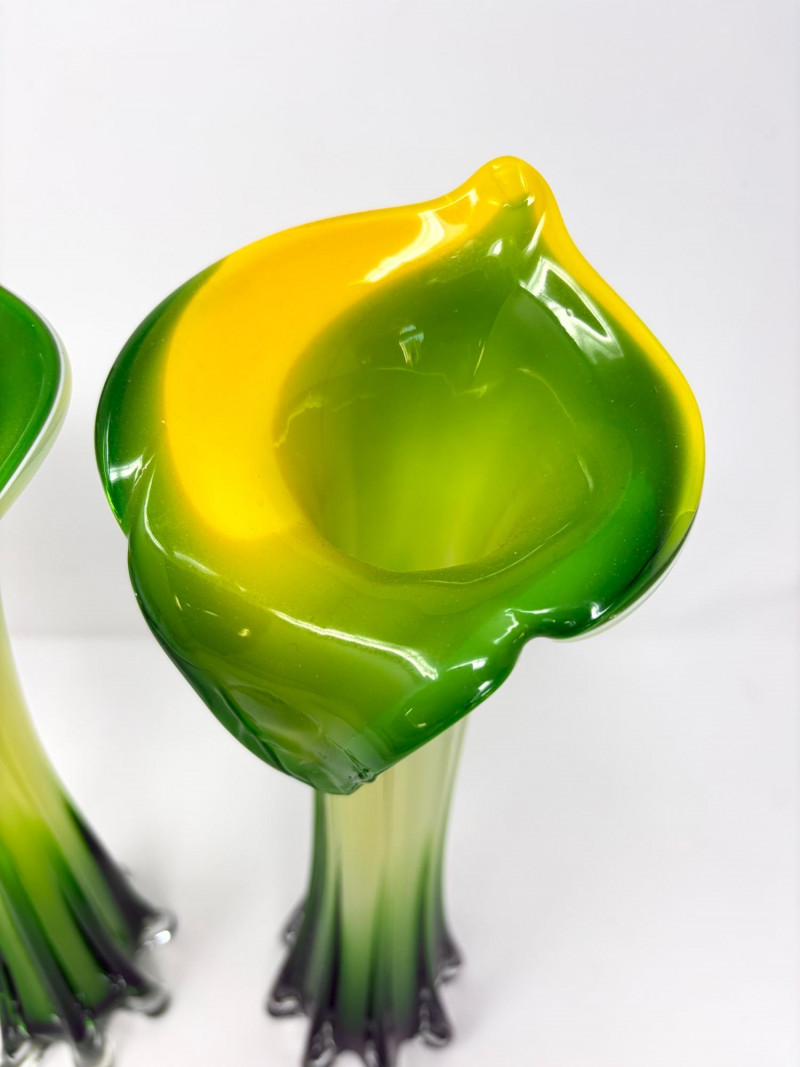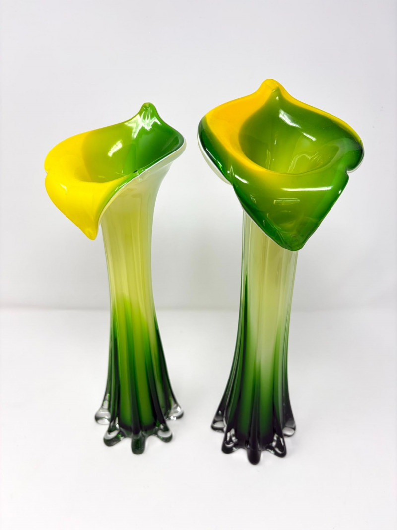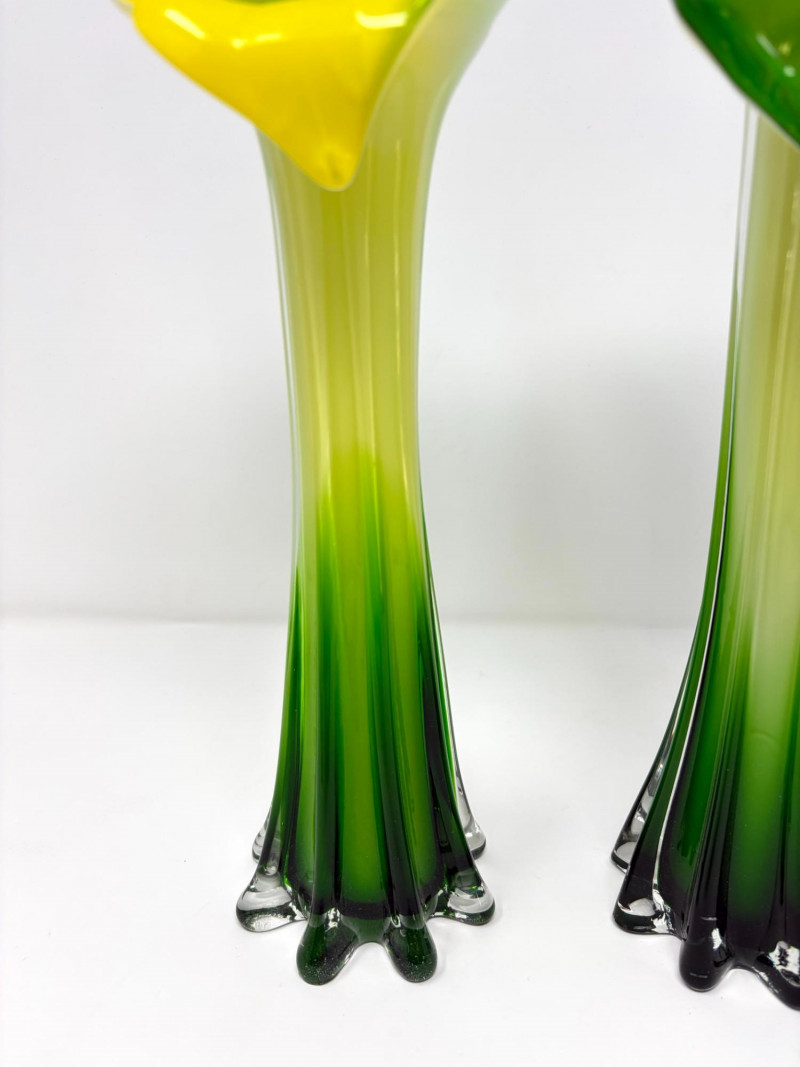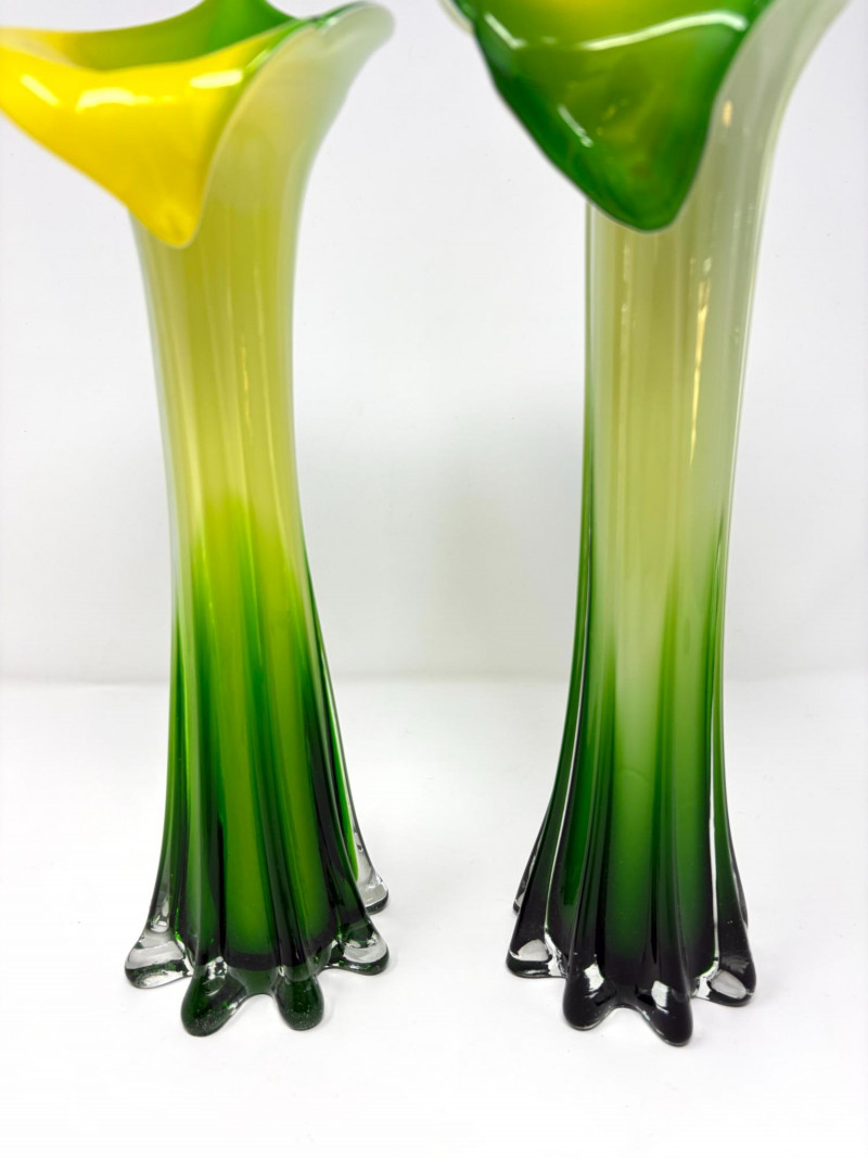 Lot # 29 - Pair Hand-Blown Art Glass Calla Lily Trumpet Vases Green & Yellow
