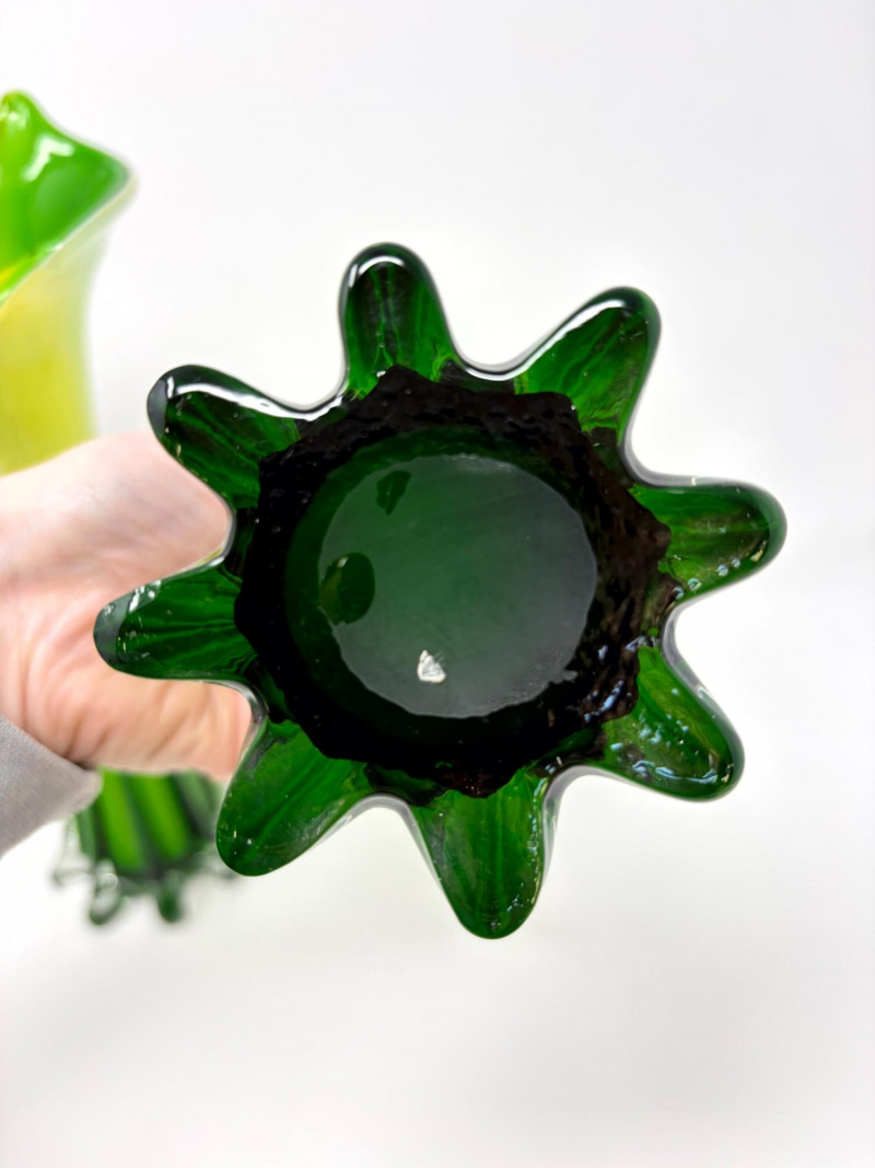 Pair Hand-Blown Art Glass Calla Lily Trumpet Vases Green & Yellow.