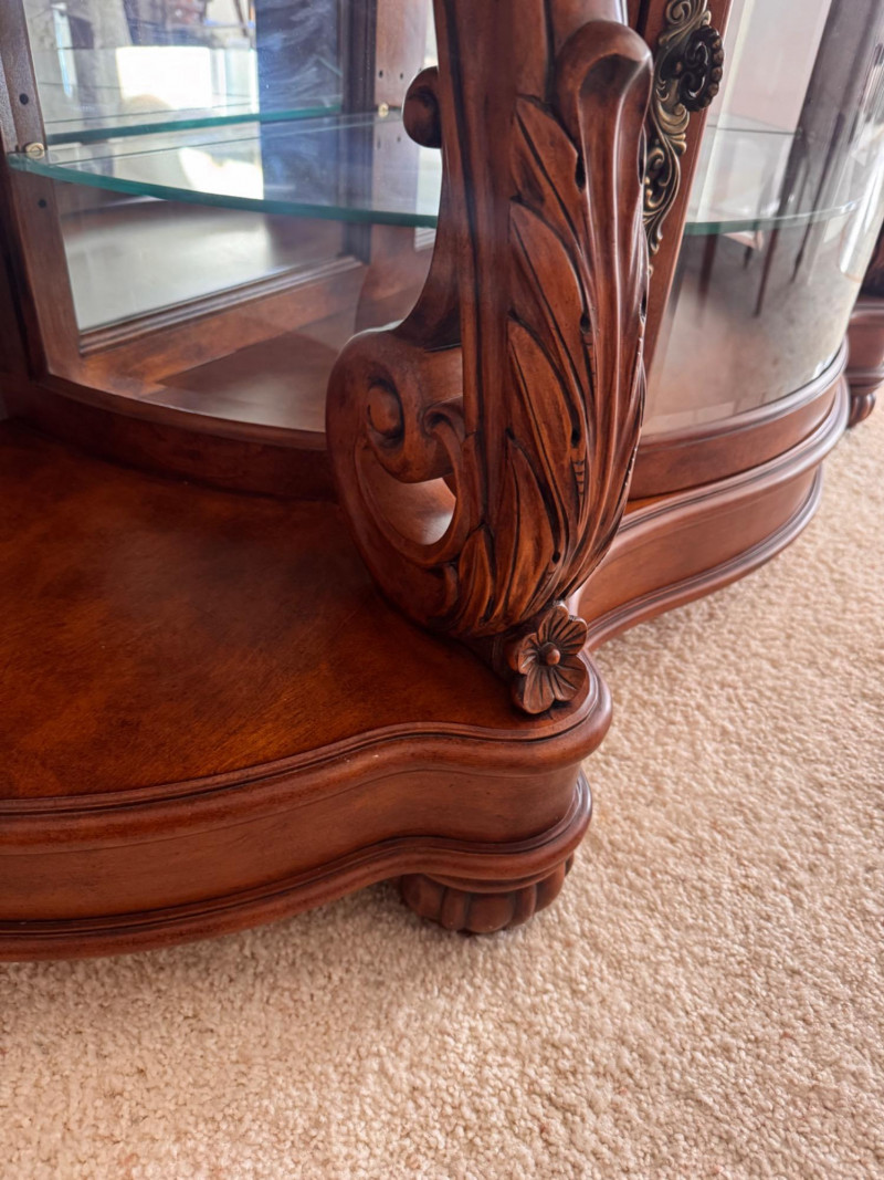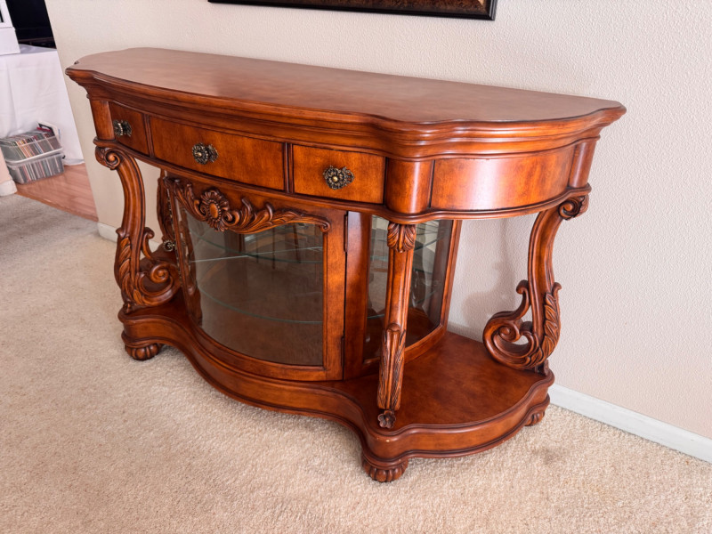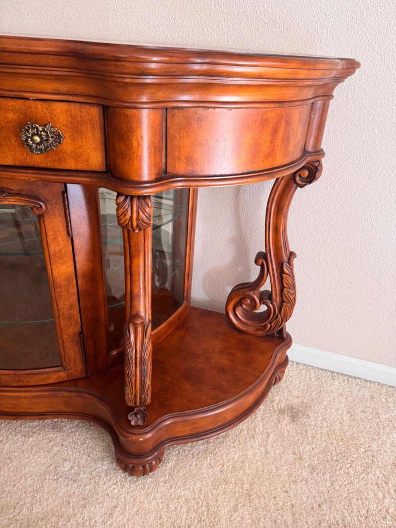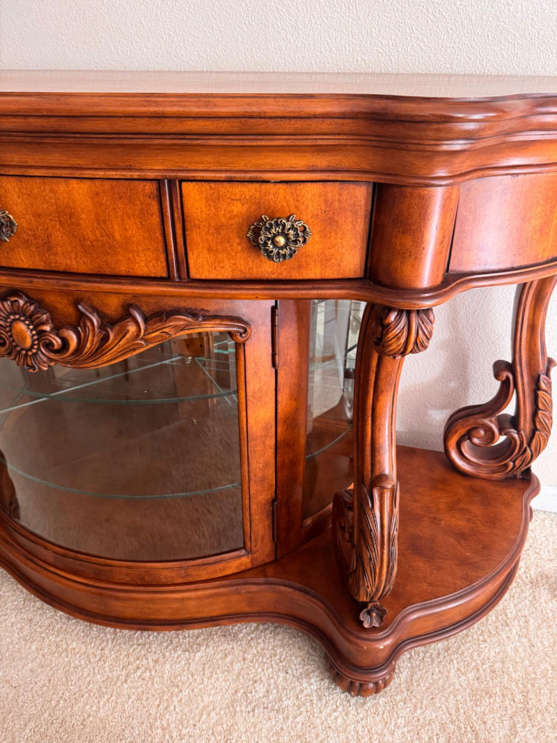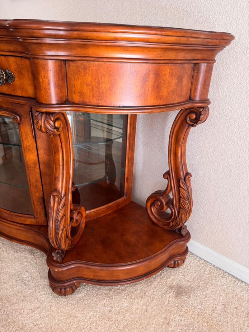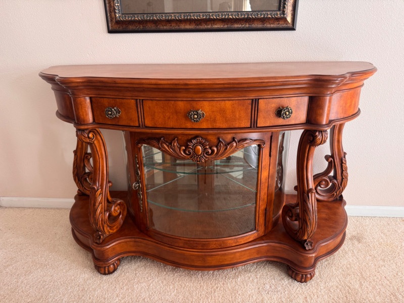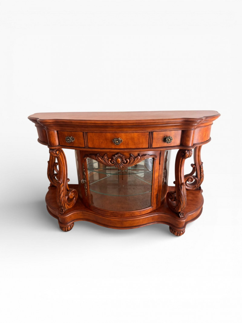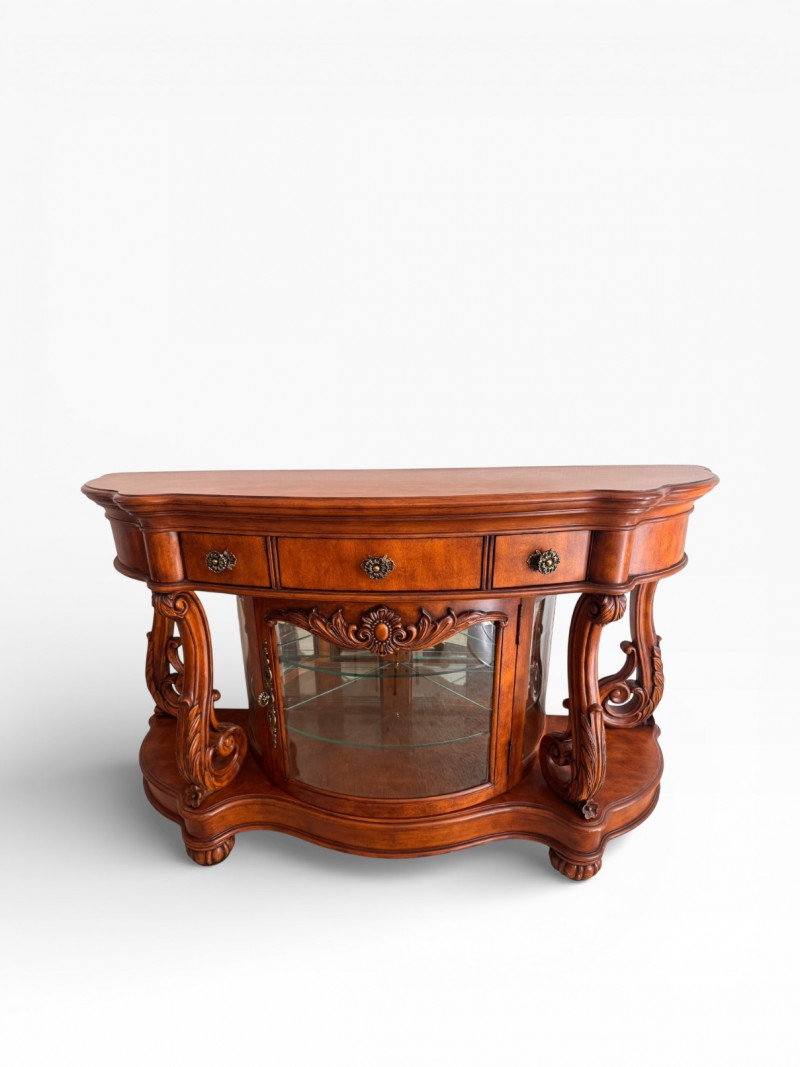 Ornate Carved Wood Buffet w/ Curved Glass Door & Shelves.